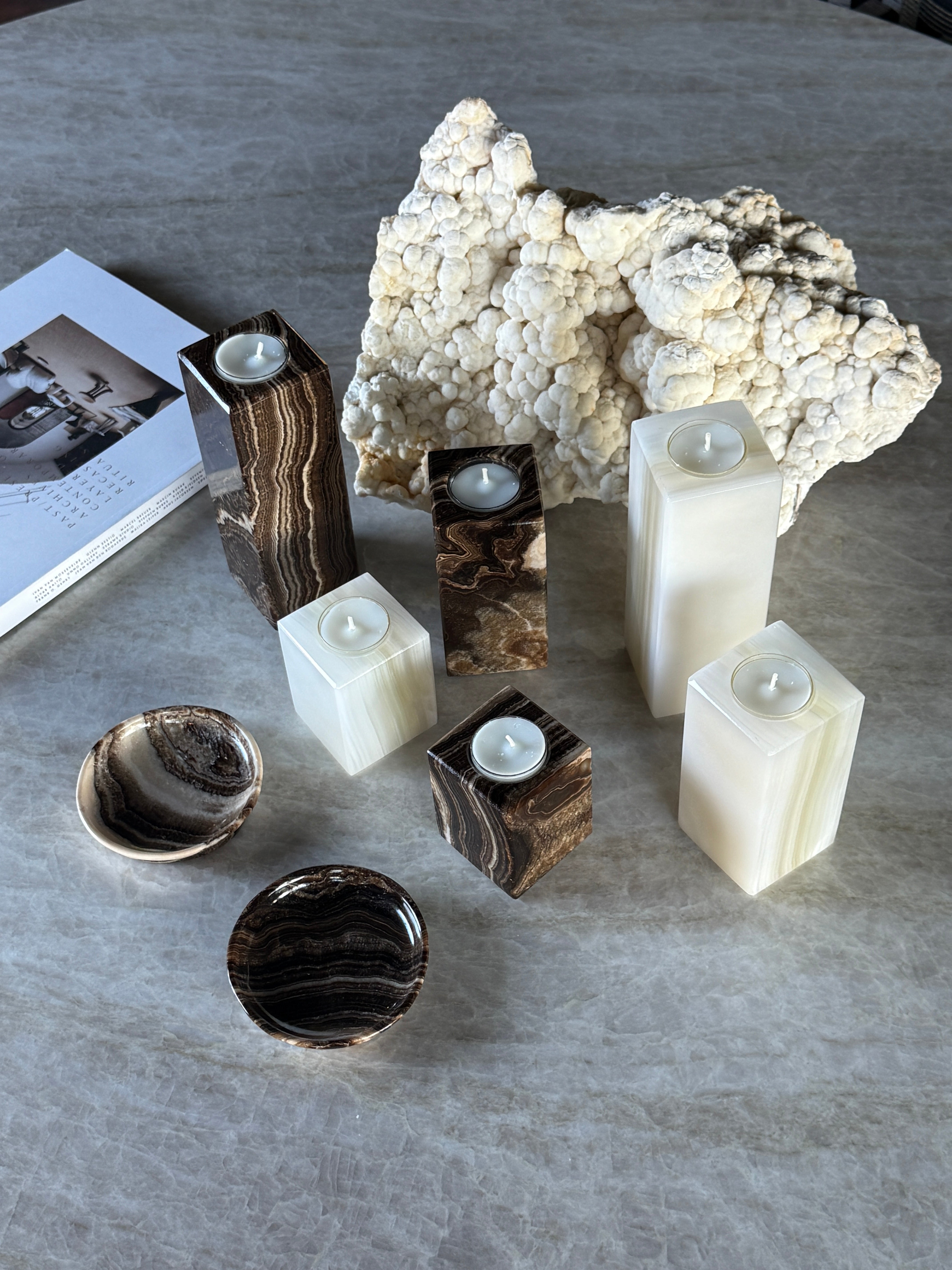 Onyx er et naturmateriale, og hver telysholder er unik. Farge og mønster vil variere noe.