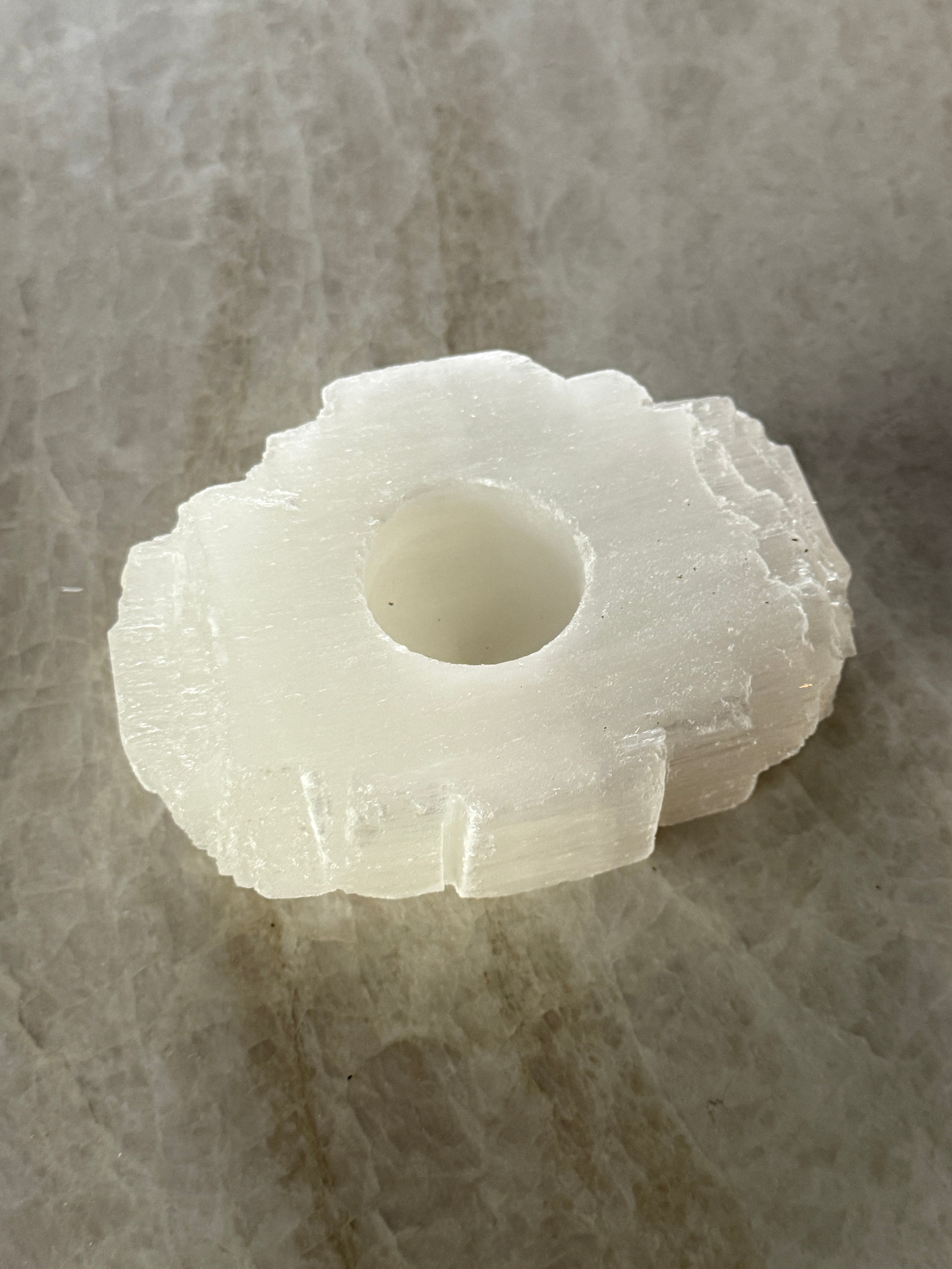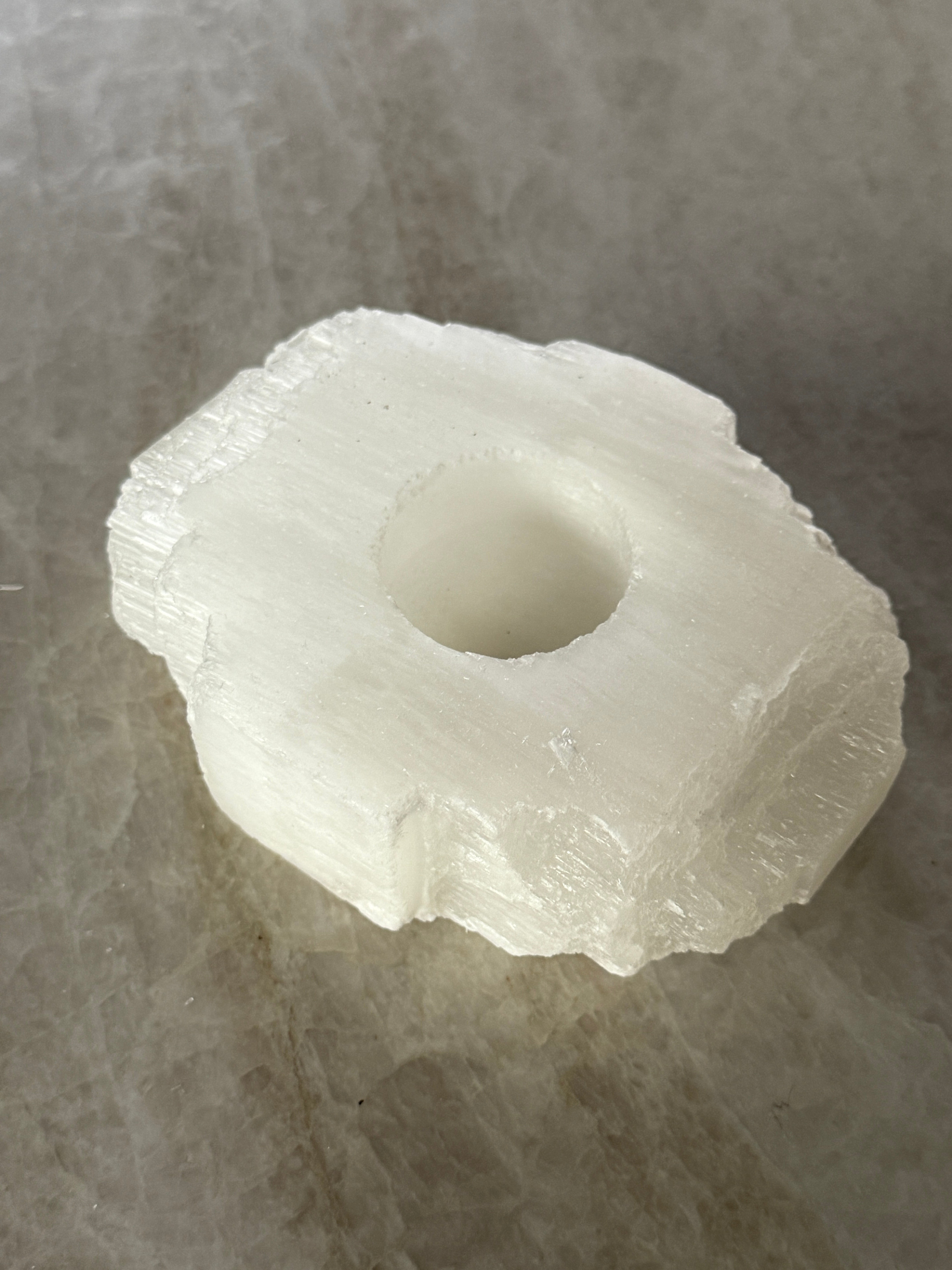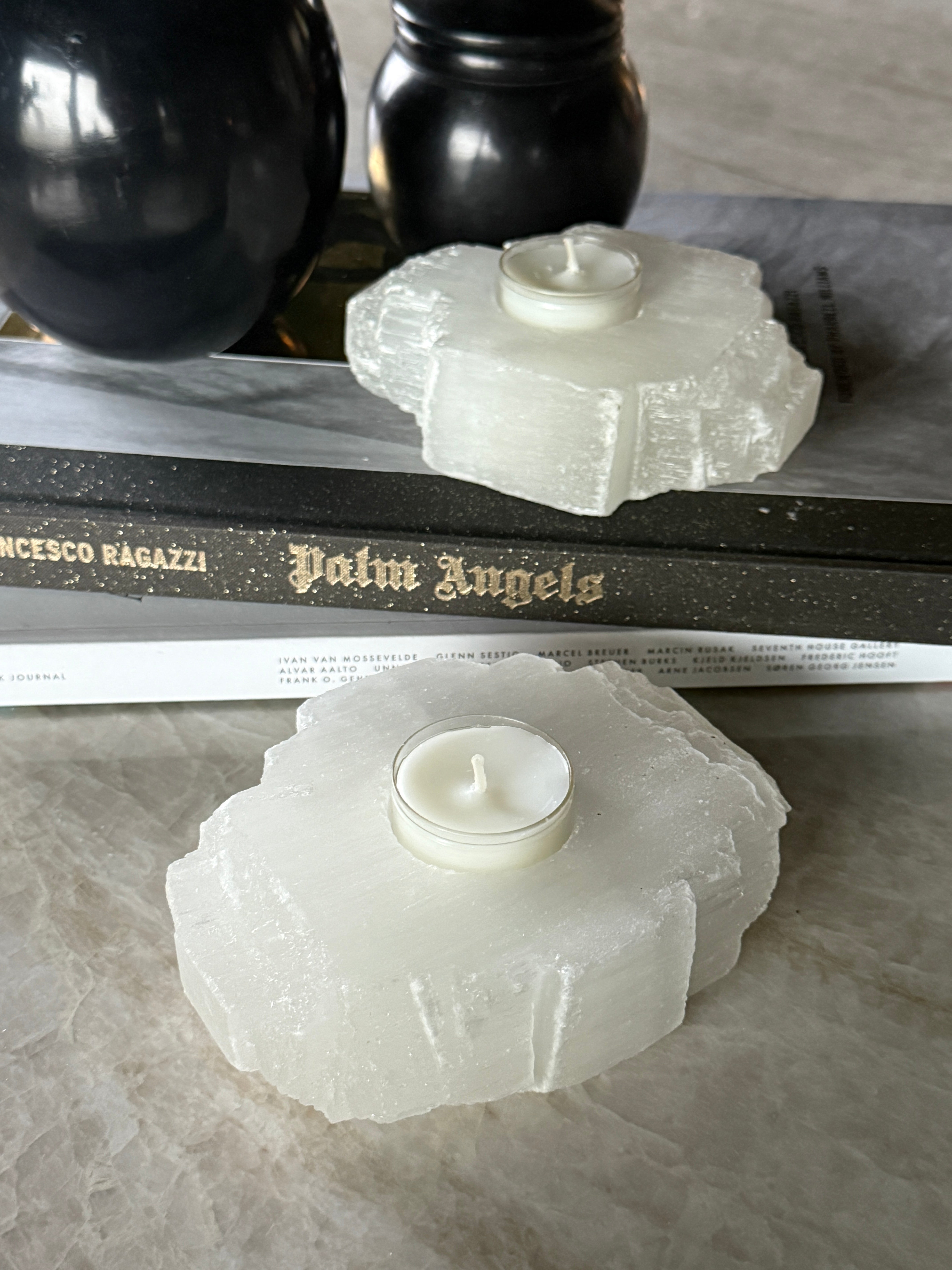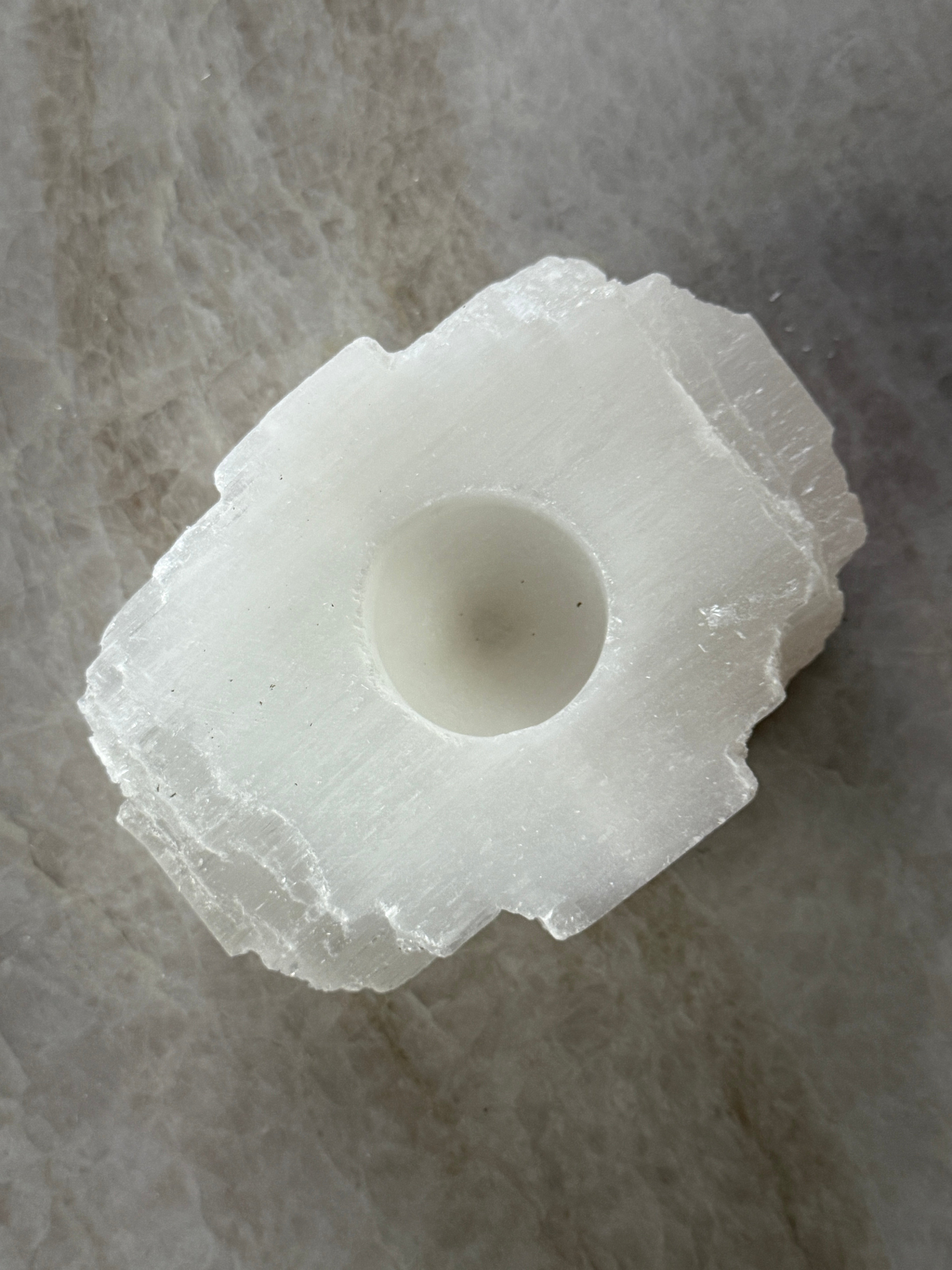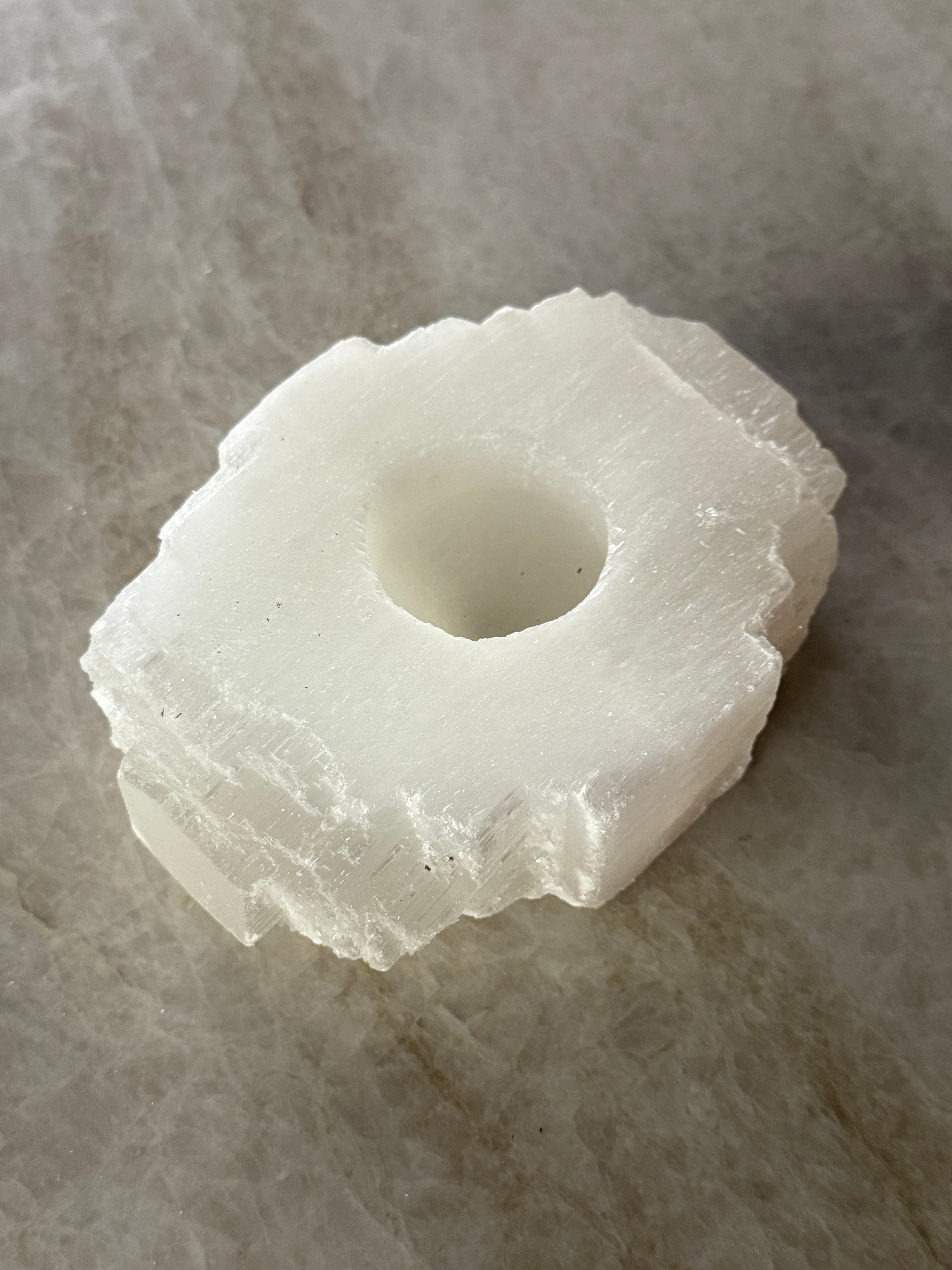 Unik telysholder i hvit selenitt! Hver og en er helt unik og setter prikken over i´en i en hver stue! Gir veldig god stemning med en tent telys samtidig som det er et dekorelement i seg selv når den ikke er i bruk.