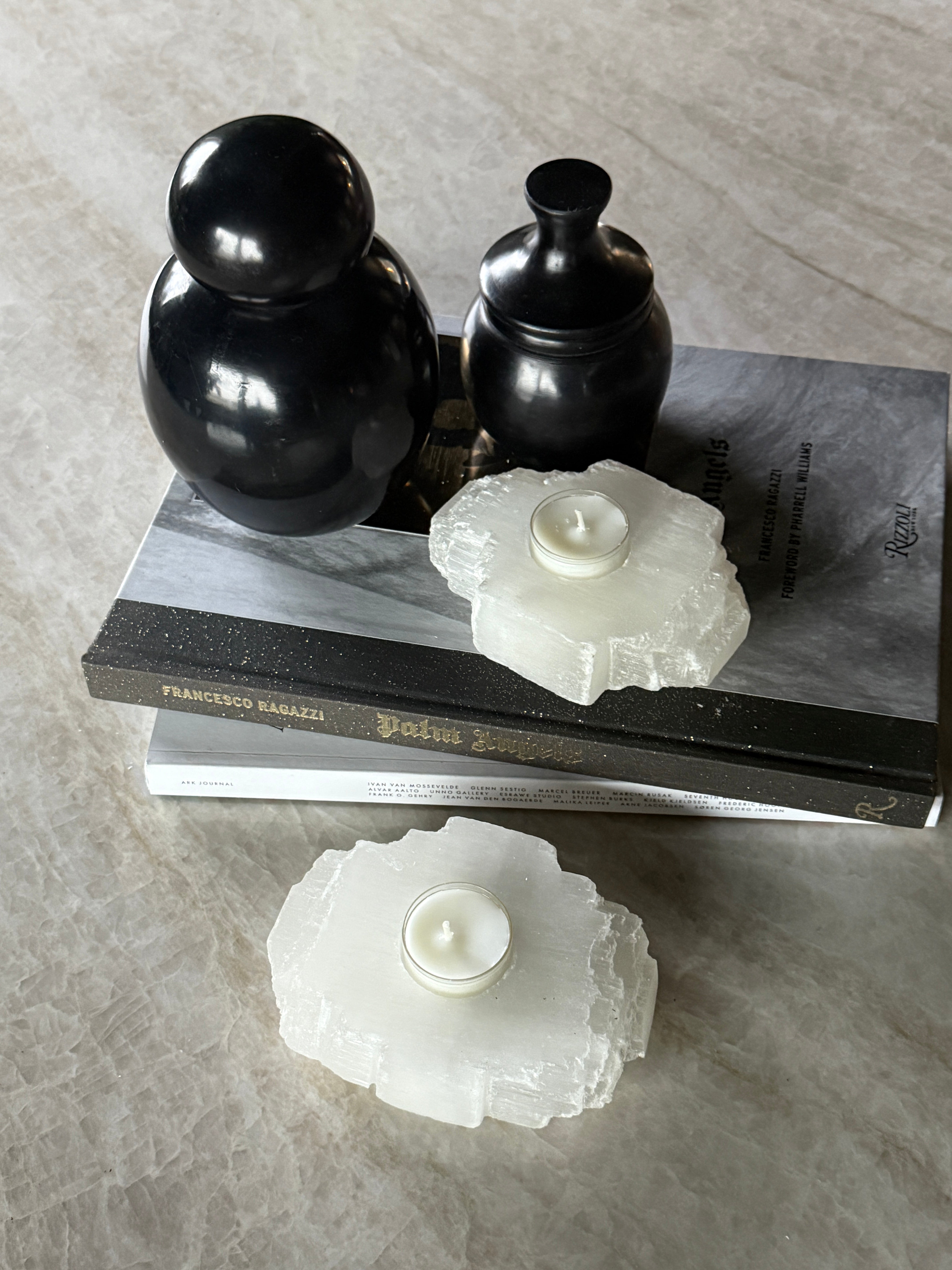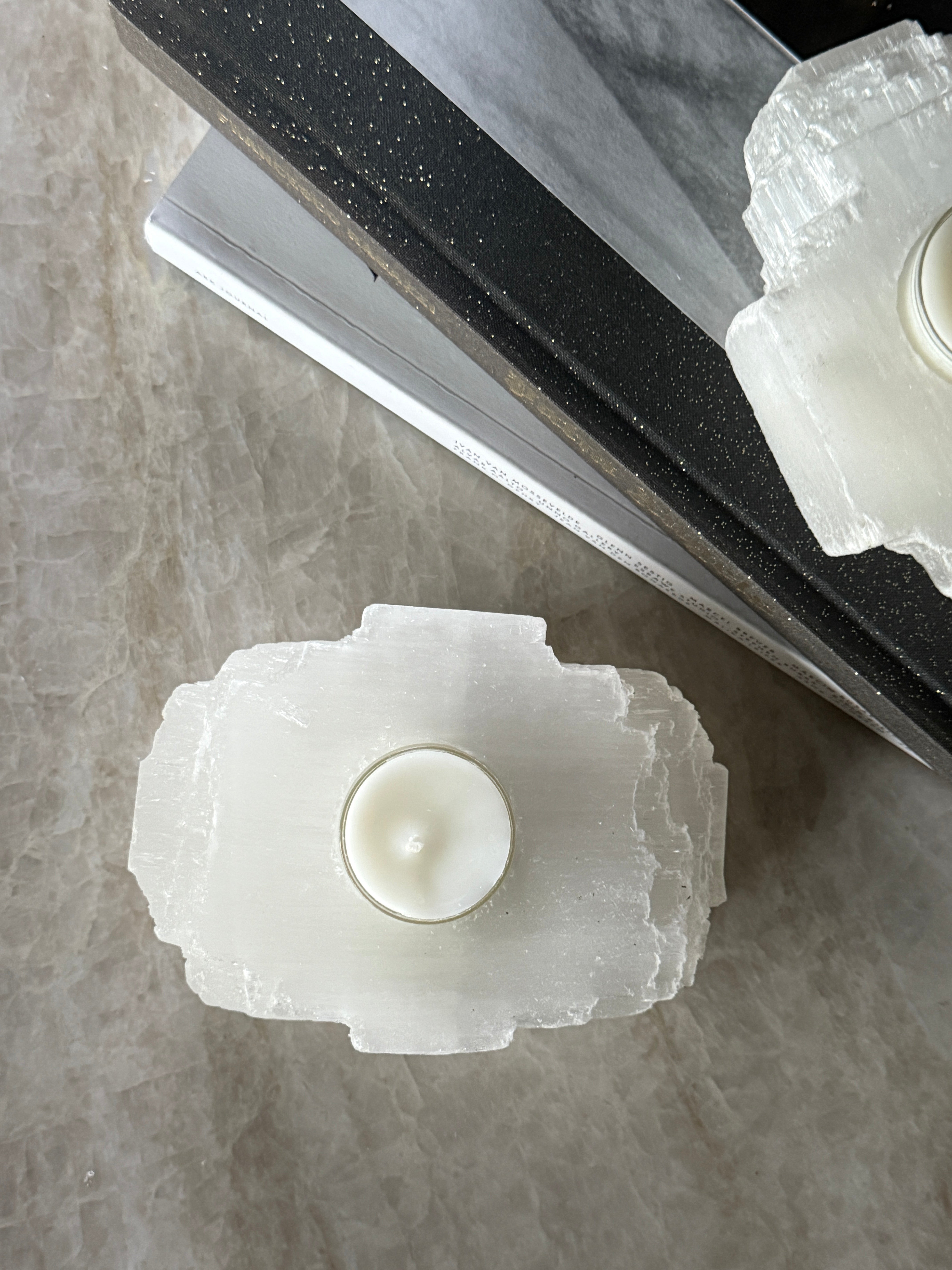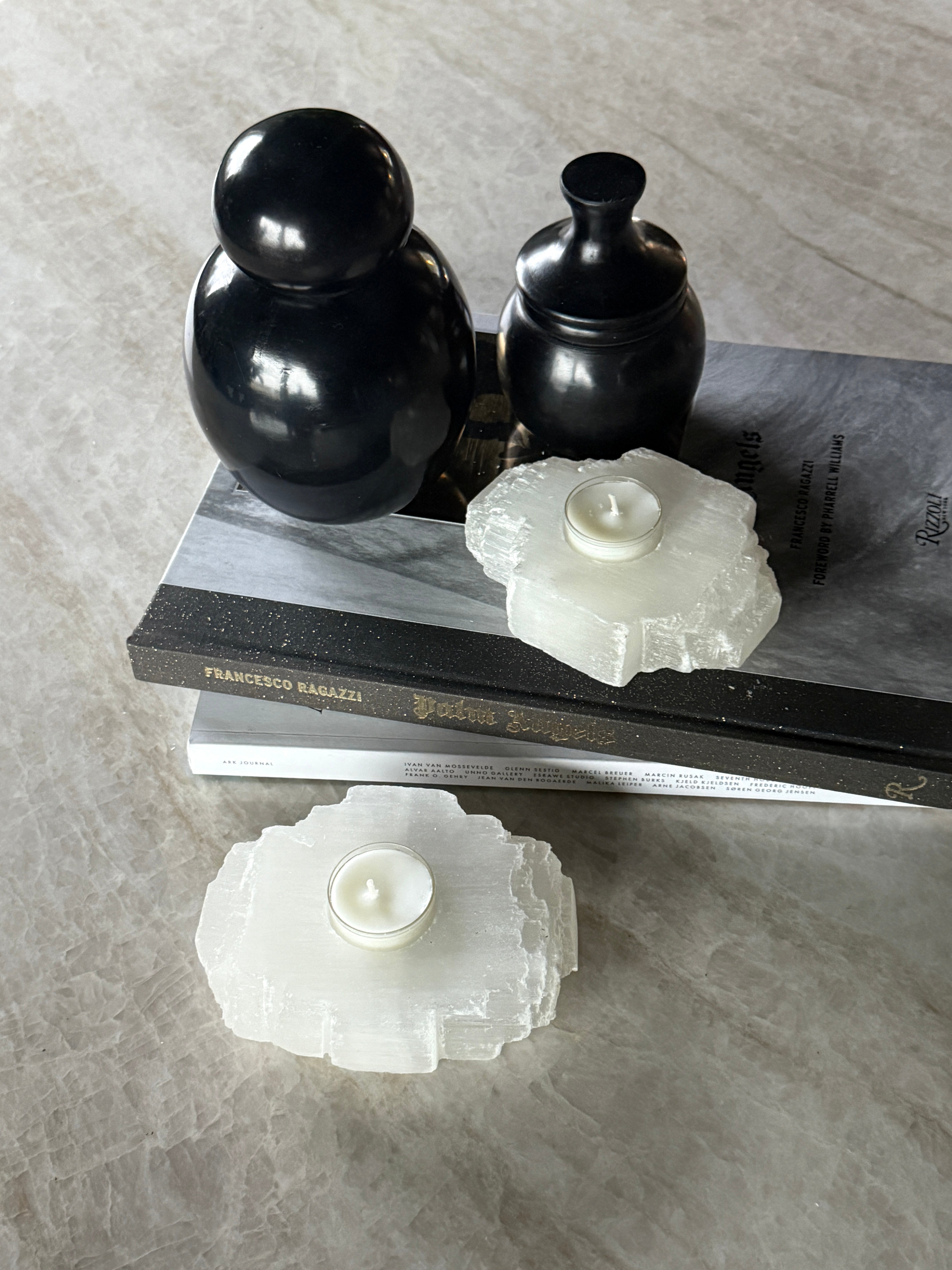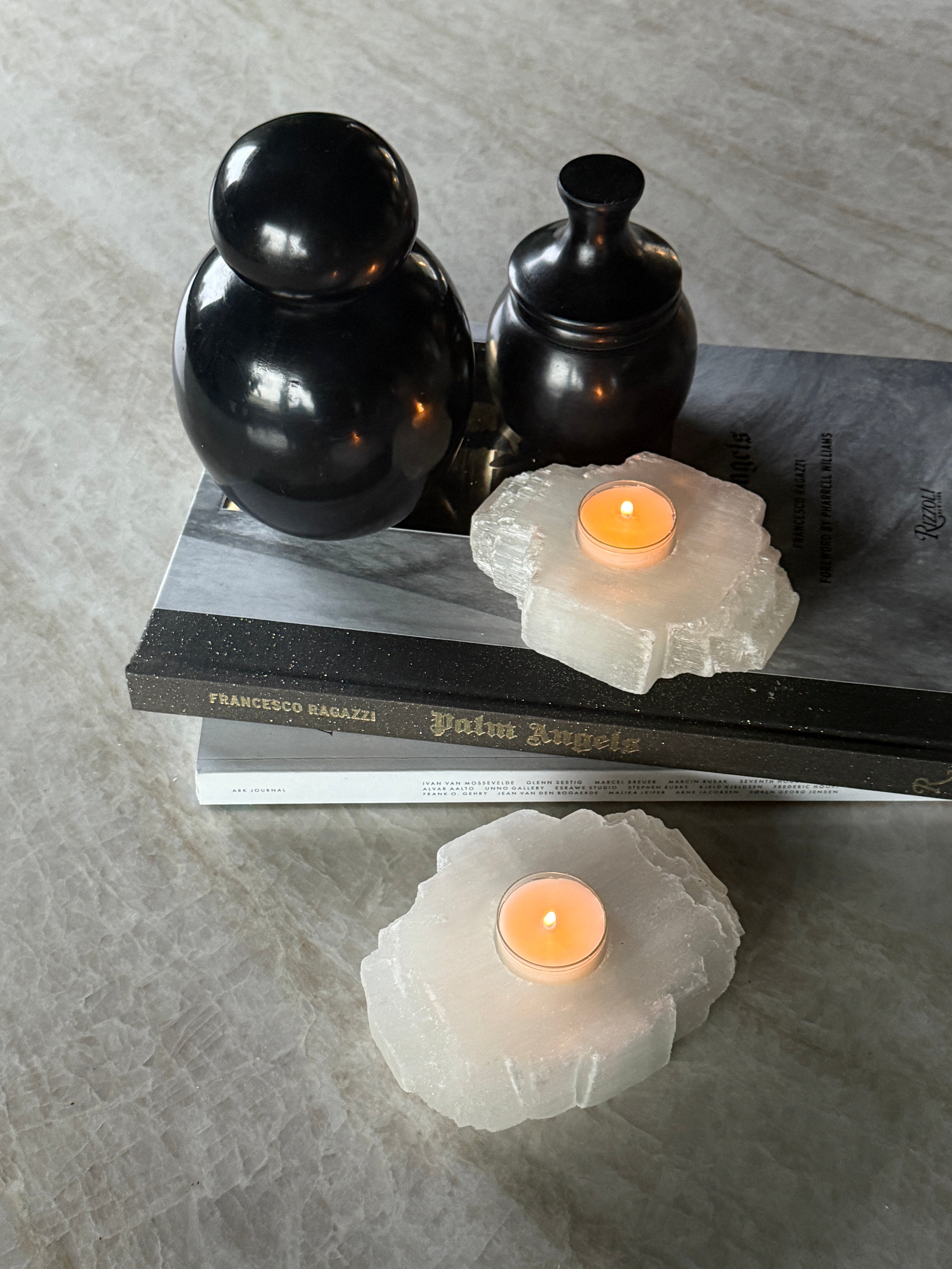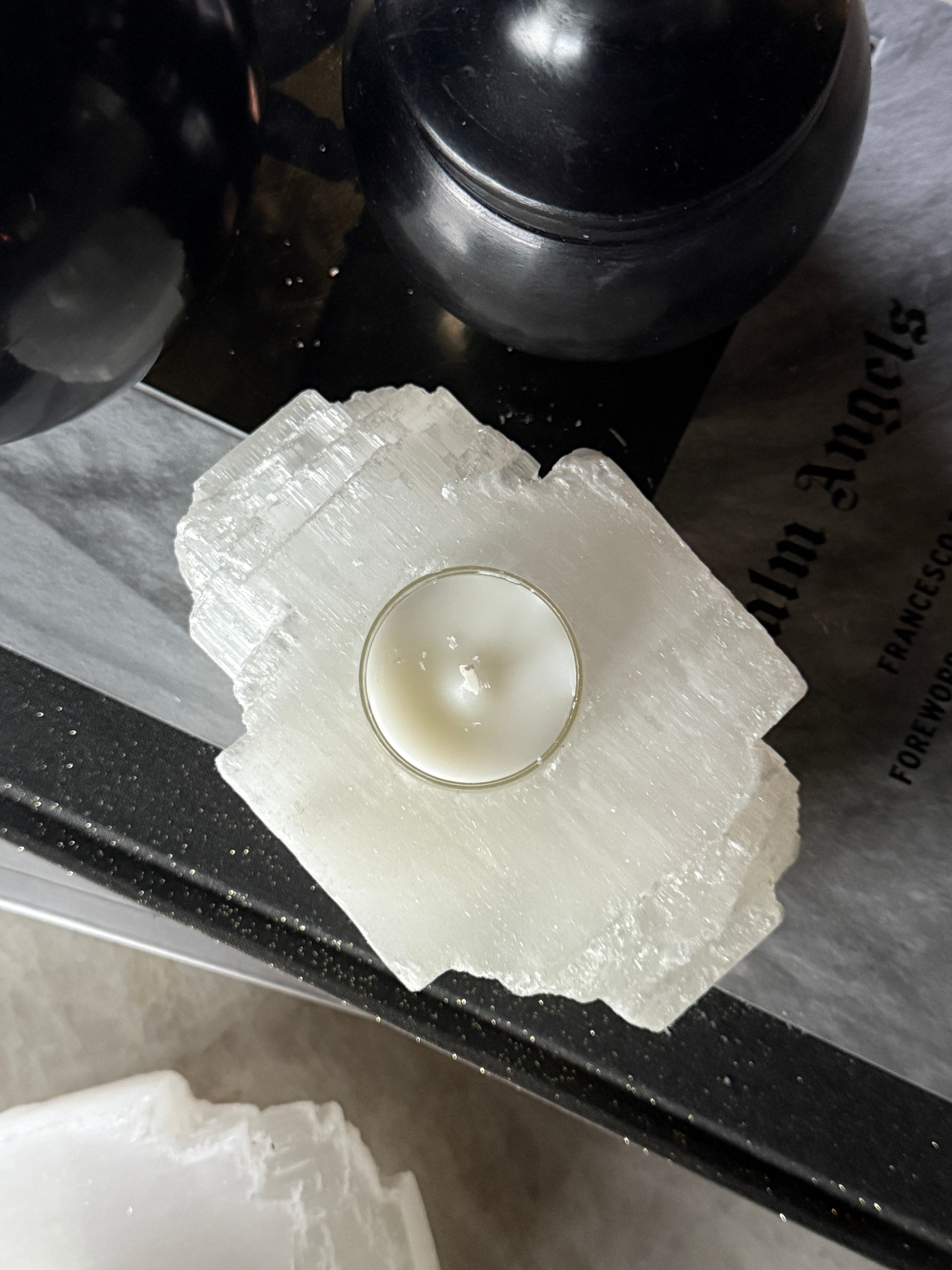 Unik telysholder i hvit selenitt! Hver og en er helt unik og setter prikken over i´en i en hver stue! Gir veldig god stemning med en tent telys samtidig som det er et dekorelement i seg selv når den ikke er i bruk.