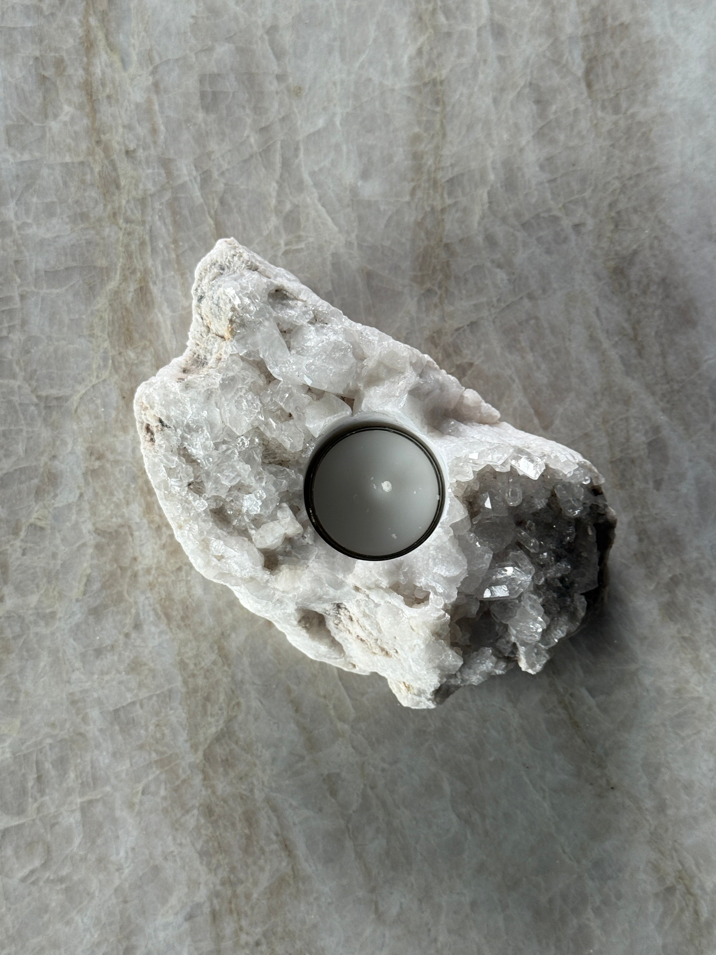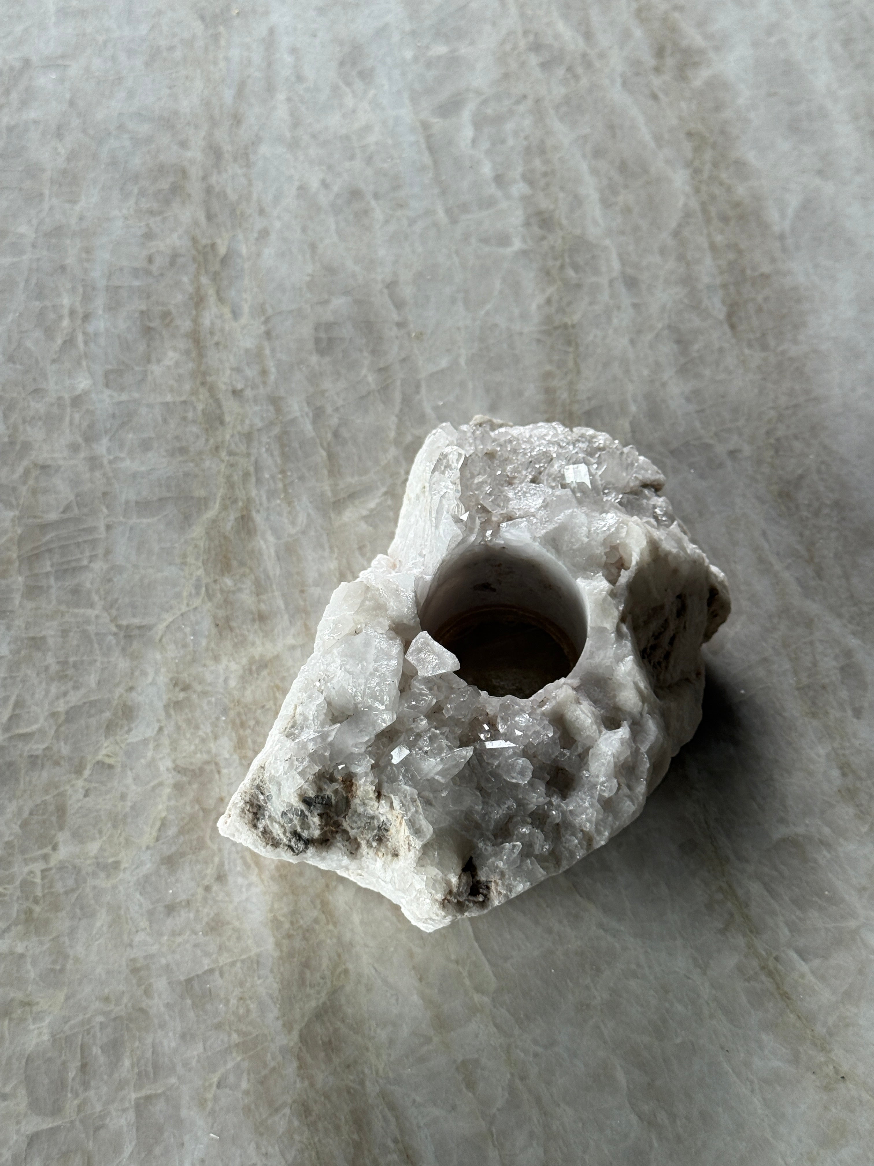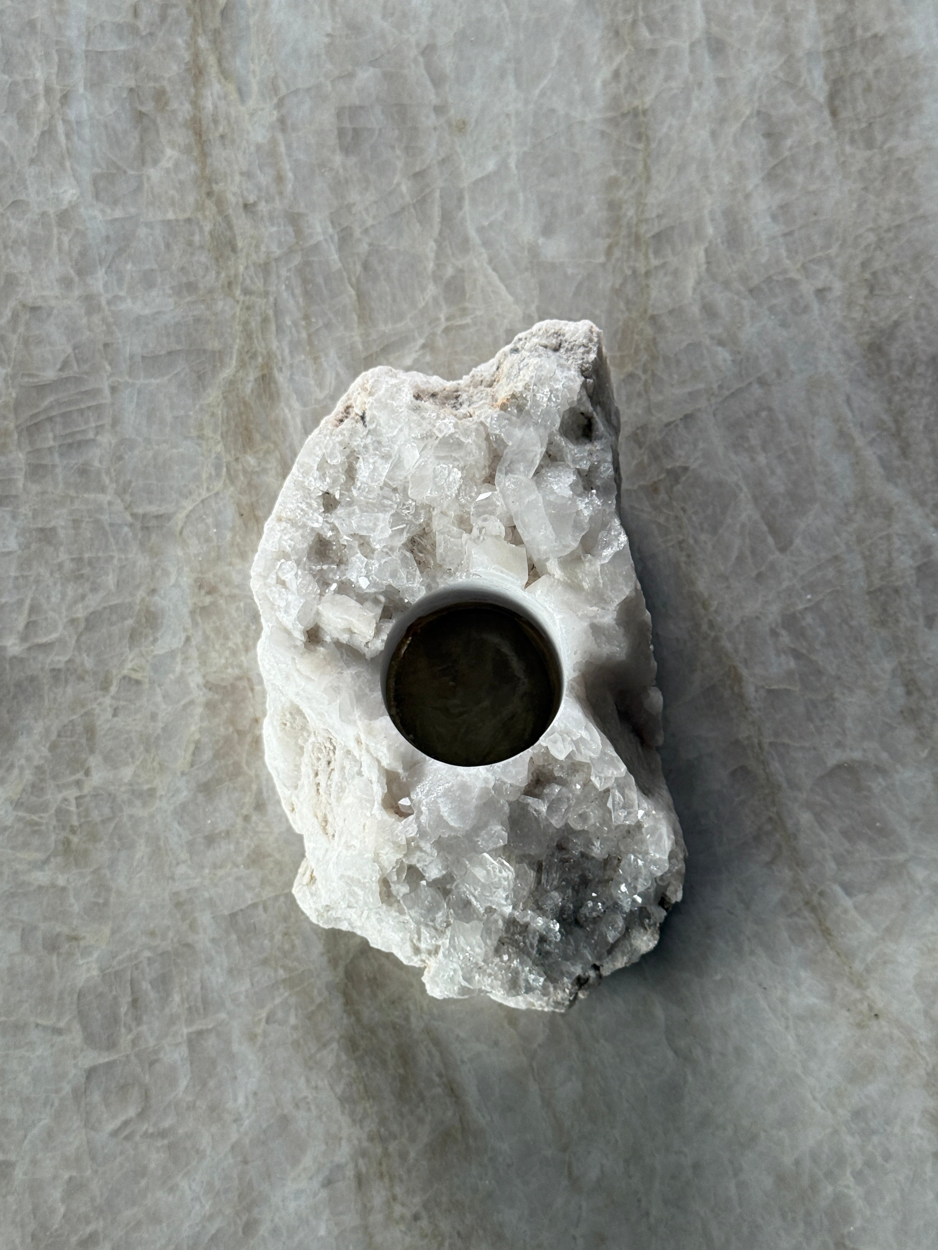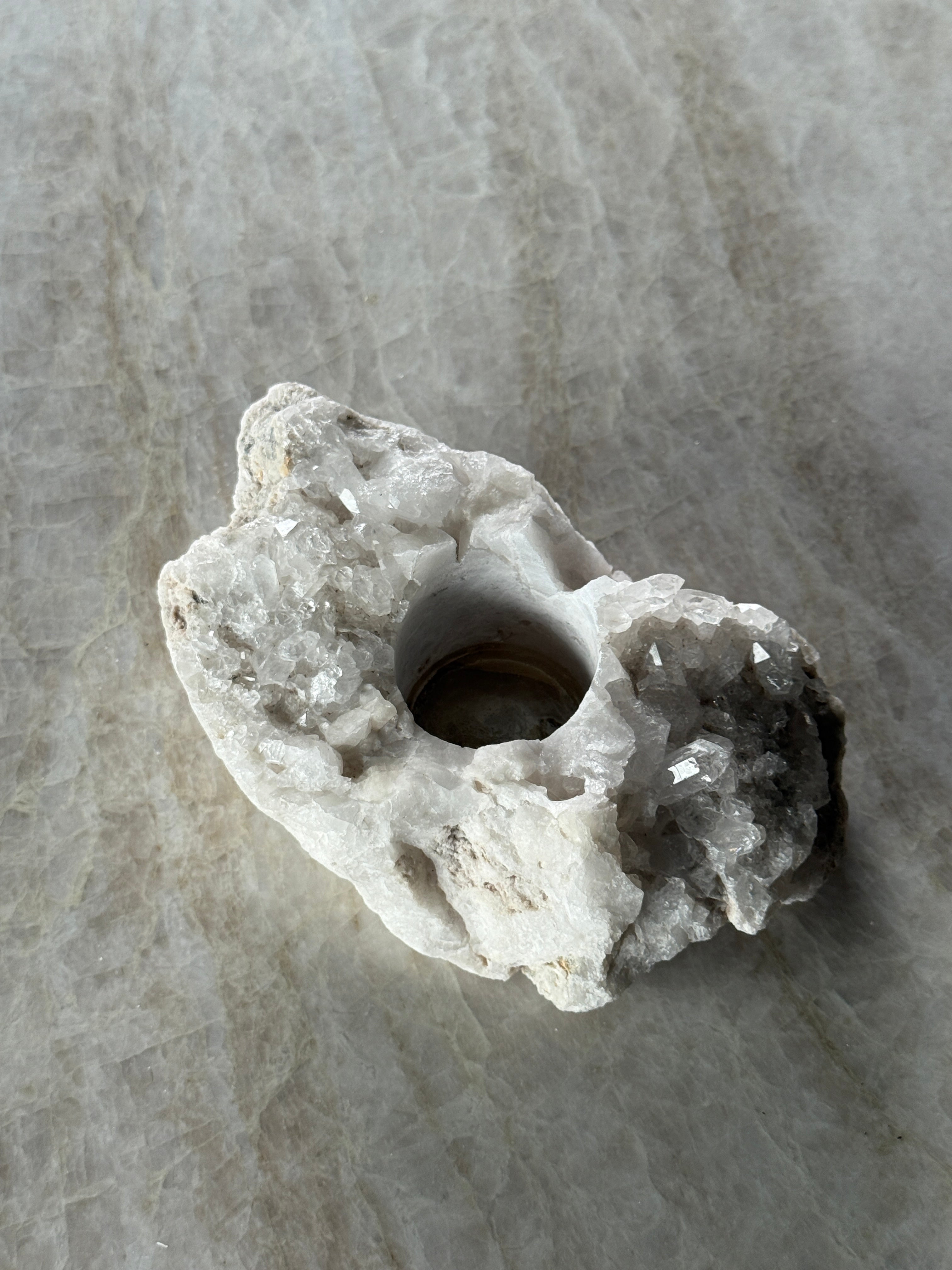 Unik telysholder i kvarts krystall! Hver og en er helt unik og setter prikken over i´en i en hver stue! Gir veldig god stemning med en tent telys samtidig som det er et dekorelement i seg selv når den ikke er i bruk.
