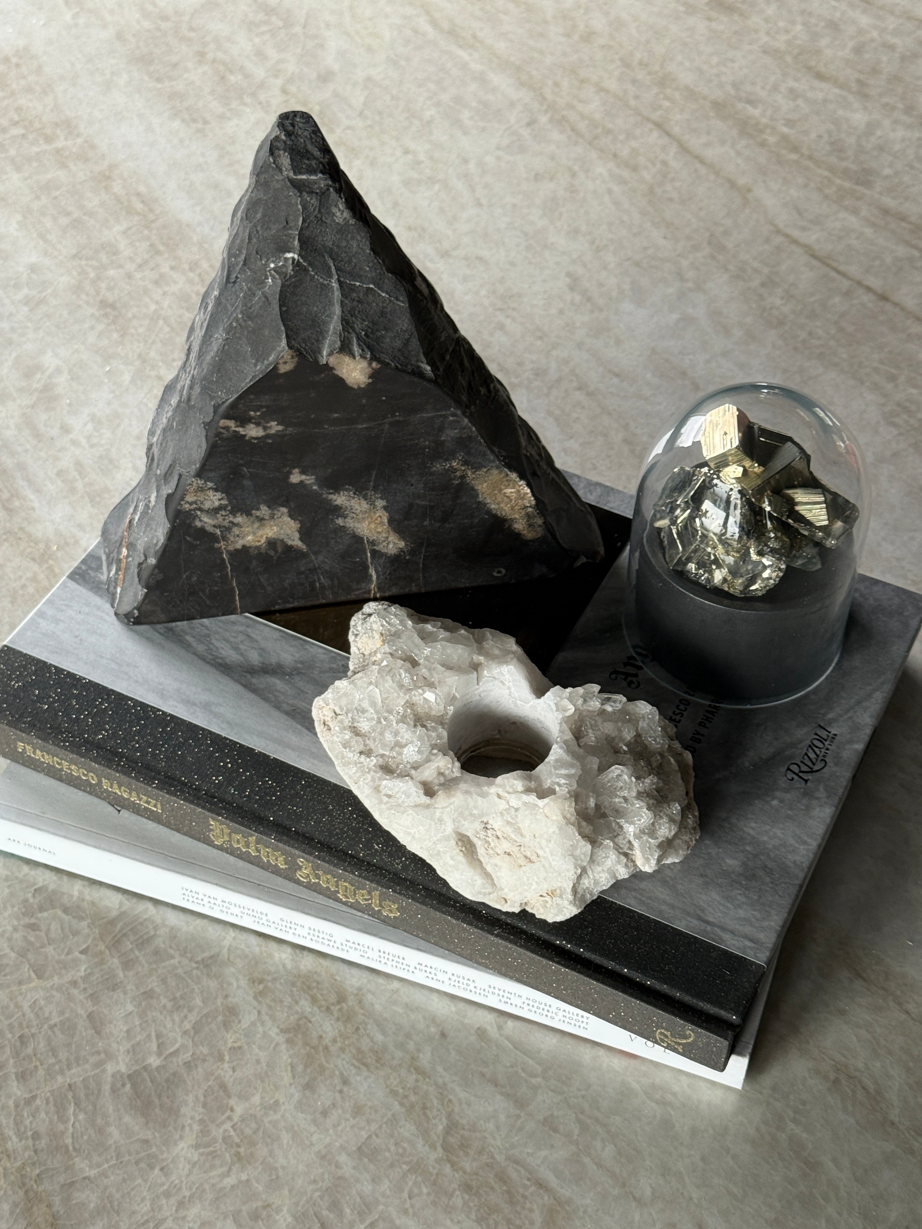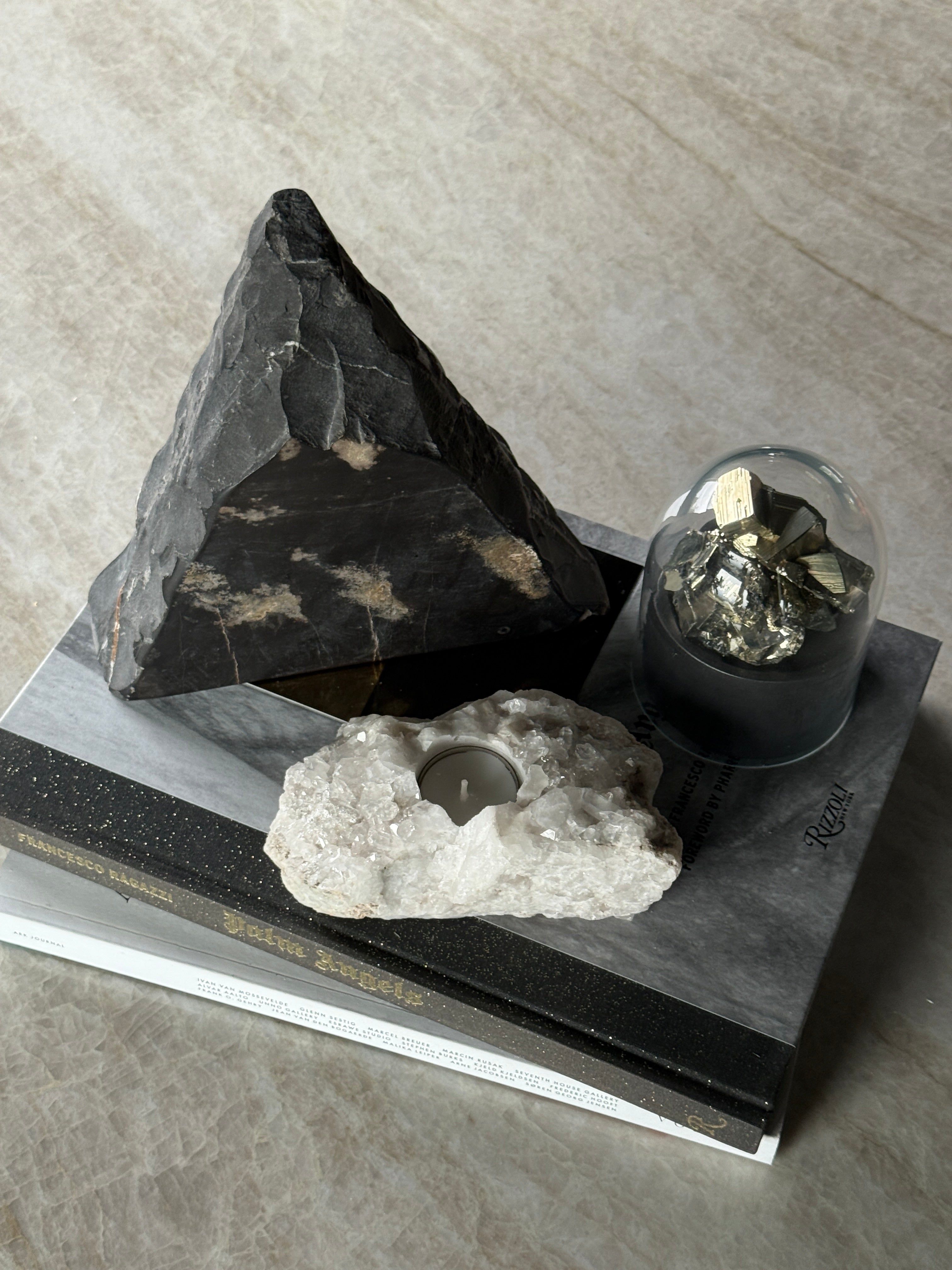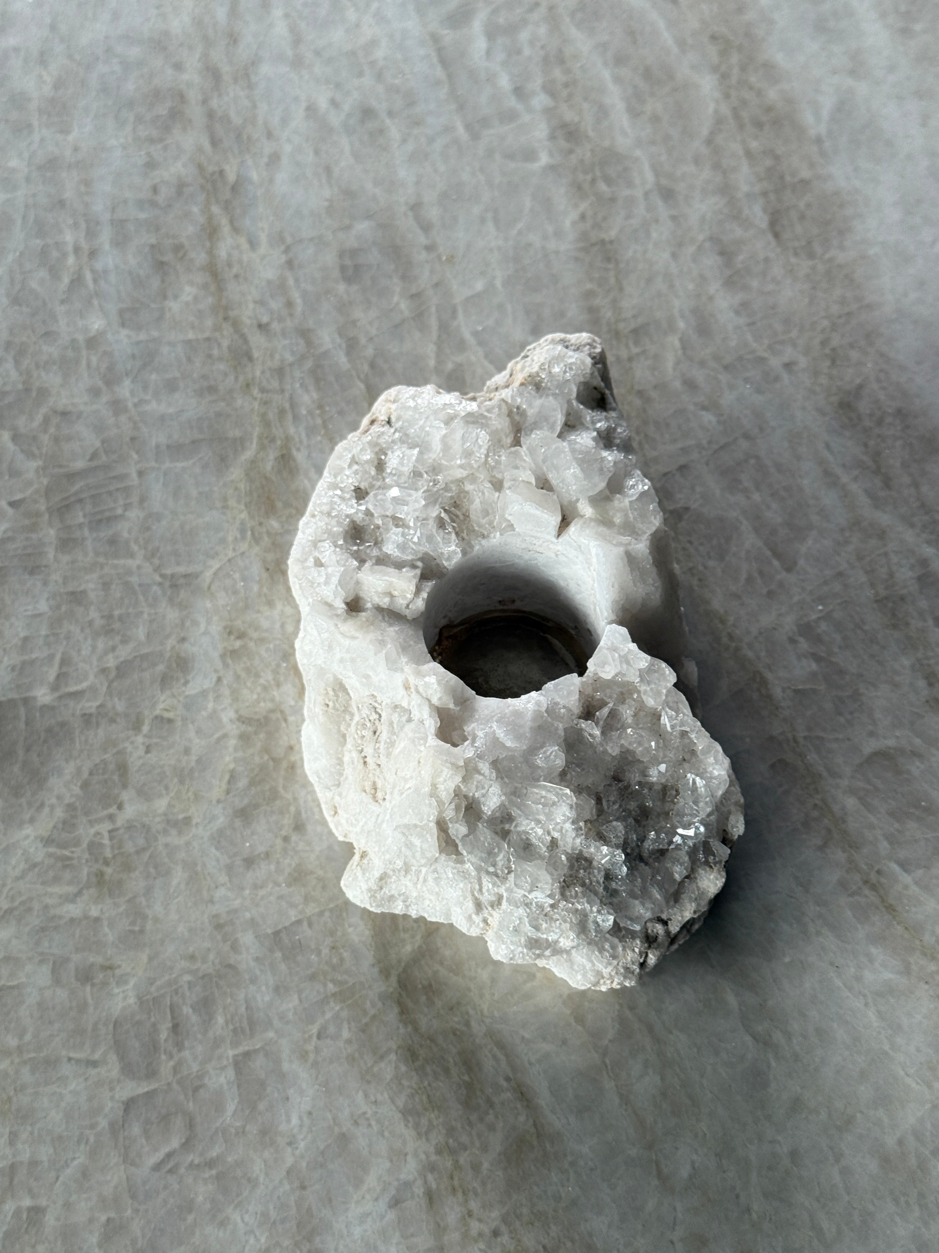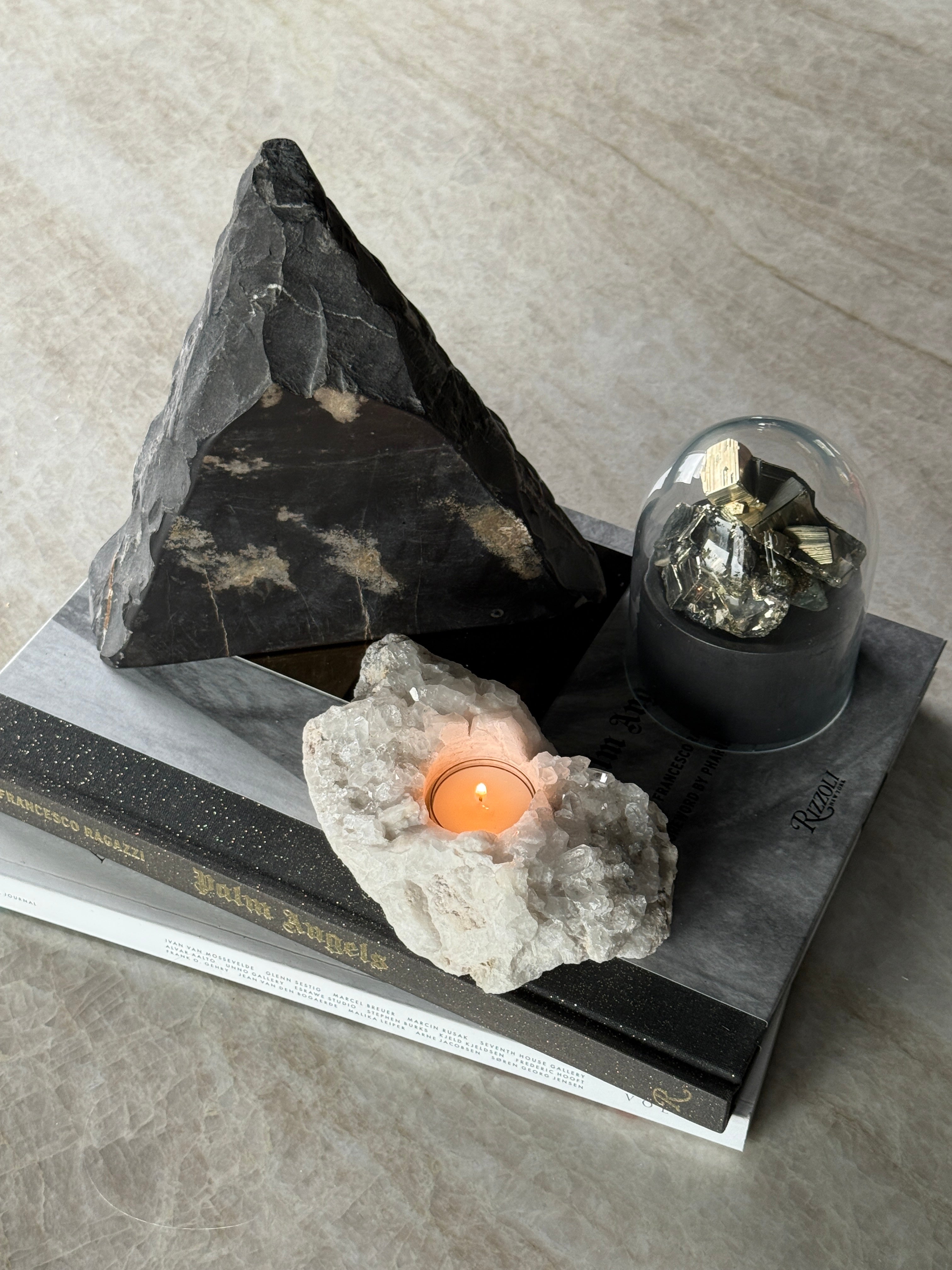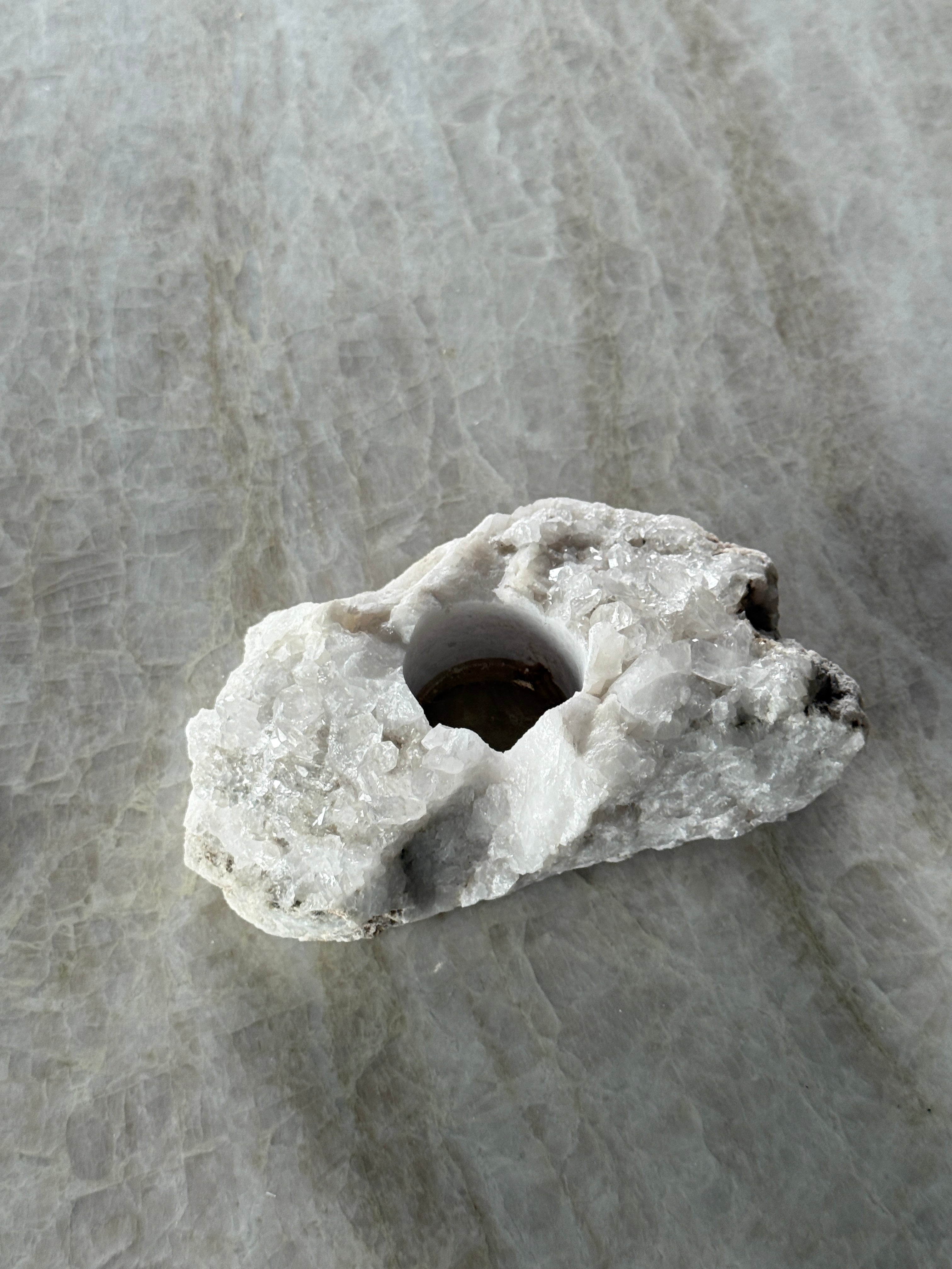 Unik telysholder i kvarts krystall! Hver og en er helt unik og setter prikken over i´en i en hver stue! Gir veldig god stemning med en tent telys samtidig som det er et dekorelement i seg selv når den ikke er i bruk.