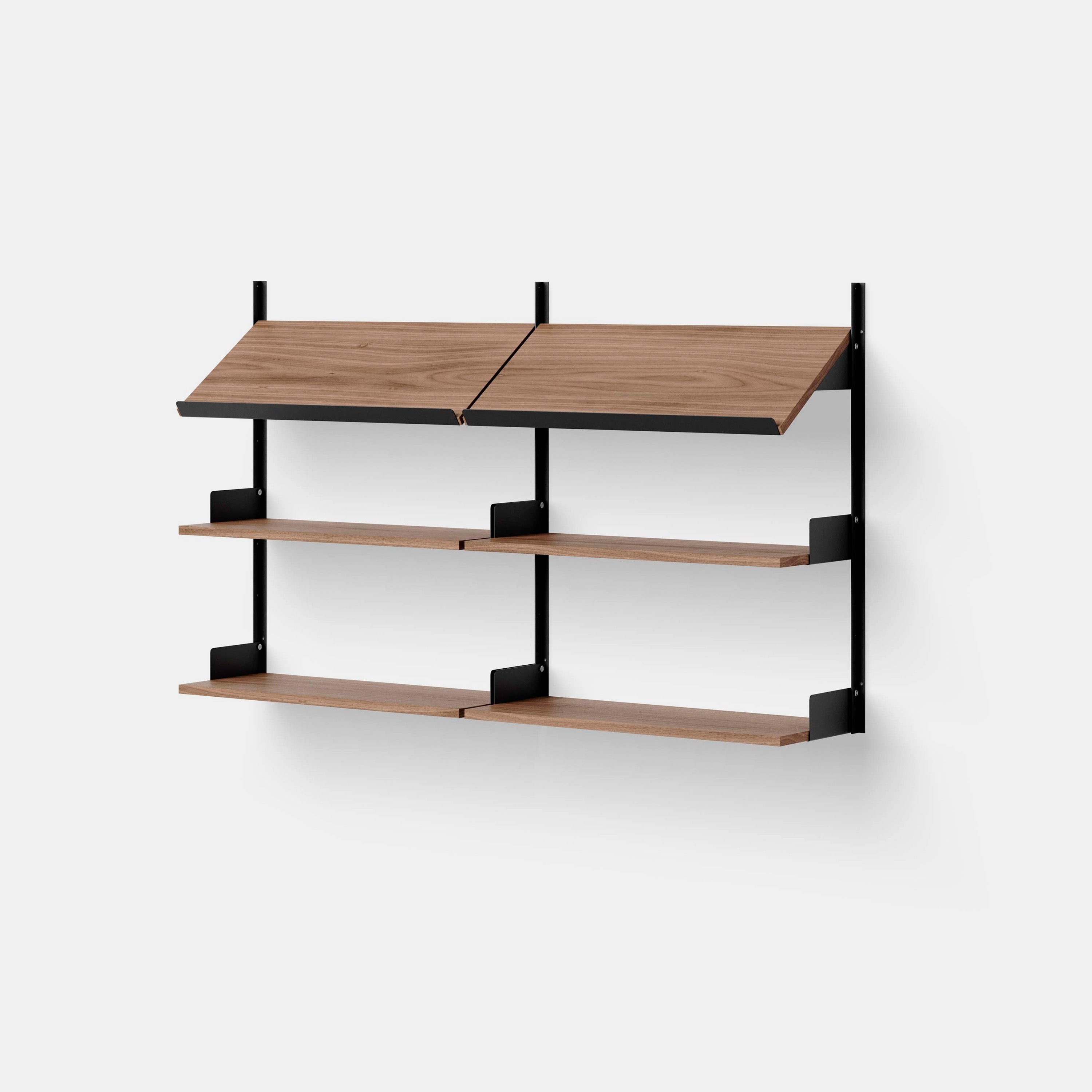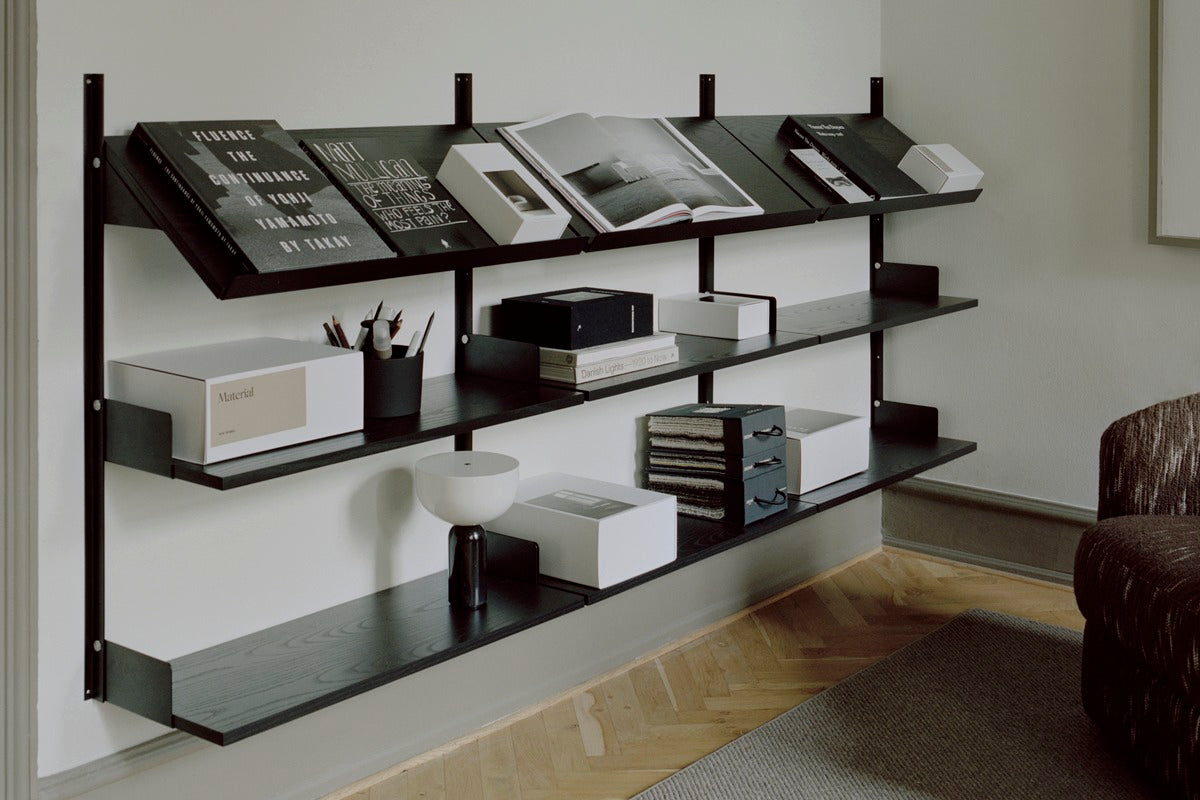 Noen ganger viser det seg at de enkleste møblene er de vanskeligste å finne – for eksempel den perfekte vegghyllen. Med diskrete detaljer og ukomplisert fleksibilitet, har New Works hyllesystem som mål å være nettopp det. Det enkle hyllesystemet er designet for å enkelt blande seg inn i forskjellige rom.  Ingenting er overflødig og alt er nøye gjennomtenkt, fra de kantede profilene på veggskinnene til de integrerte bokstøttene som holder eiendelene dine på plass. Hyllene er satt sammen med flate tommeskruer i rustfritt stål, som tilfører en ærlig og gjennomtenkt detalj til designet. Et system som er ment å vokse – i hjemmet og som en samling – for å møte ulike oppbevaringsbehov.