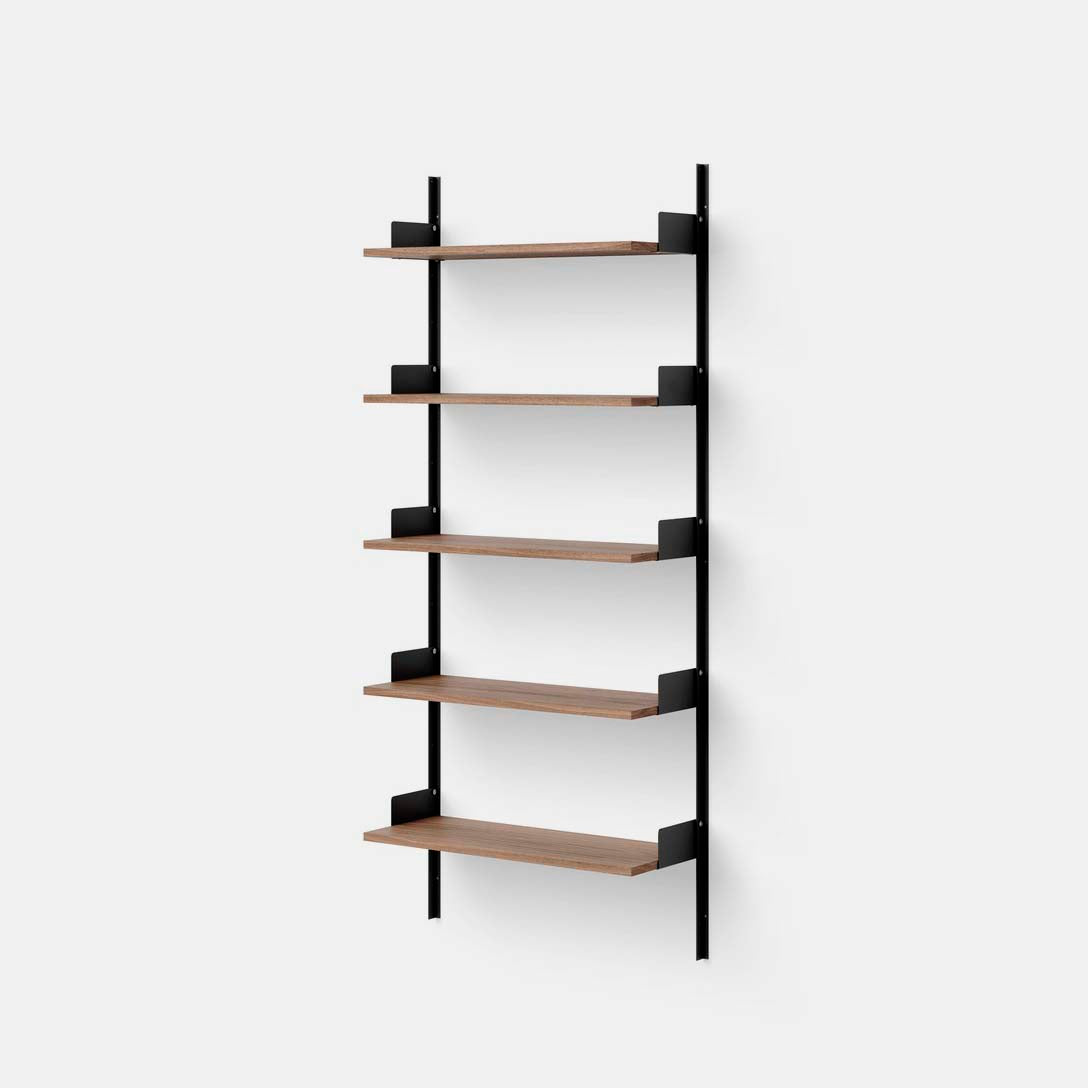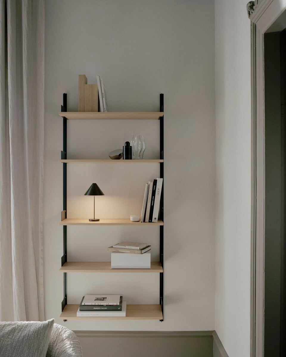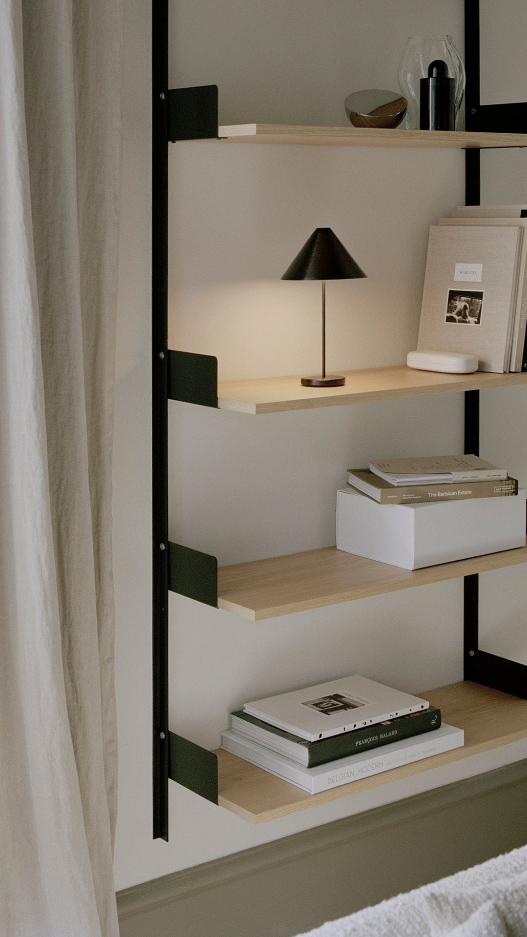 Noen ganger viser det seg at de enkleste møblene er de vanskeligste å finne – for eksempel den perfekte vegghyllen. Med diskrete detaljer og ukomplisert fleksibilitet, har New Works hyllesystem som mål å være nettopp det. Det enkle hyllesystemet er designet for å enkelt blande seg inn i forskjellige rom. Ingenting er overflødig og alt er nøye gjennomtenkt, fra de kantede profilene på veggskinnene til de integrerte bokstøttene som holder eiendelene dine på plass. Hyllene er satt sammen med flate tommeskruer i rustfritt stål, som tilfører en ærlig og gjennomtenkt detalj til designet. Et system som er ment å vokse – i hjemmet og som en samling – for å møte ulike oppbevaringsbehov.