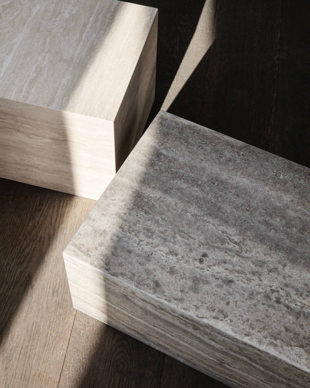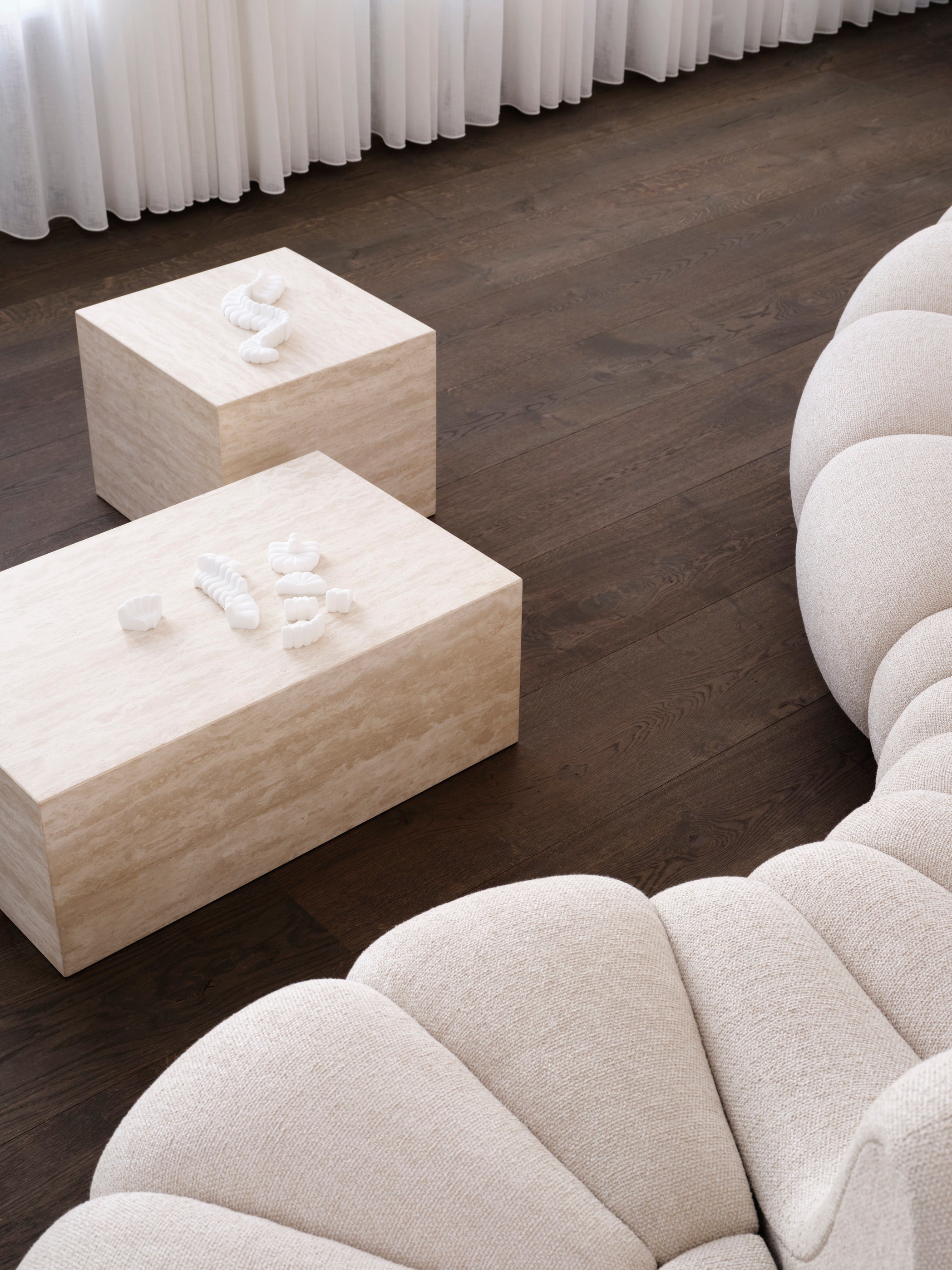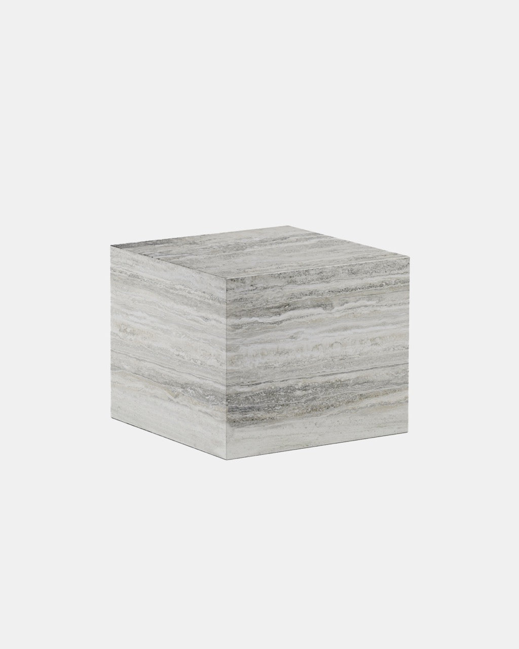 Laget av travertinstein handler dette bordet om å omfavne kvalitetene og skjønnheten til materialet, som i århundrer har blitt brukt i klassisk arkitektur over hele verden. Natursteinen har en uregelmessig overflate med små hull og ufullkommenheter, noe som tilfører en taktil kvalitet til den geometriske formen.