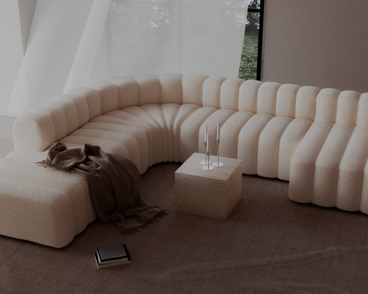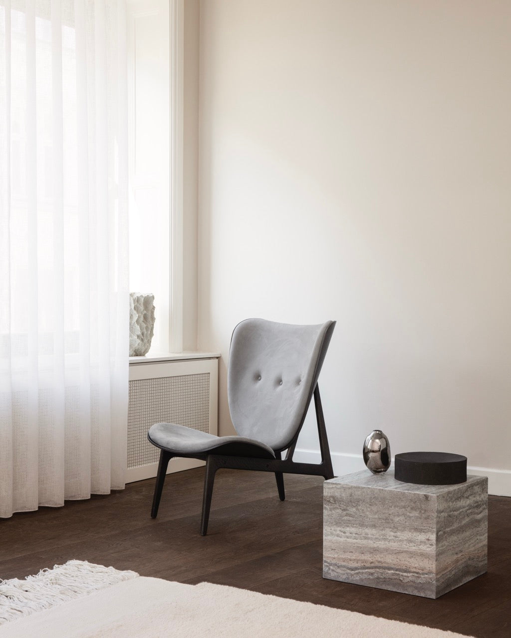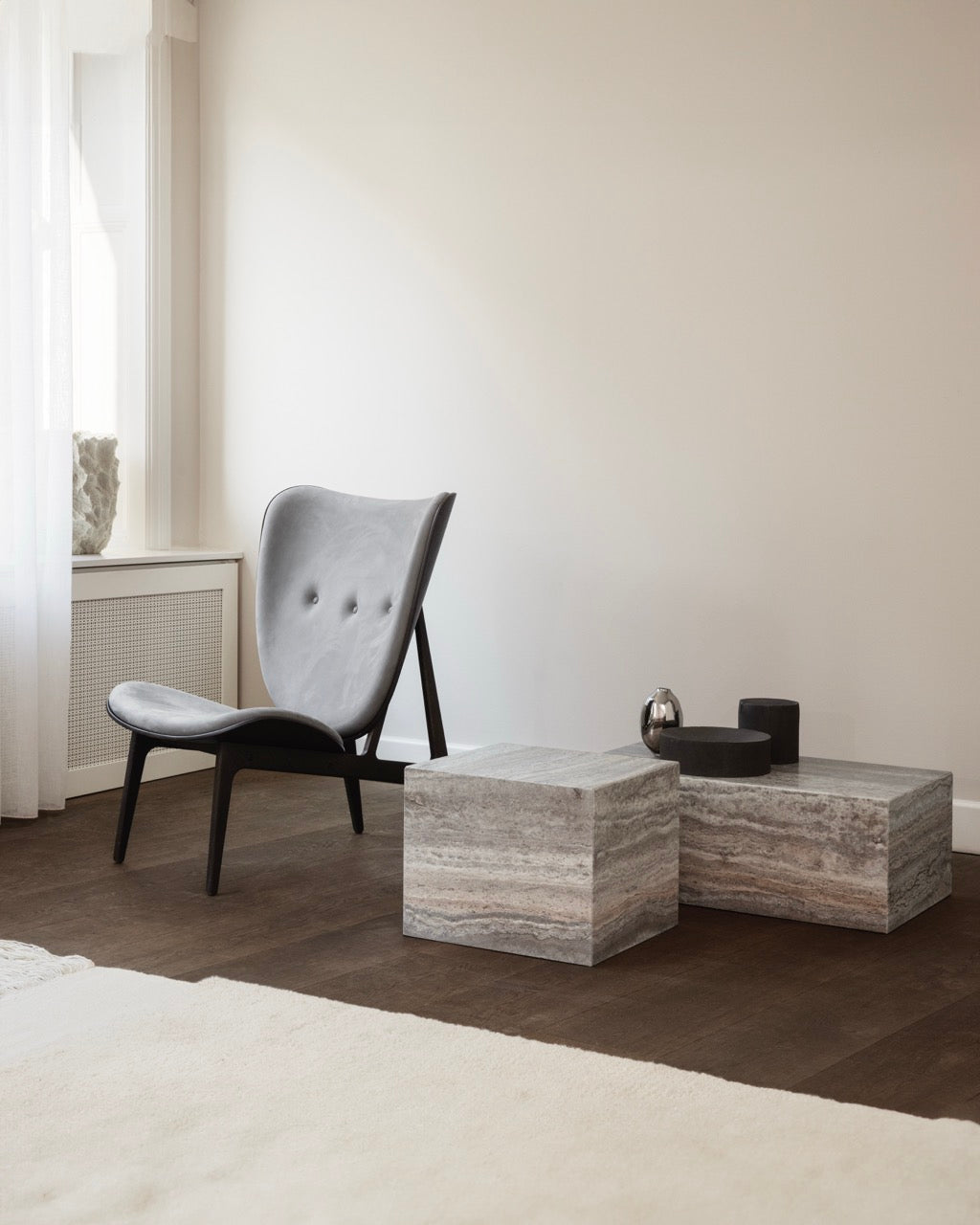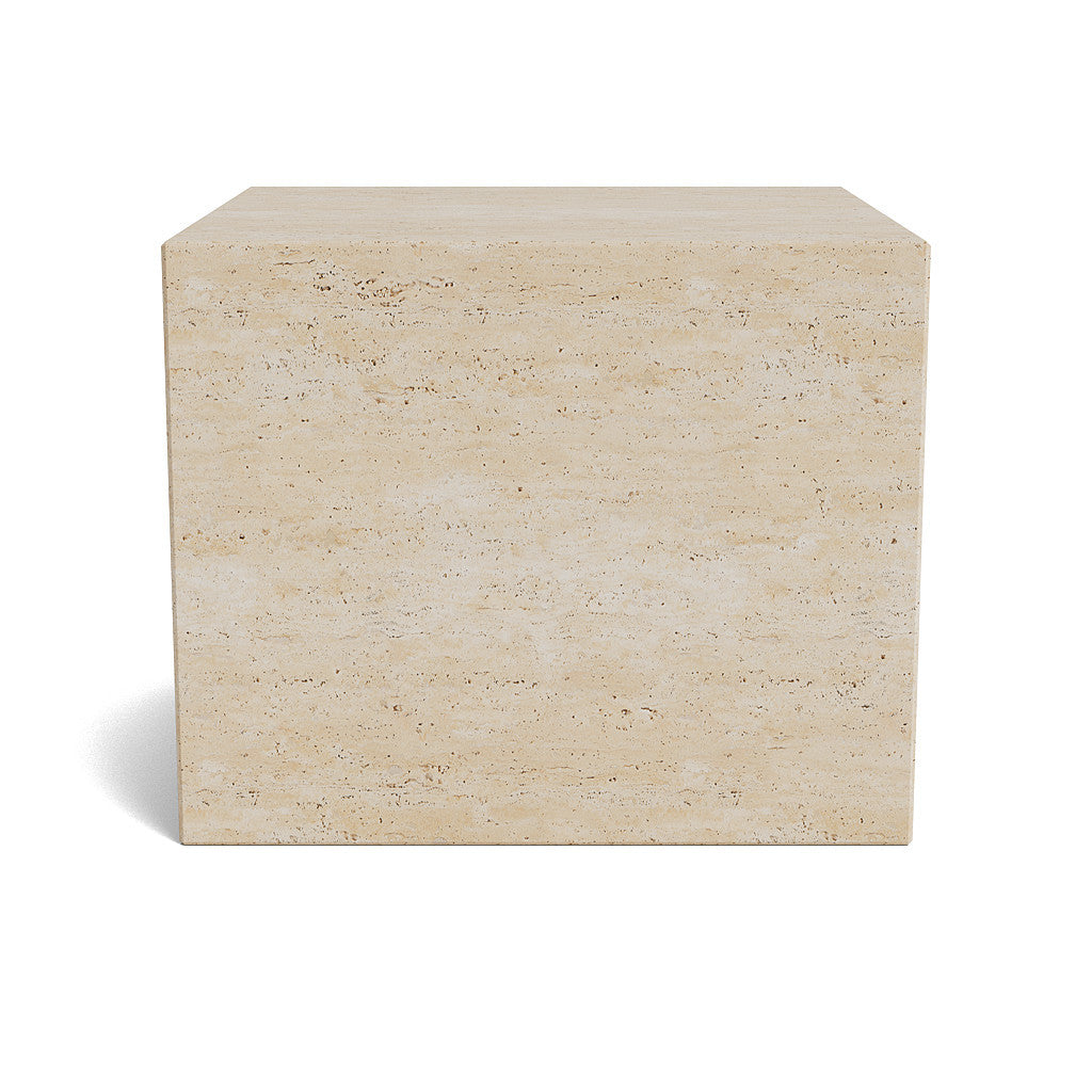 Laget av travertinstein handler dette bordet om å omfavne kvalitetene og skjønnheten til materialet, som i århundrer har blitt brukt i klassisk arkitektur over hele verden. Natursteinen har en uregelmessig overflate med små hull og ufullkommenheter, noe som tilfører en taktil kvalitet til den geometriske formen.