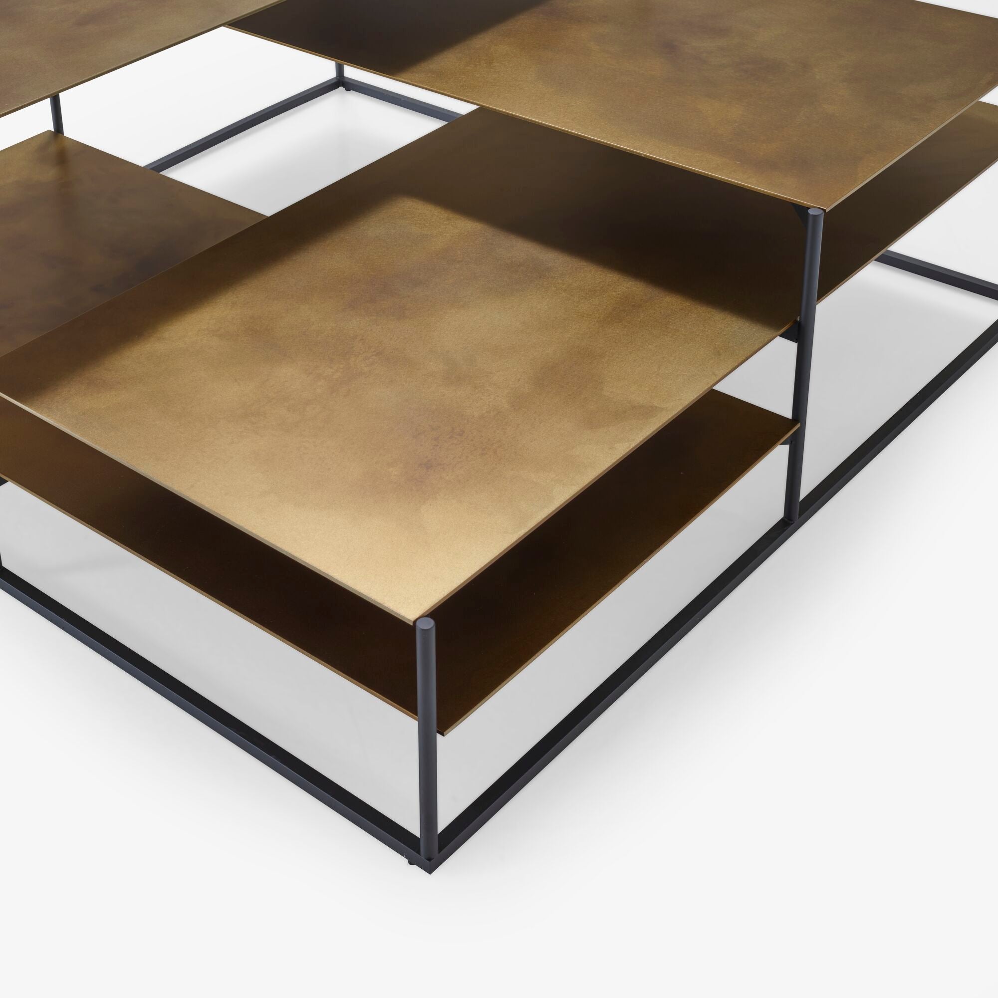 Lavt bord med sortlakkert struktur og topper i oksidert stålkonstruksjon med gyllen messing aspekt.