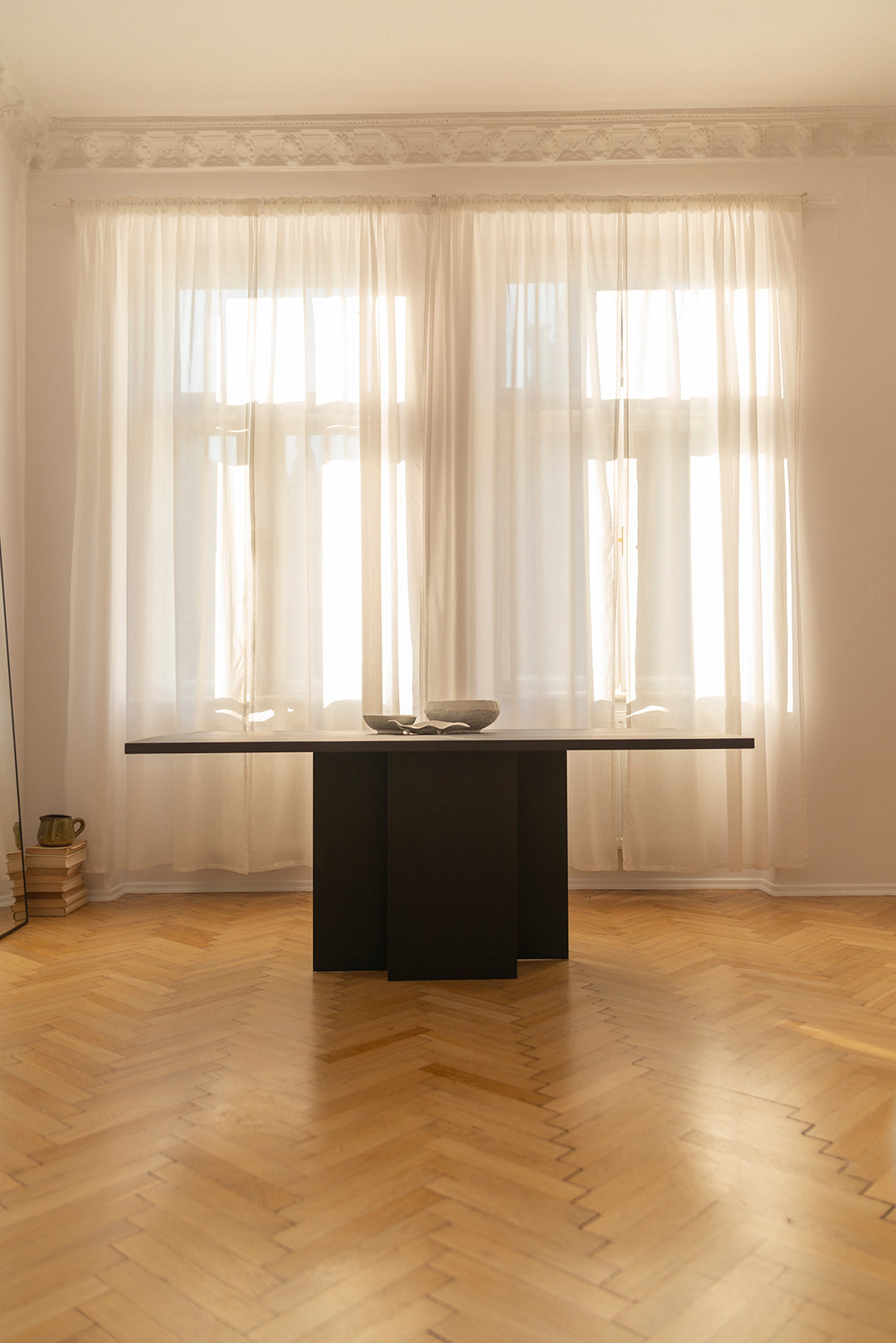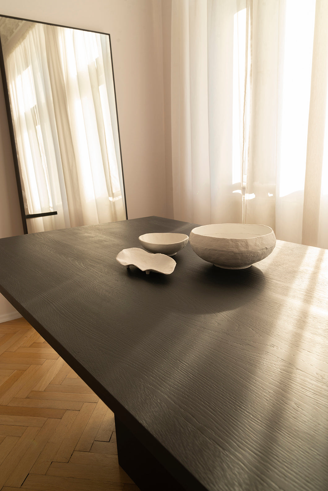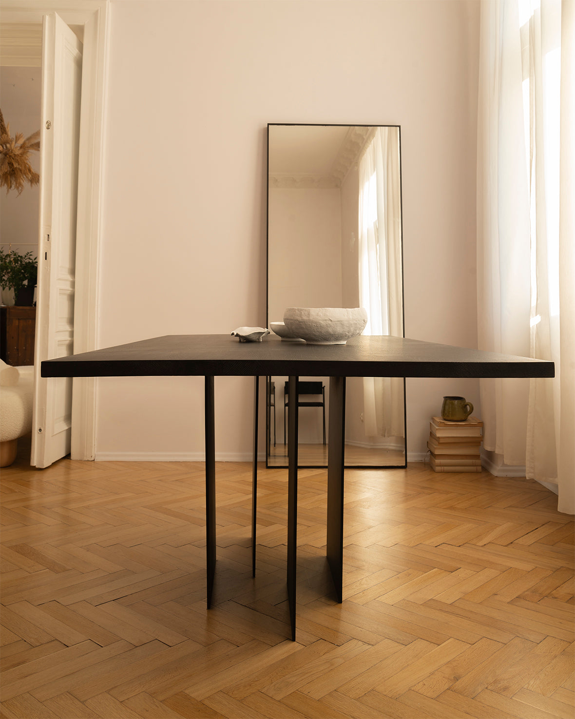 Det moderne objekt056-bordet vil være et statement i spisestuen din. Bordplaten er laget av massiv eik og er støttet av stål. Dette minimalistiske møbelet er et ekte kunstverk i hjemmet ditt.