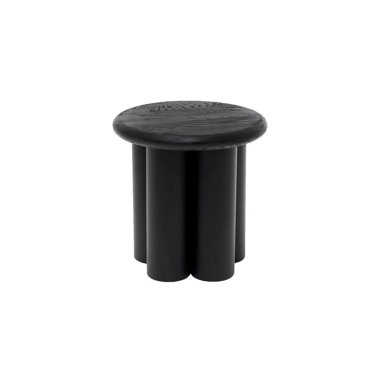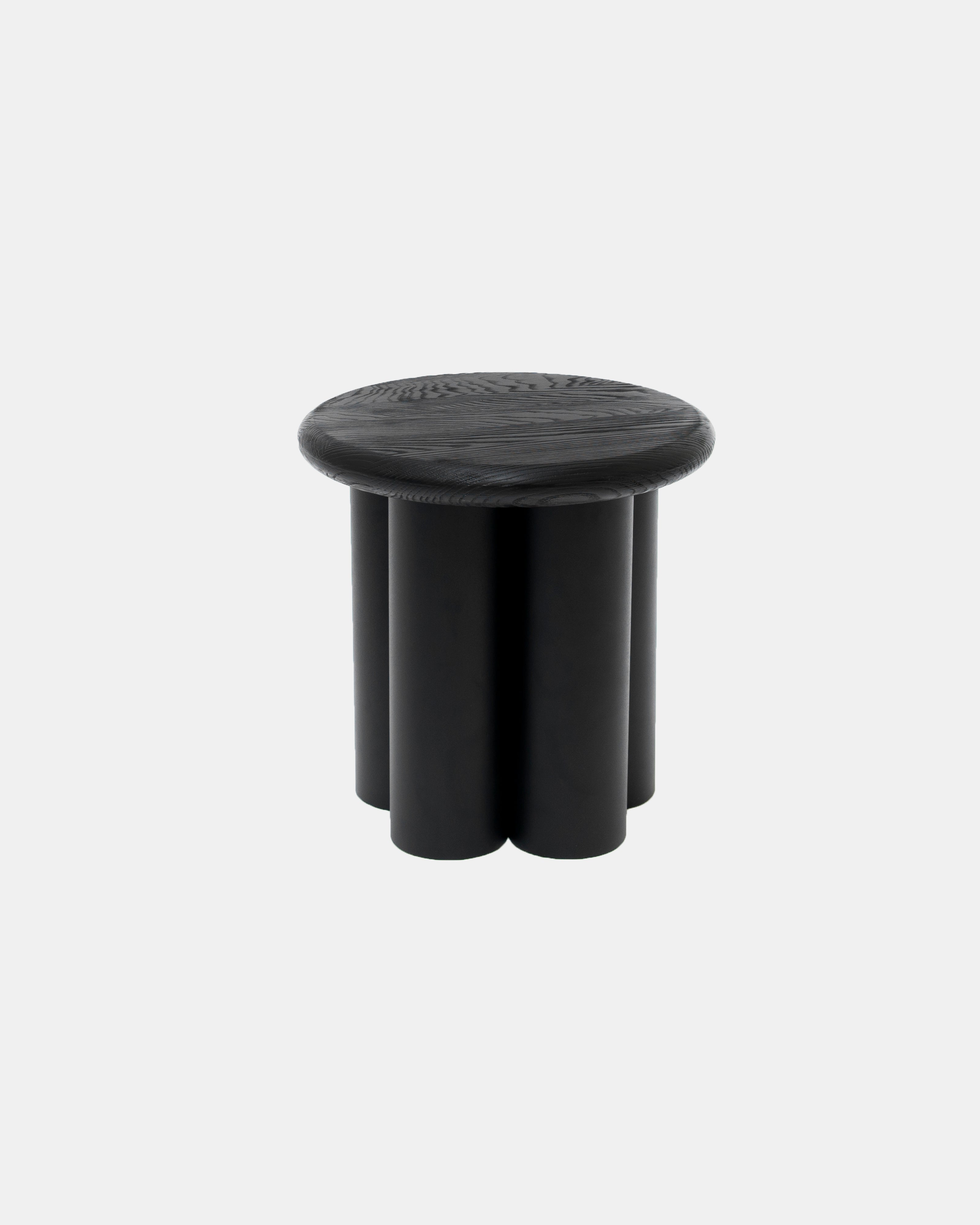 Rundt sidebord laget av fem sammenkoblede stålben og en børstet treplate med tydelig struktur. Den kan også brukes som en bærbar krakk.