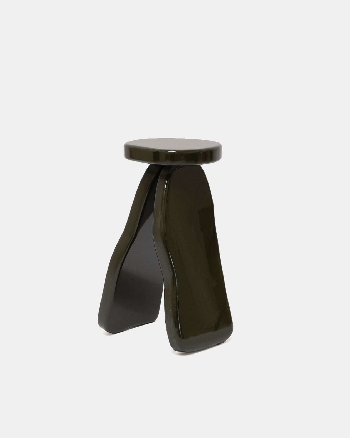 Et organisk formet bord laget utelukkende av blank lakkert eiketre. Sidebordet har en mørk grønn delikat farge.