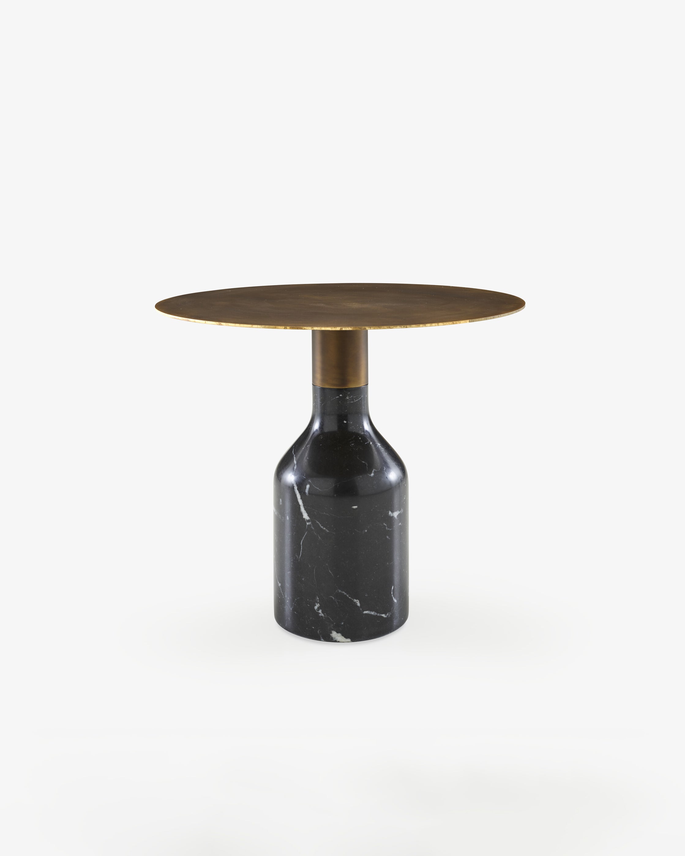 enne samlingen av bord henter inspirasjon fra moderne arkitektur, skulptur og forskning på materialene som brukes, spesielt de naturlige egenskapene til oksidasjon. Det handler altså om å kombinere "bærekraftige" materialer som stein eller metall og gjøre dem til en arkitektonisk form. Oxydation-bordene kombinerer en enkel form med en komplisert tekstur og er en blanding av tradisjonelle teknikker og svært avanserte teknologier. Når det oksiderer, kan metall gi noen uventede resultater: hvert bord er naturlig unikt, og man vil garantert oppdage en myriade av variasjoner i den oksiderte toppen. - Topp i oksidert (syrebehandlet) stål, ferdig med transparent lakk. Base av Marquina-marmorunderstell (med vannavvisende behandling) og en oksidert gyllen messingplate.