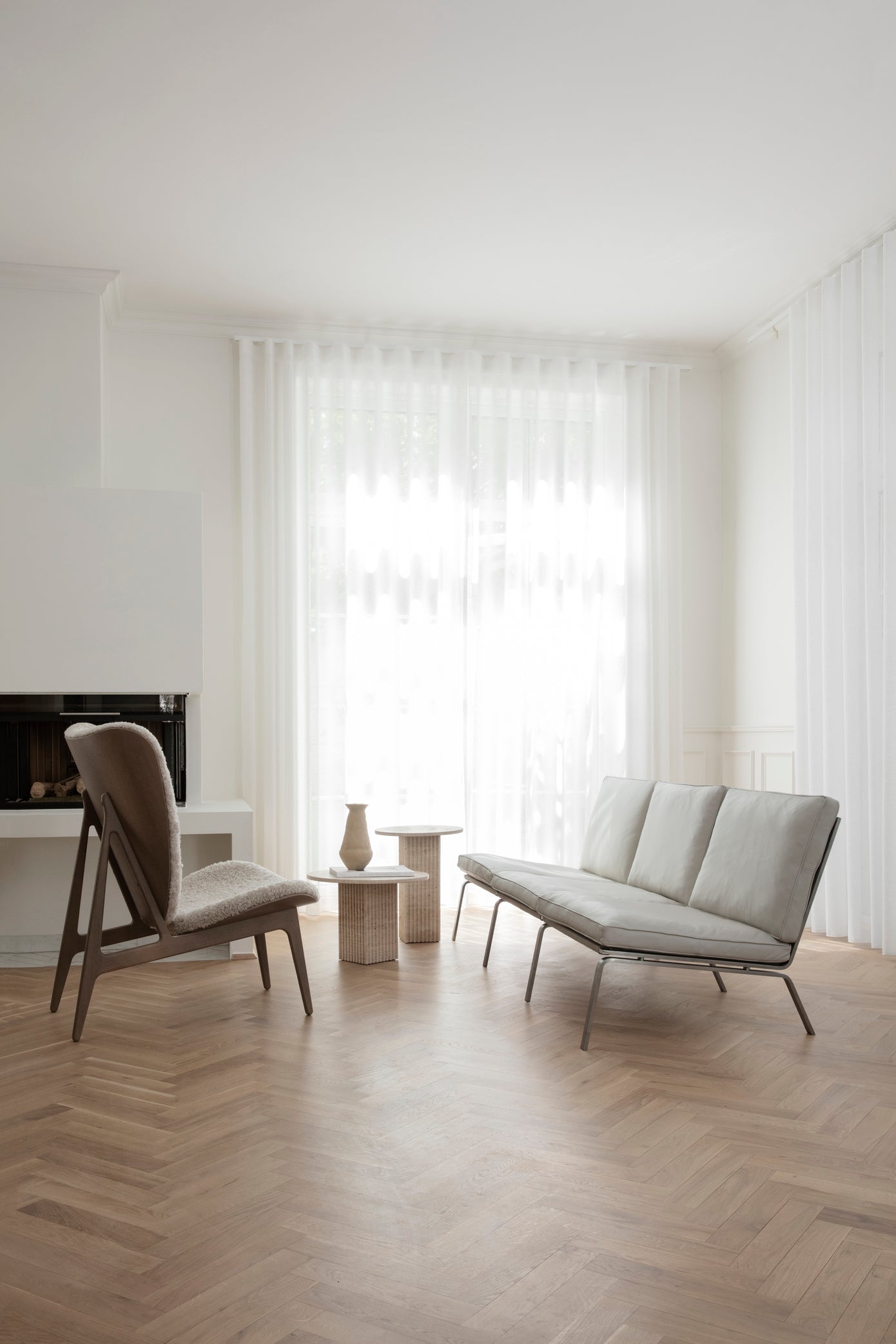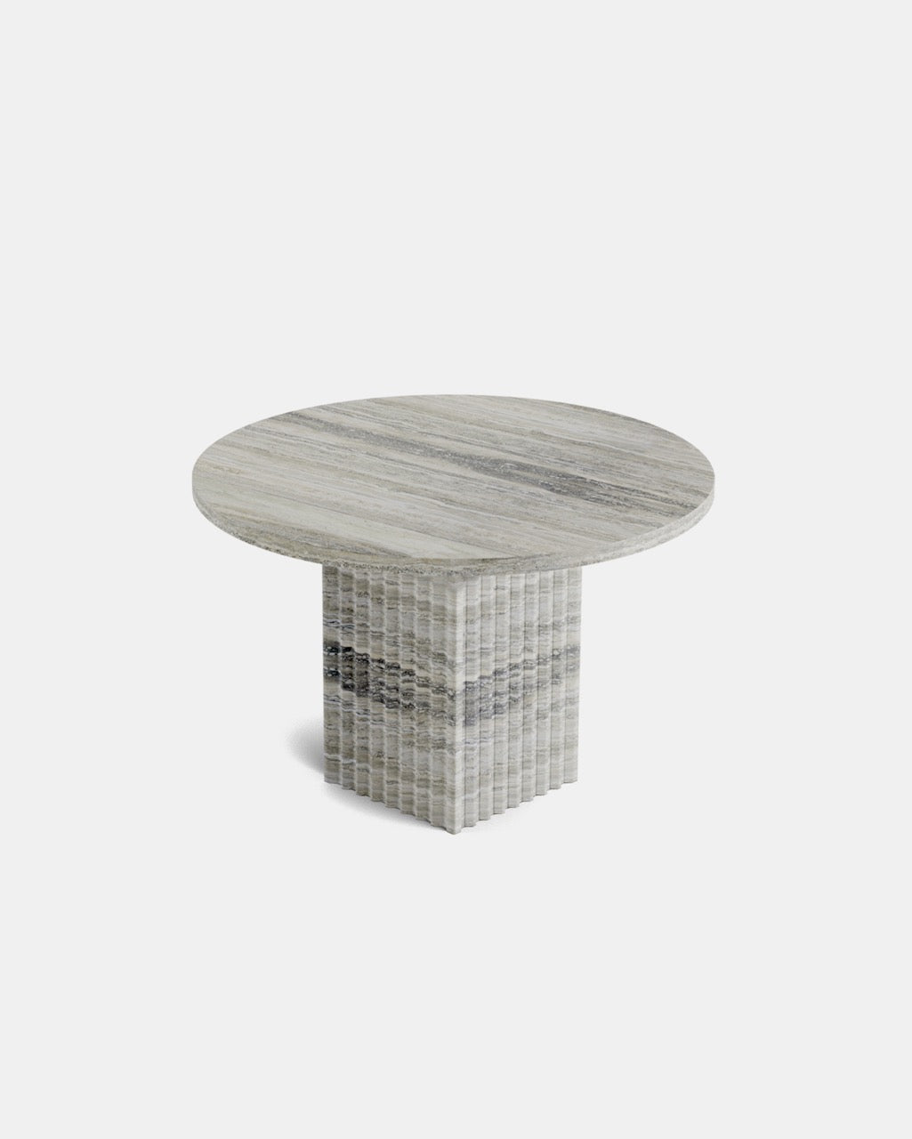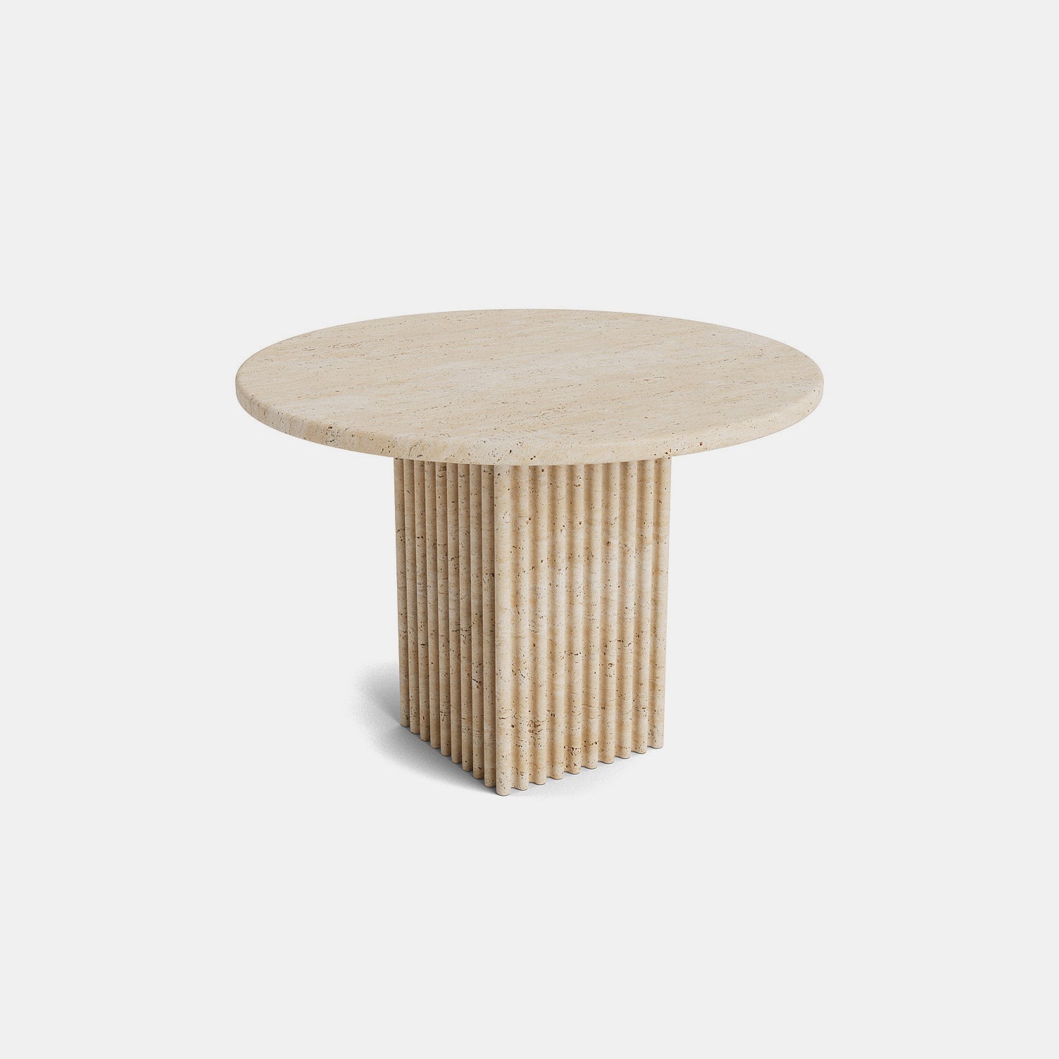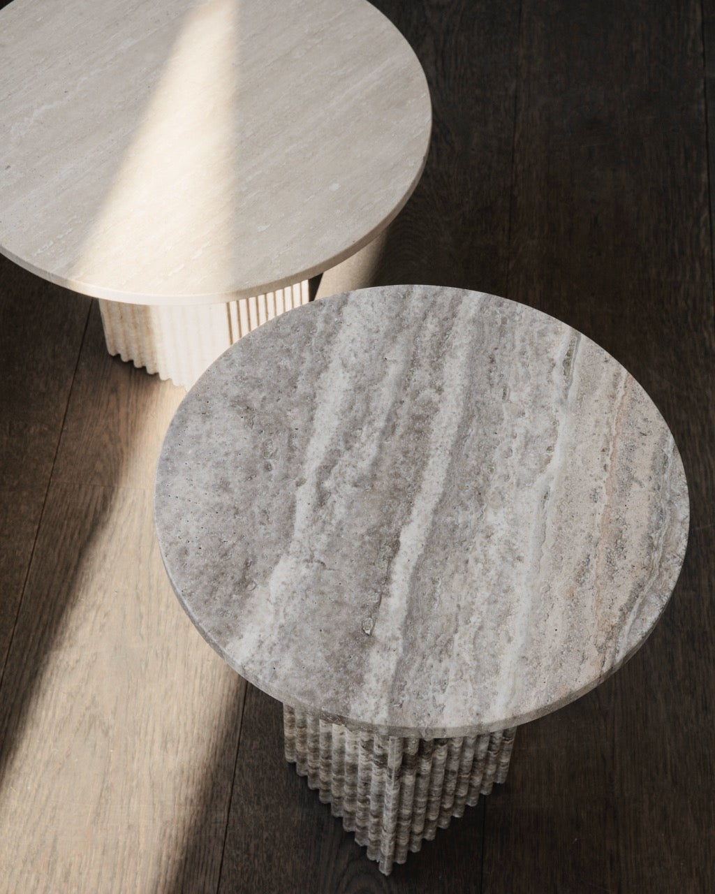 Soho er laget av travertin med en vakker naturlig overflate av små hull og «feil». Bordet er laget av travertinplater, og er fortsatt lett og å flytte rundt på.