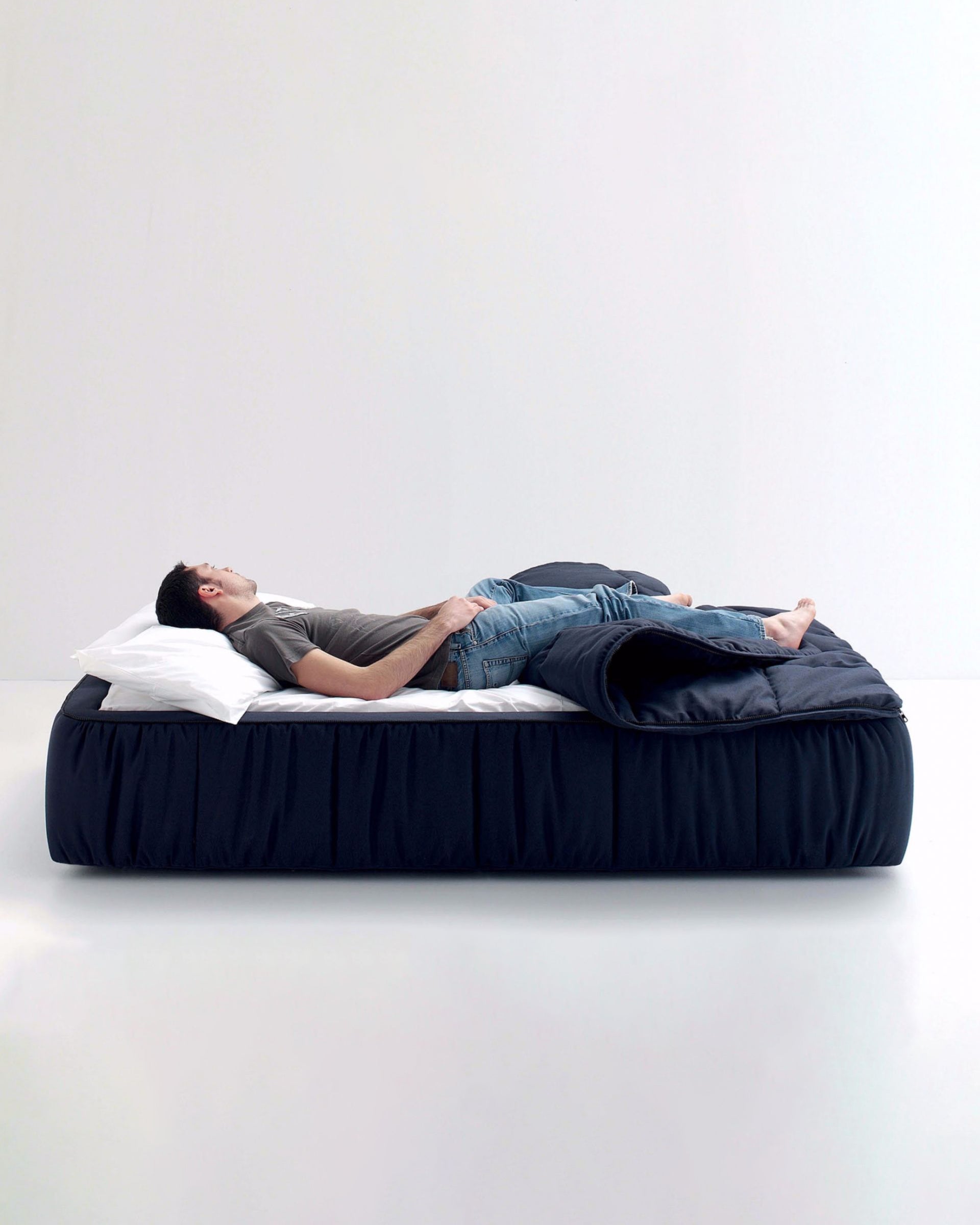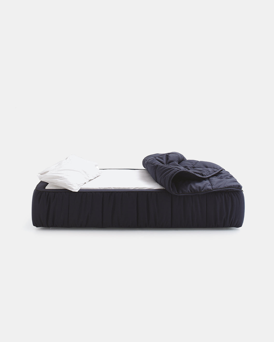 Strips-sengen viderefører det ikoniske uttrykket fra serien, med sitt karakteristiske, vatterte og quiltede trekk. På den nyeste modellen, Strips sofa bed 2024, er polstringen integrert i trekket og festet til en ramme i poppelfinér. Den er laget av formstøpt polyuretan med varierende tetthet for optimal komfort.