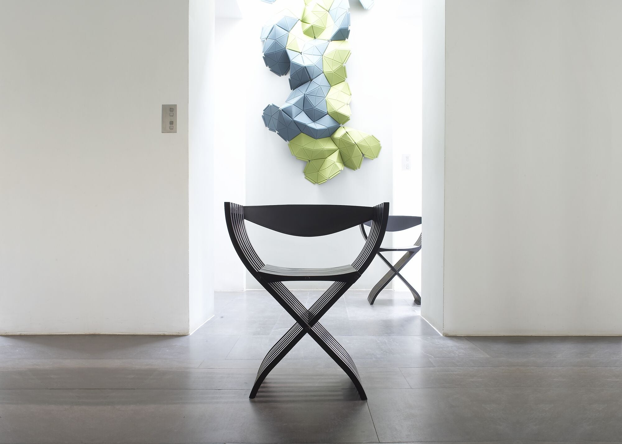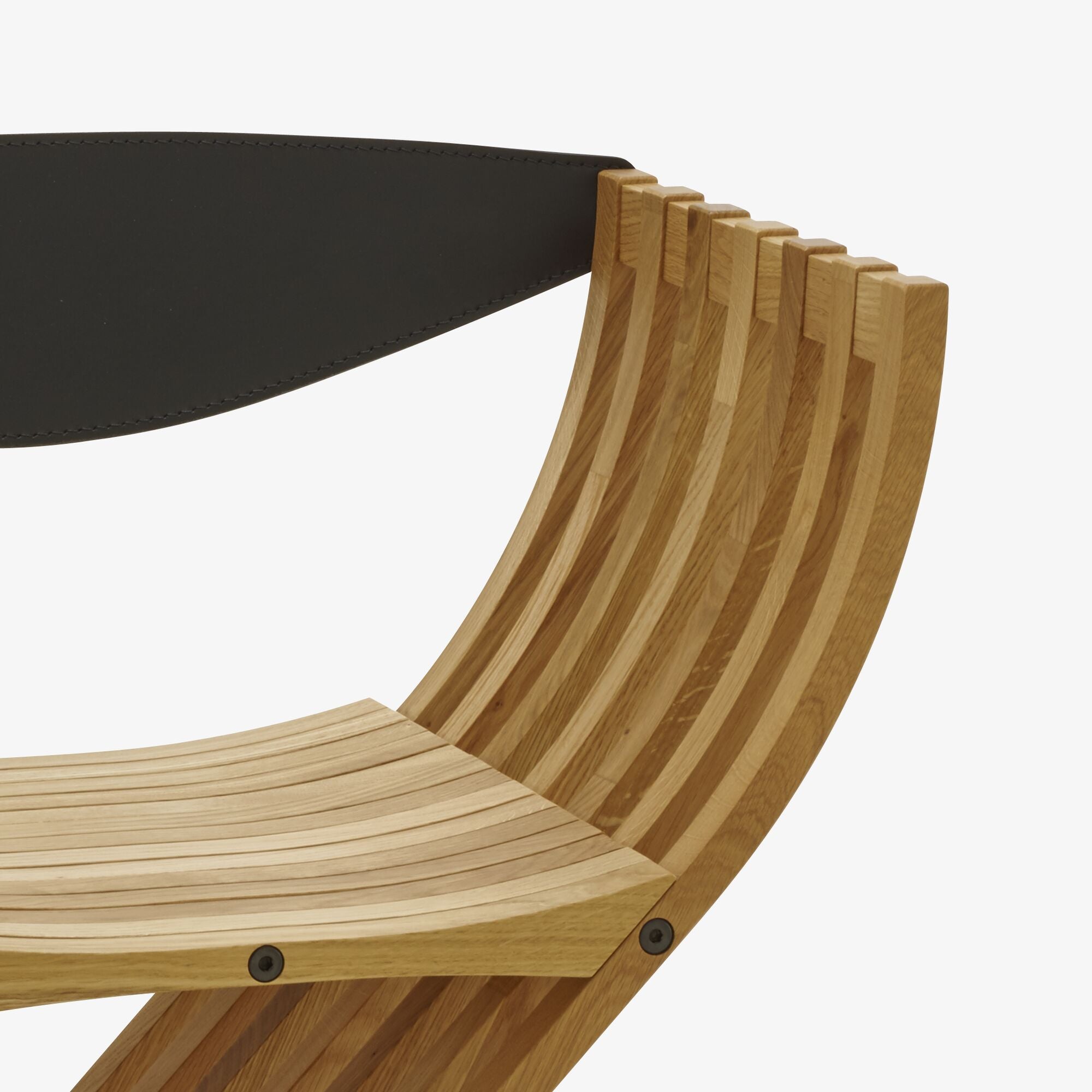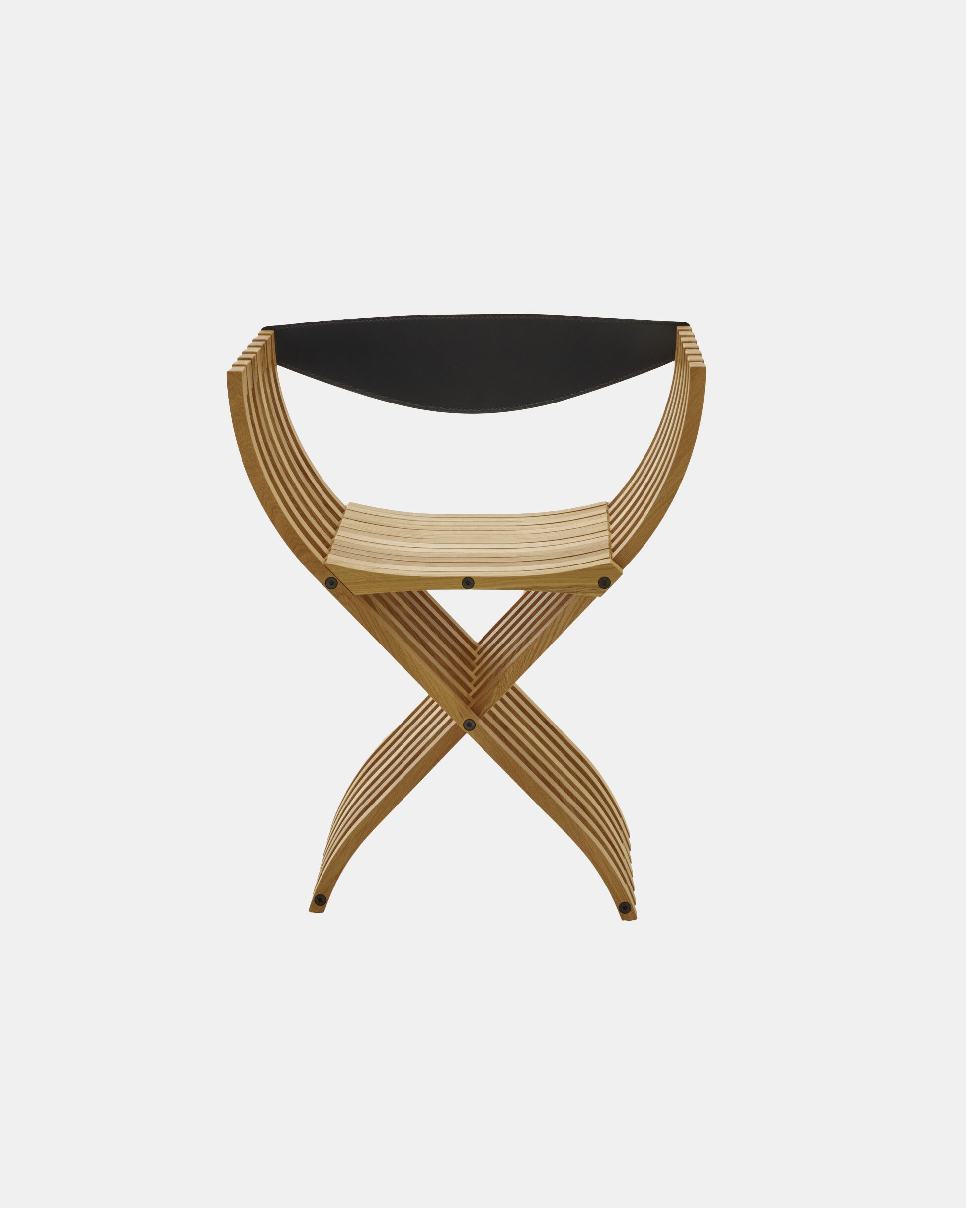 Denne re-utgaven av Pierre Paulins tidlige 1980-tallsdesign kommer i solid natur- eller svartbeiset bøk med en myk matchende ryggstøtte i fullnarvet okseskinn. Den ble vist på Musée des Arts Décoratifs i september 1983. Stolen kan brettes sammen i midten og er stemplet med Paulins signatur på den nedre bakre delen av rammen.