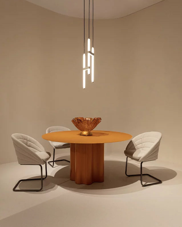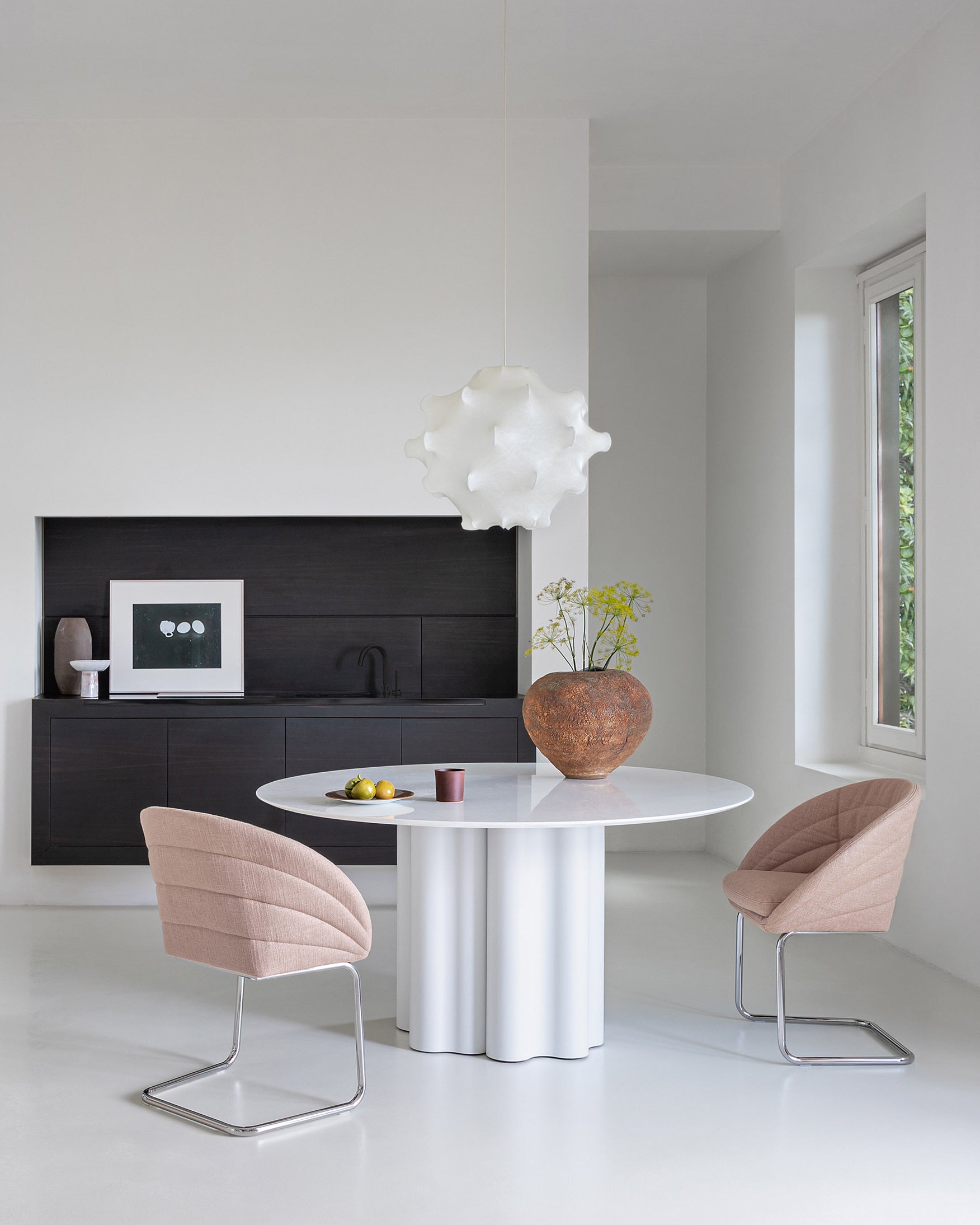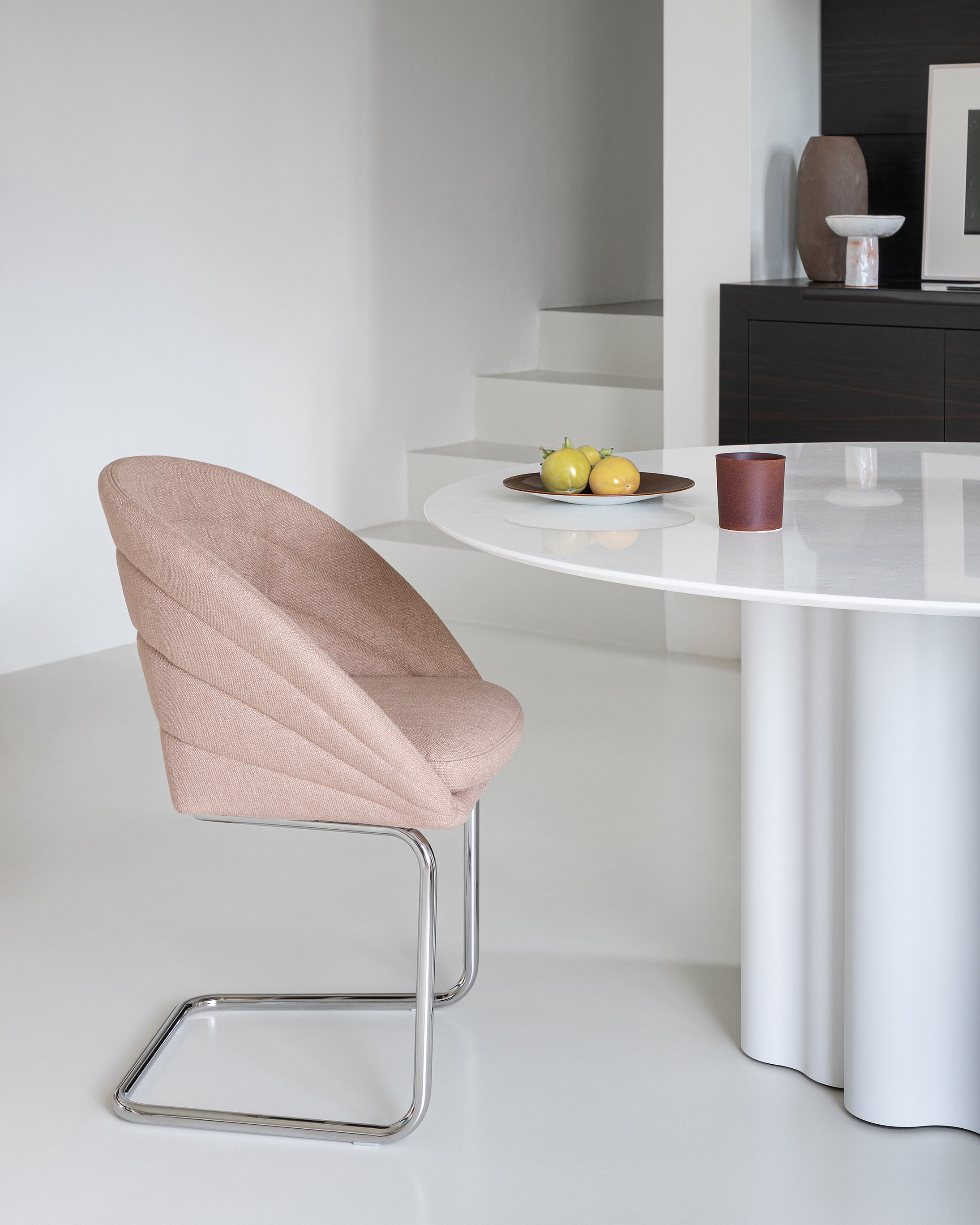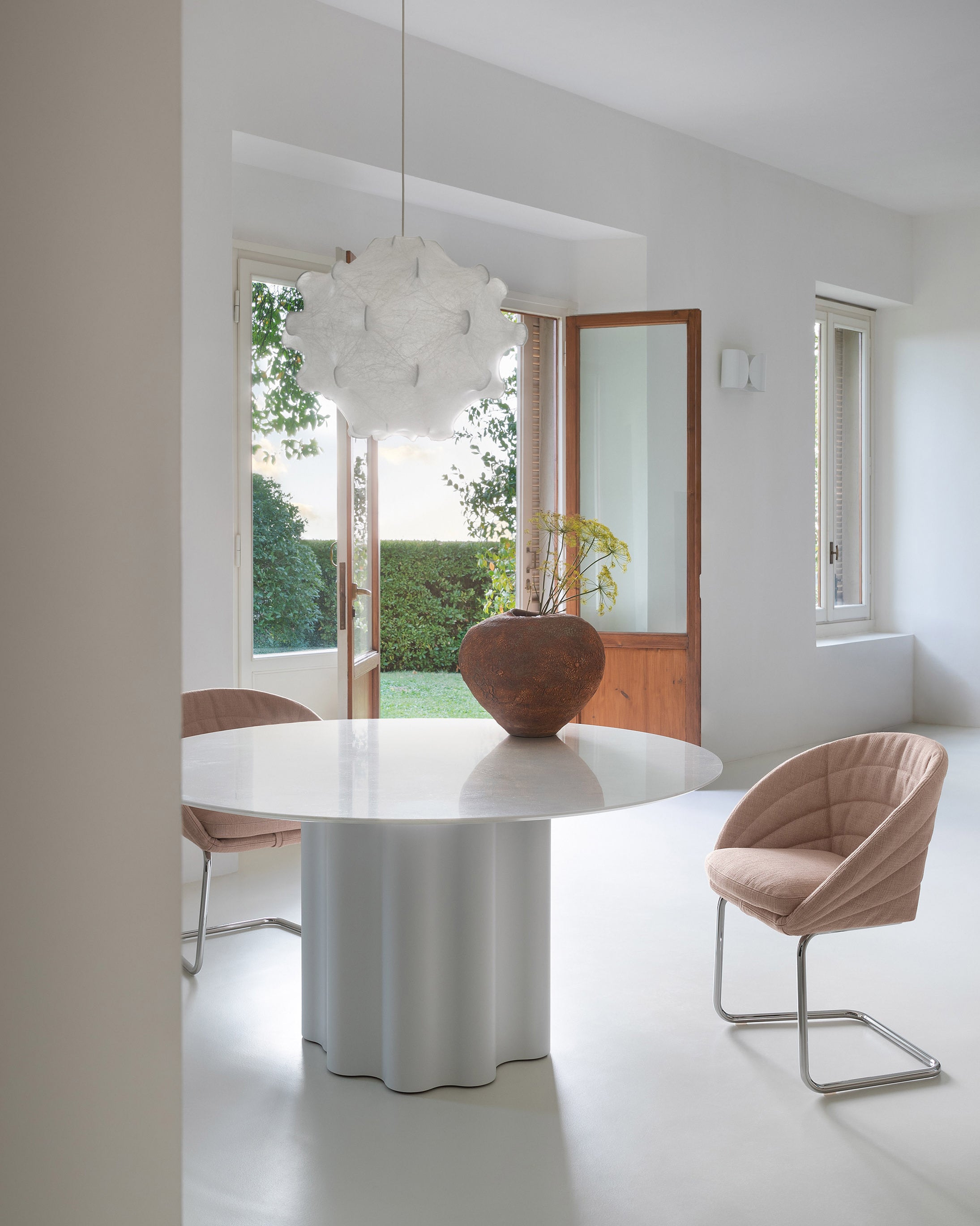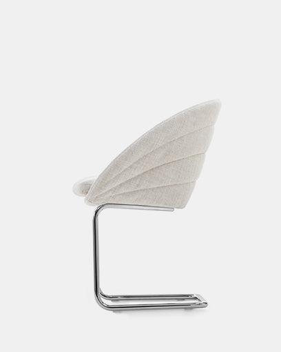 Fleur-lenestolen og Petite Fleur-stolen(spisestol versjonen), designet av Sergio Bicego for Saba, henter inspirasjon fra en blomsts elegante former og introduserer en ny tolkning av den klassiske cantilever-strukturen.