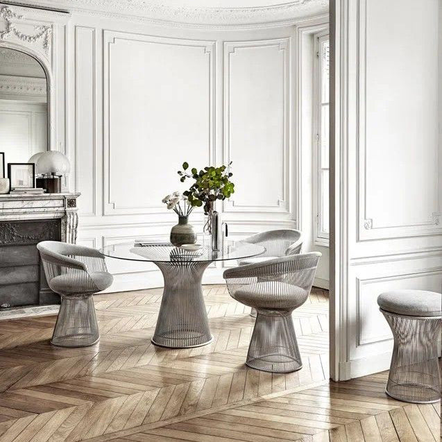 Stolen kan brukes både som spisestol og ved skrivebordet, og den har et komfortabelt polstret sete. Kolleksjonen inkluderer også en sidestol, krakk og spise- og salongbord. Platner Arm Chair er en utrolig komfortabel stol med et mykt uttrykk. Plasseres med fordel sammen med flere lignende stoler rundt Platner Dining Table. Stolen er en favoritt hos oss på Nordiska Galleriet, og vi bruker den gjerne i utstillingen vår. Takket være det nøkterne uttrykket og den høye komfortfaktoren er Platner Side Chair en moderne klassiker.