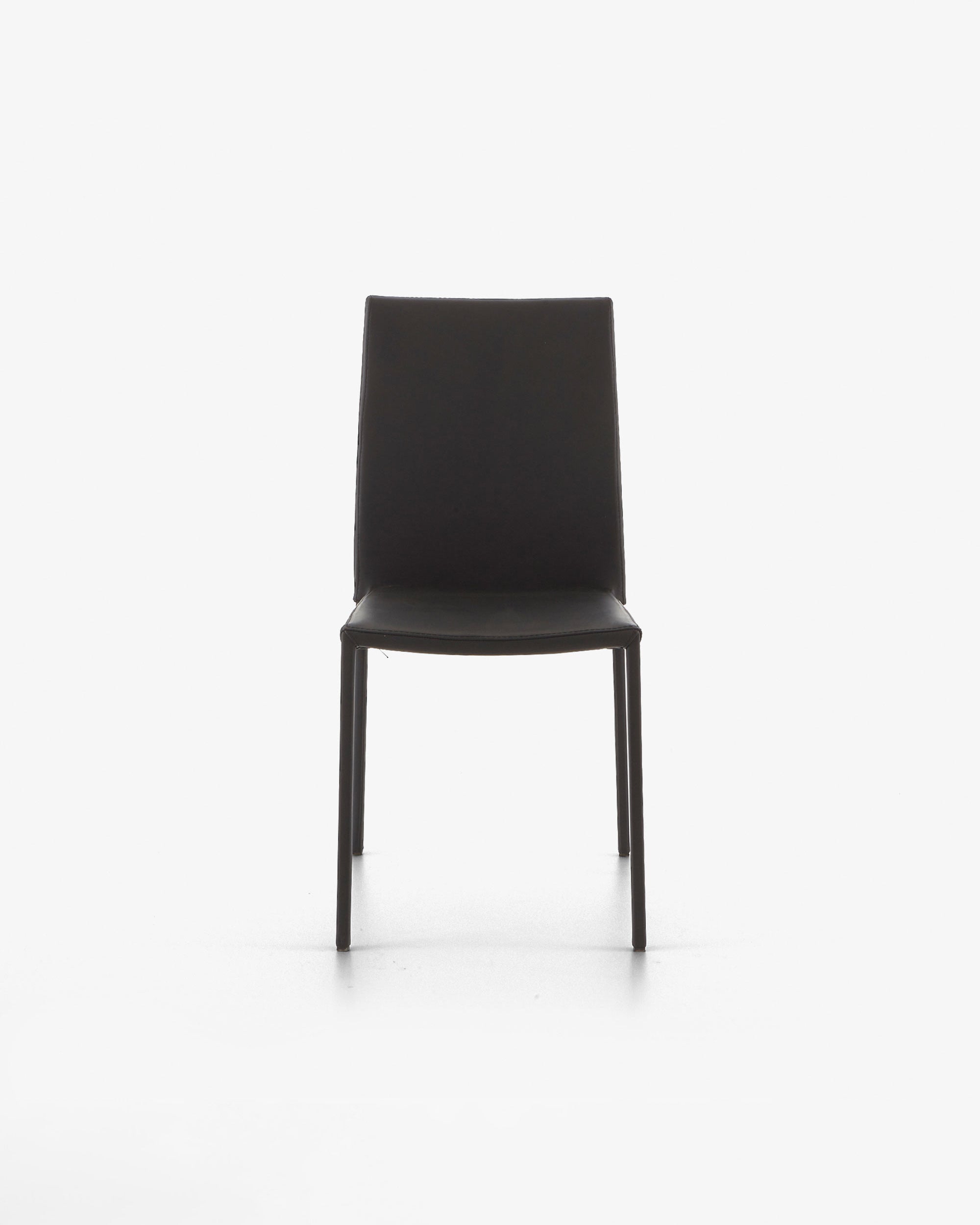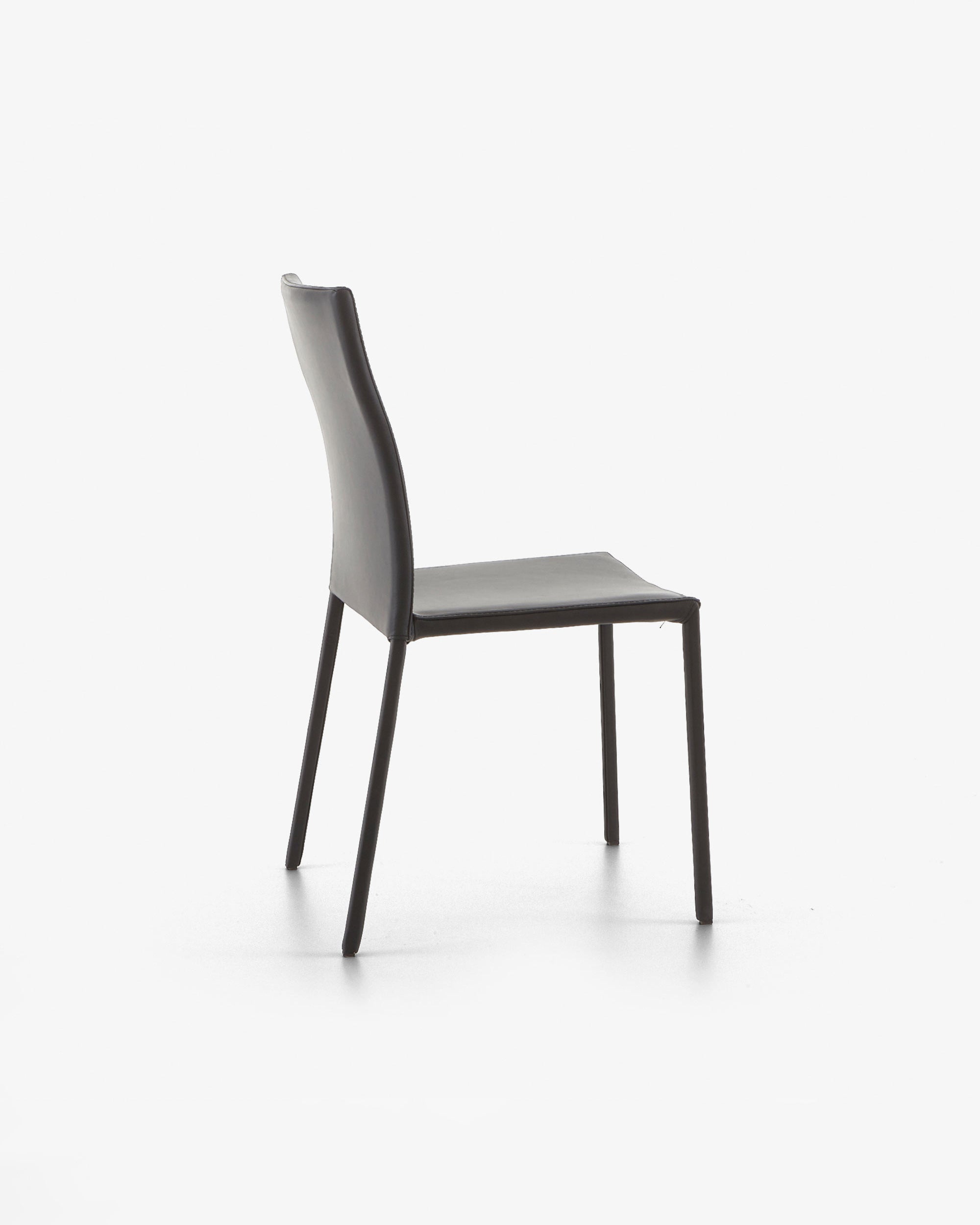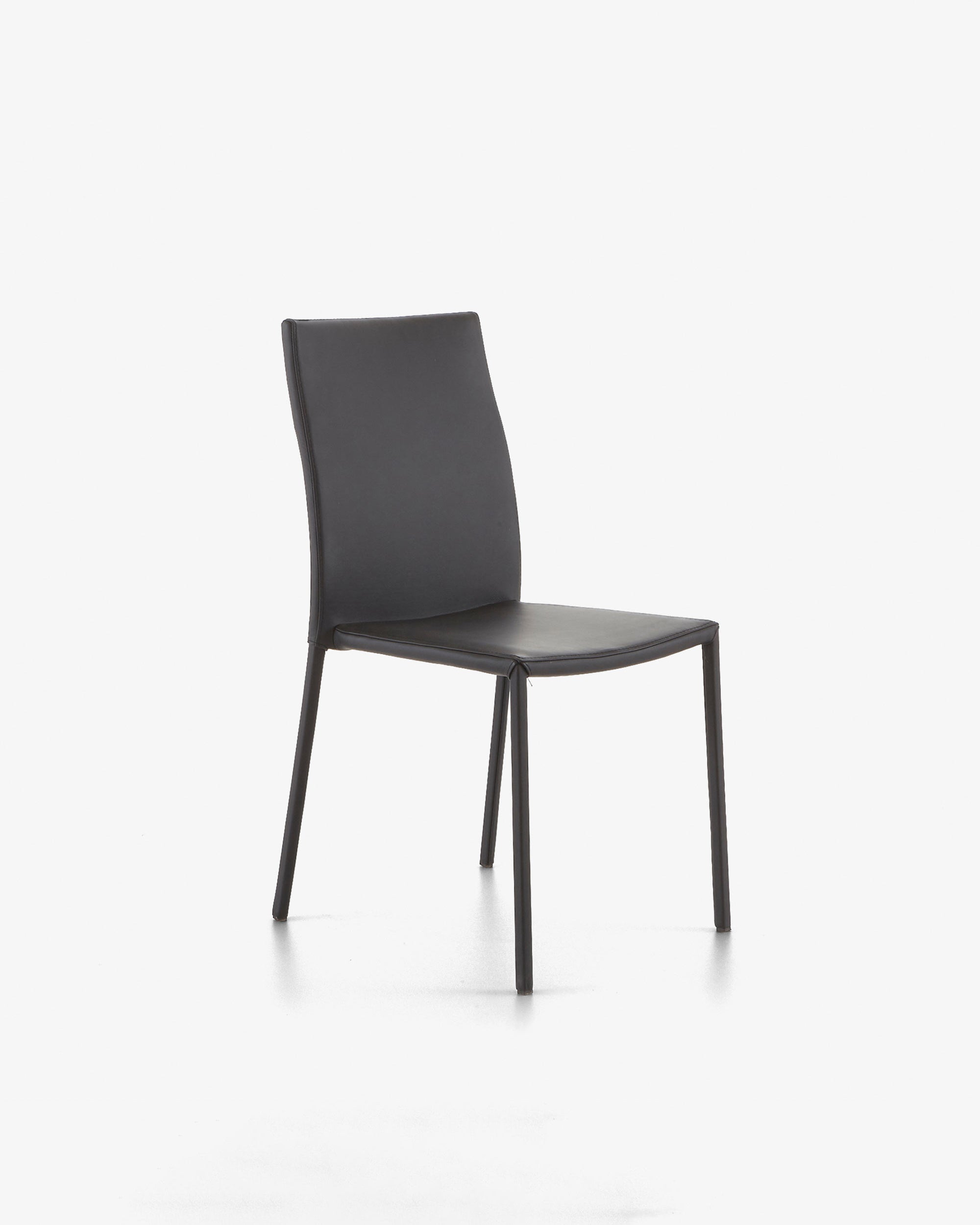 Slim Chair kombinerer minimalistisk design med høy komfort. Den har en solid stålkonstruksjon, kledd med polyeterskum for optimal sittekomfort, og er heltrukket i enten 100 % polyesterstoff eller pigmentert, korrigert narvet skinn.