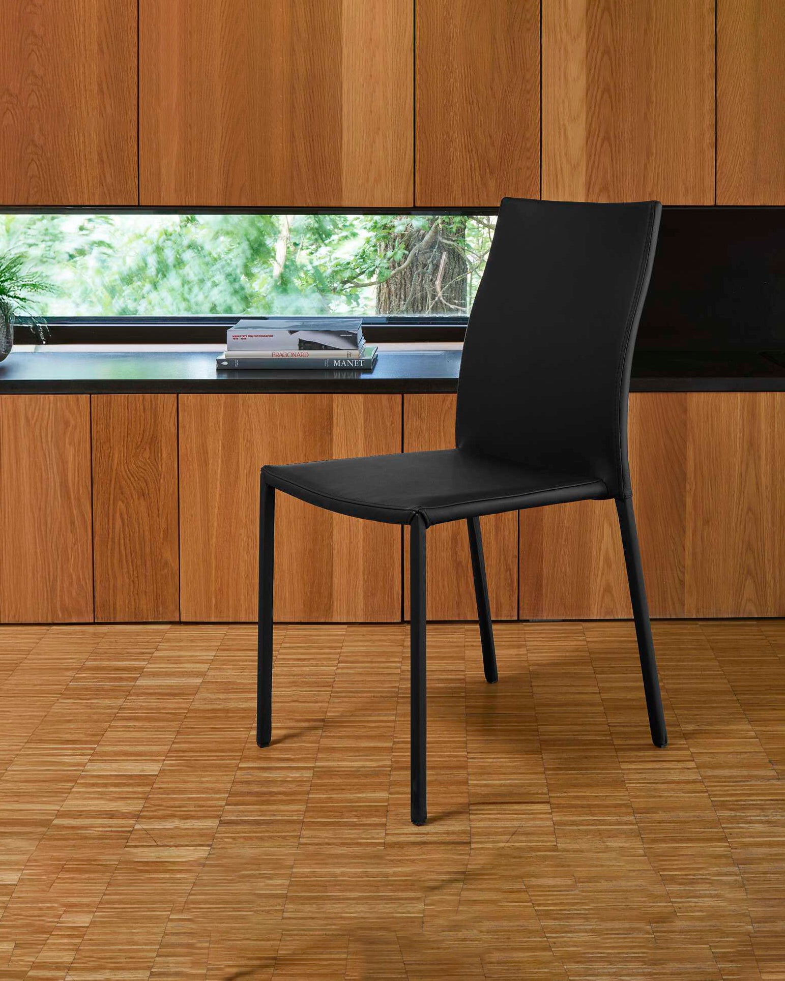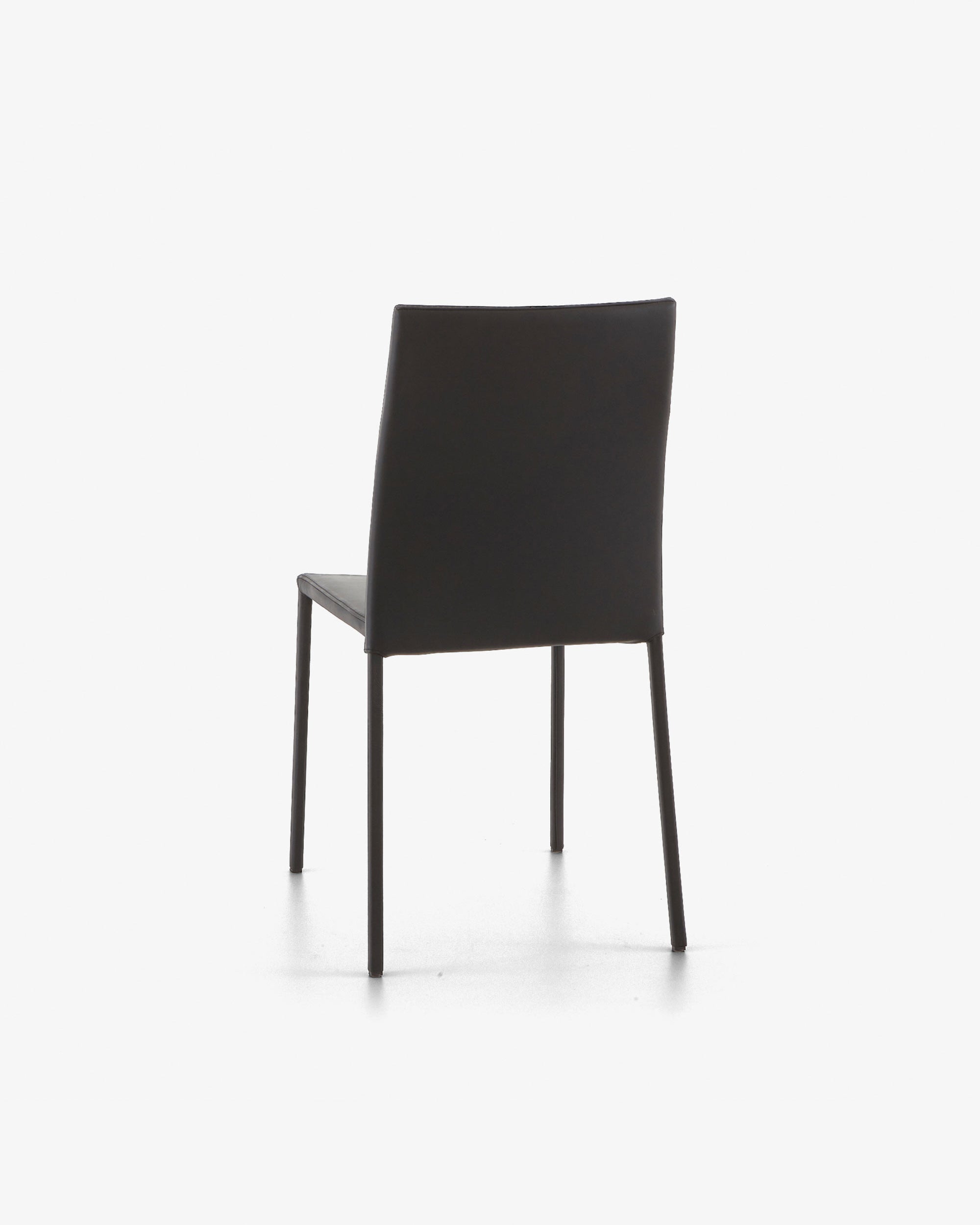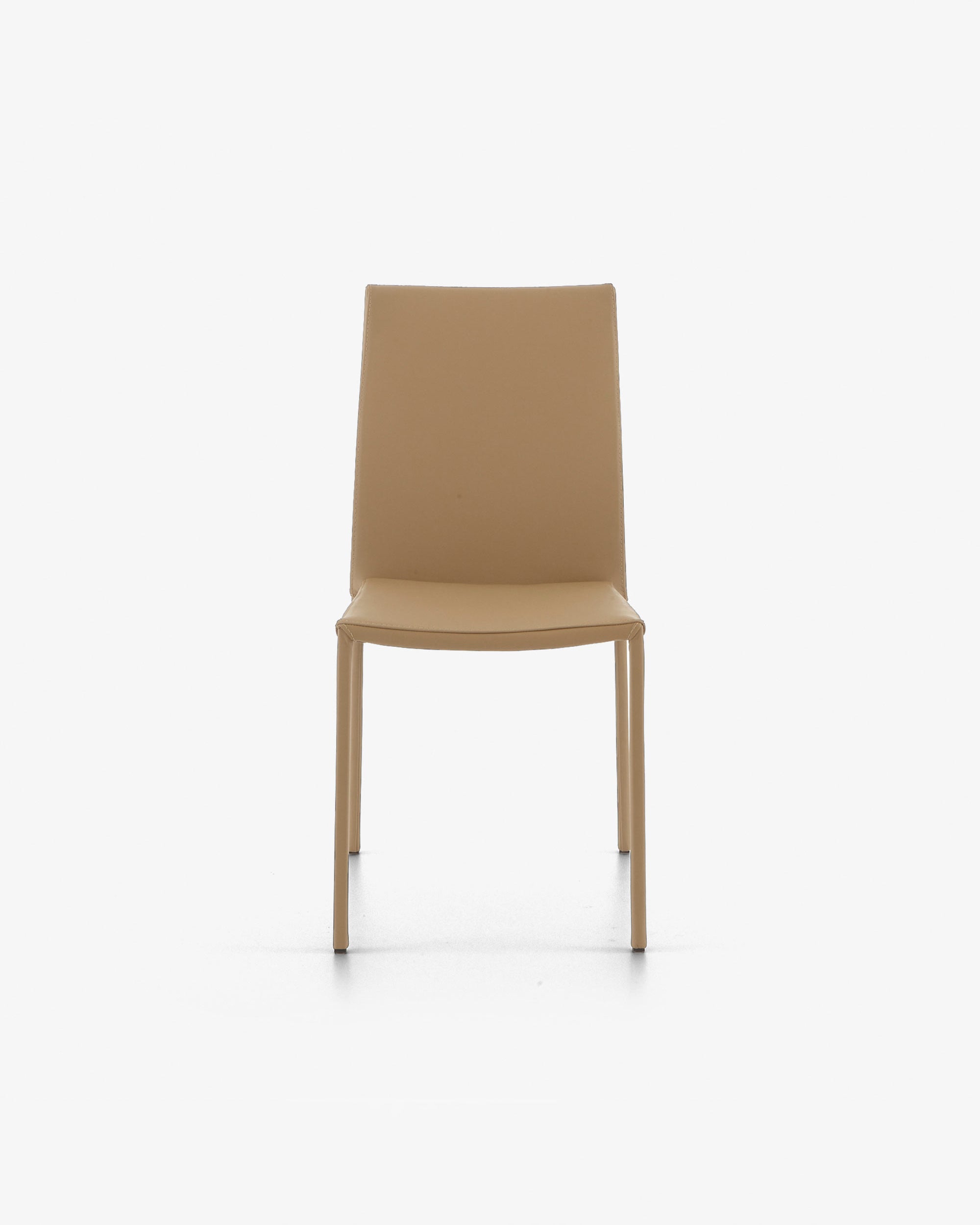 Slim Chair kombinerer minimalistisk design med høy komfort. Den har en solid stålkonstruksjon, kledd med polyeterskum for optimal sittekomfort, og er heltrukket i enten 100 % polyesterstoff eller pigmentert, korrigert narvet skinn.