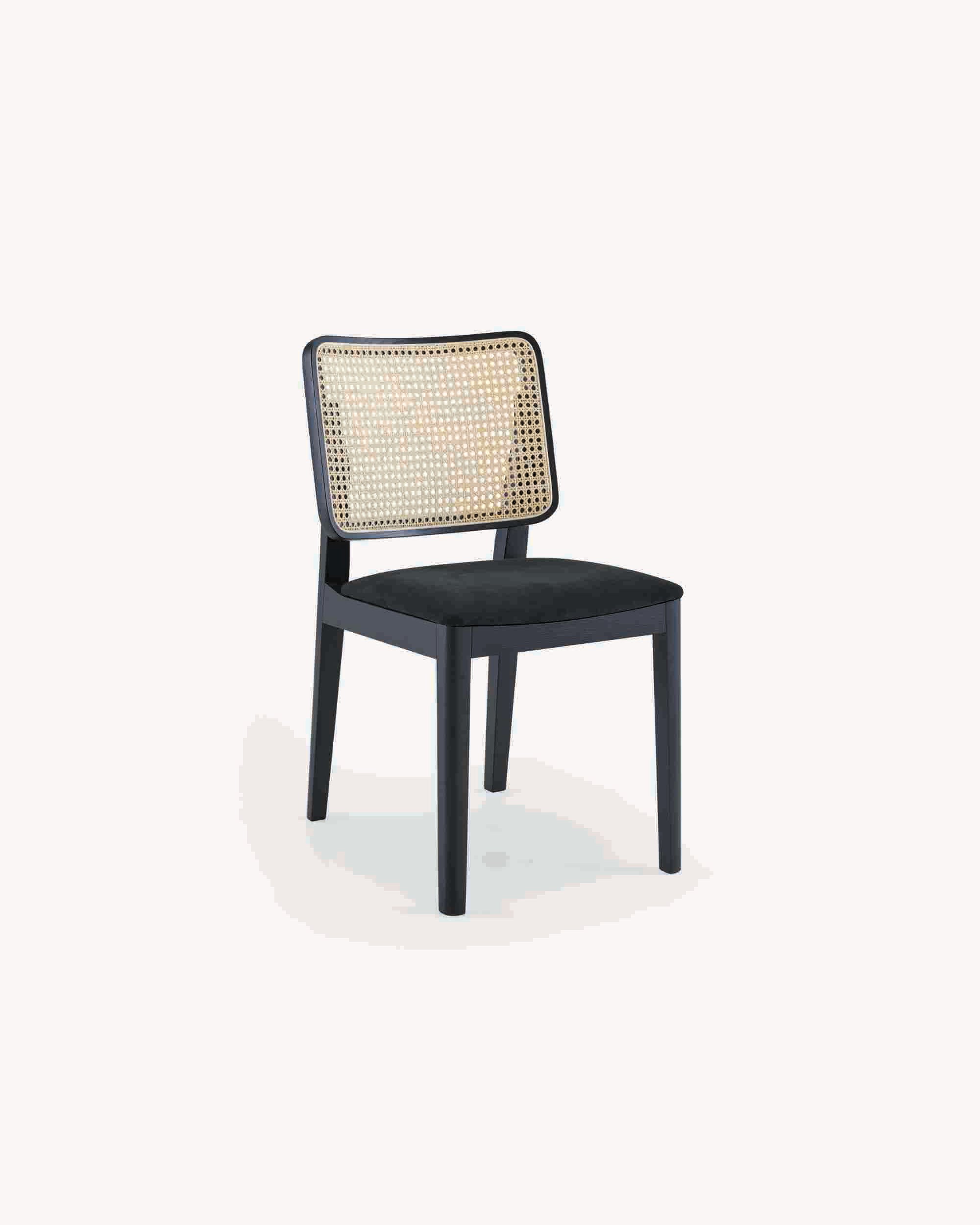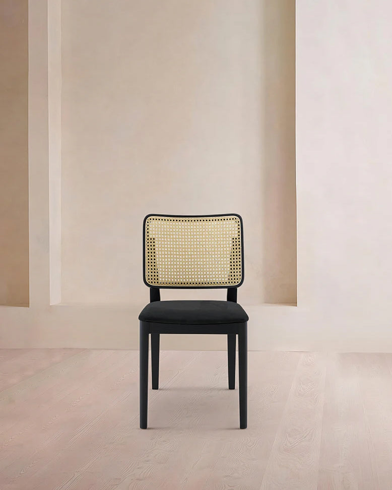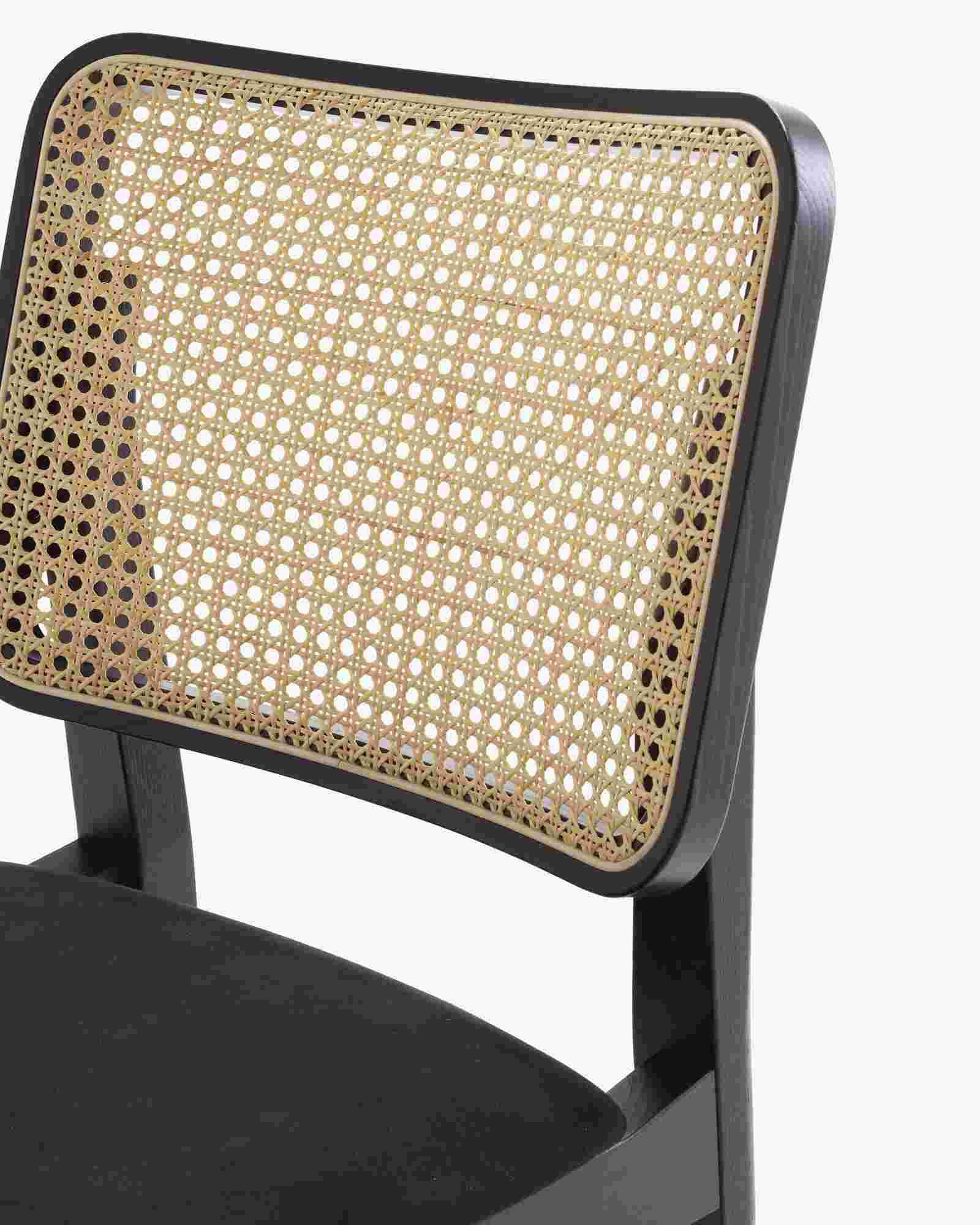 Stolene har en base i svartbeiset ask med satengfinish. Setet er laget av FR polyuretanskum (30 kg/m³ – 6,3 kPa) for optimal komfort, og er trukket i Alcantara Slate Black. Ryggstøtten er i naturlig rottingflett.