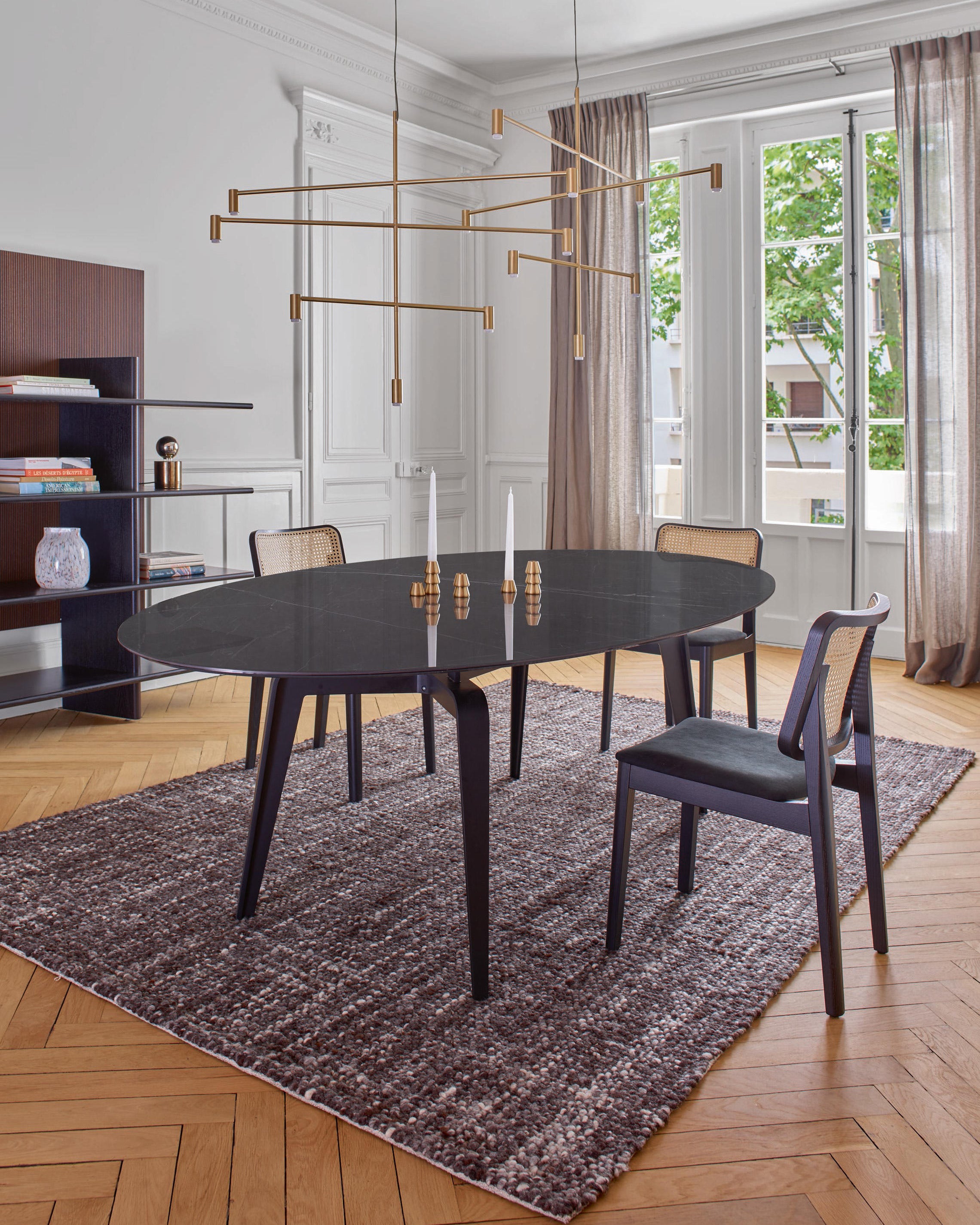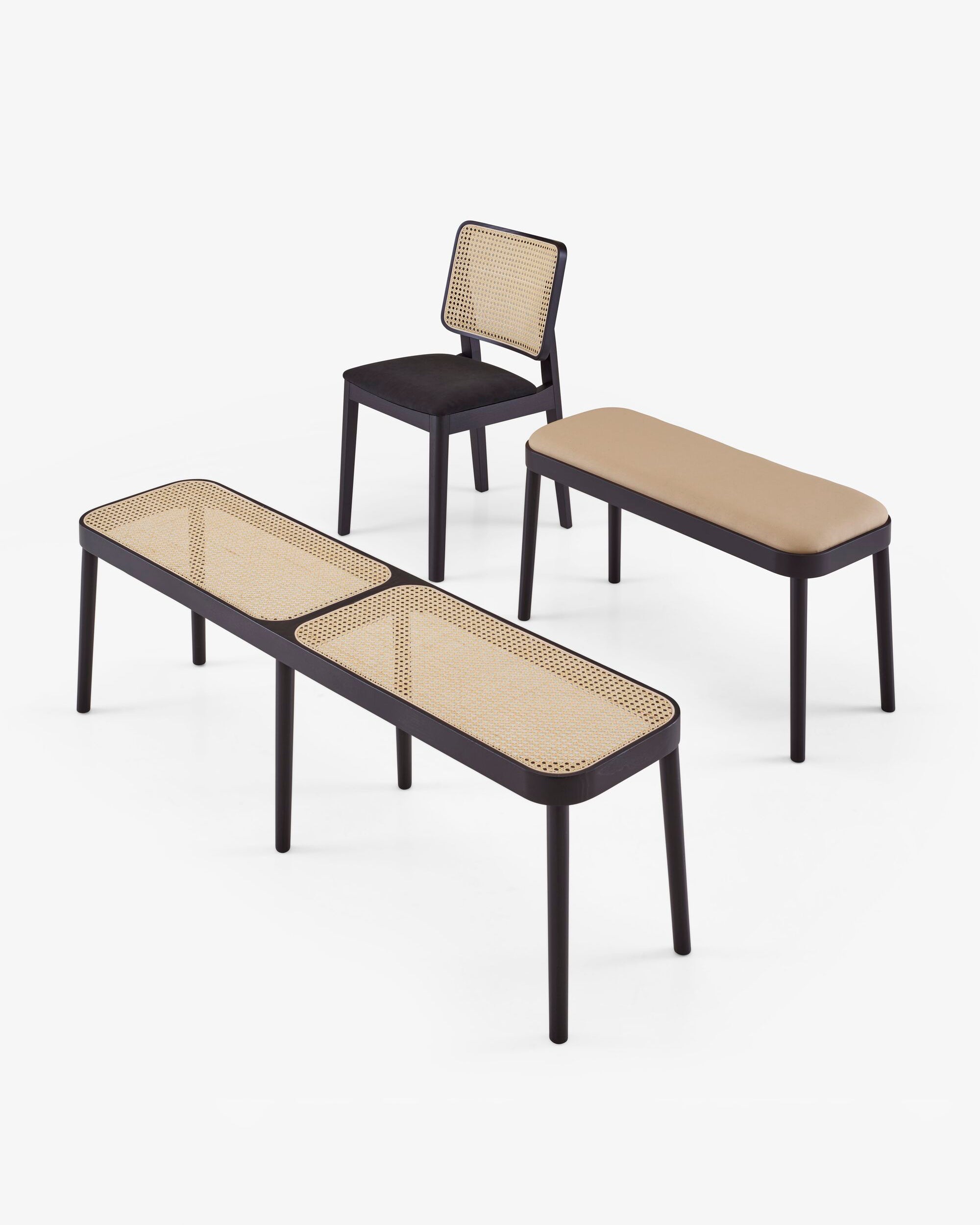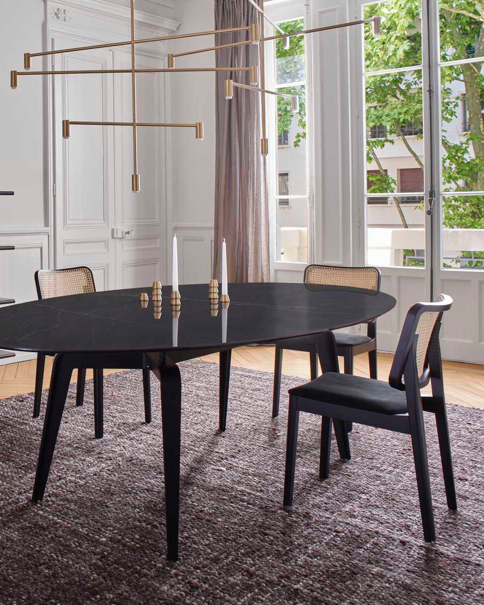 Stolene har en base i svartbeiset ask med satengfinish. Setet er laget av FR polyuretanskum (30 kg/m³ – 6,3 kPa) for optimal komfort, og er trukket i Alcantara Slate Black. Ryggstøtten er i naturlig rottingflett.