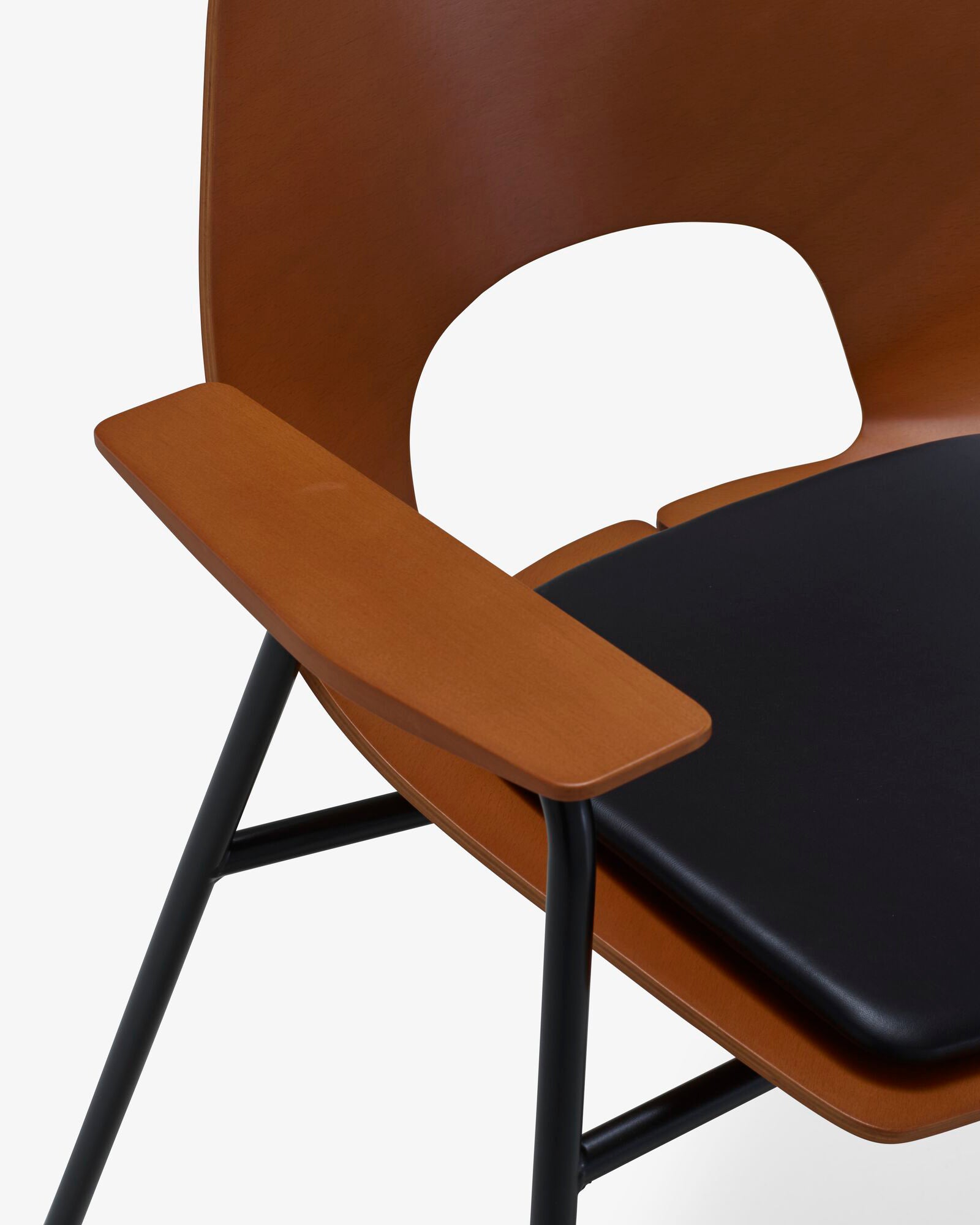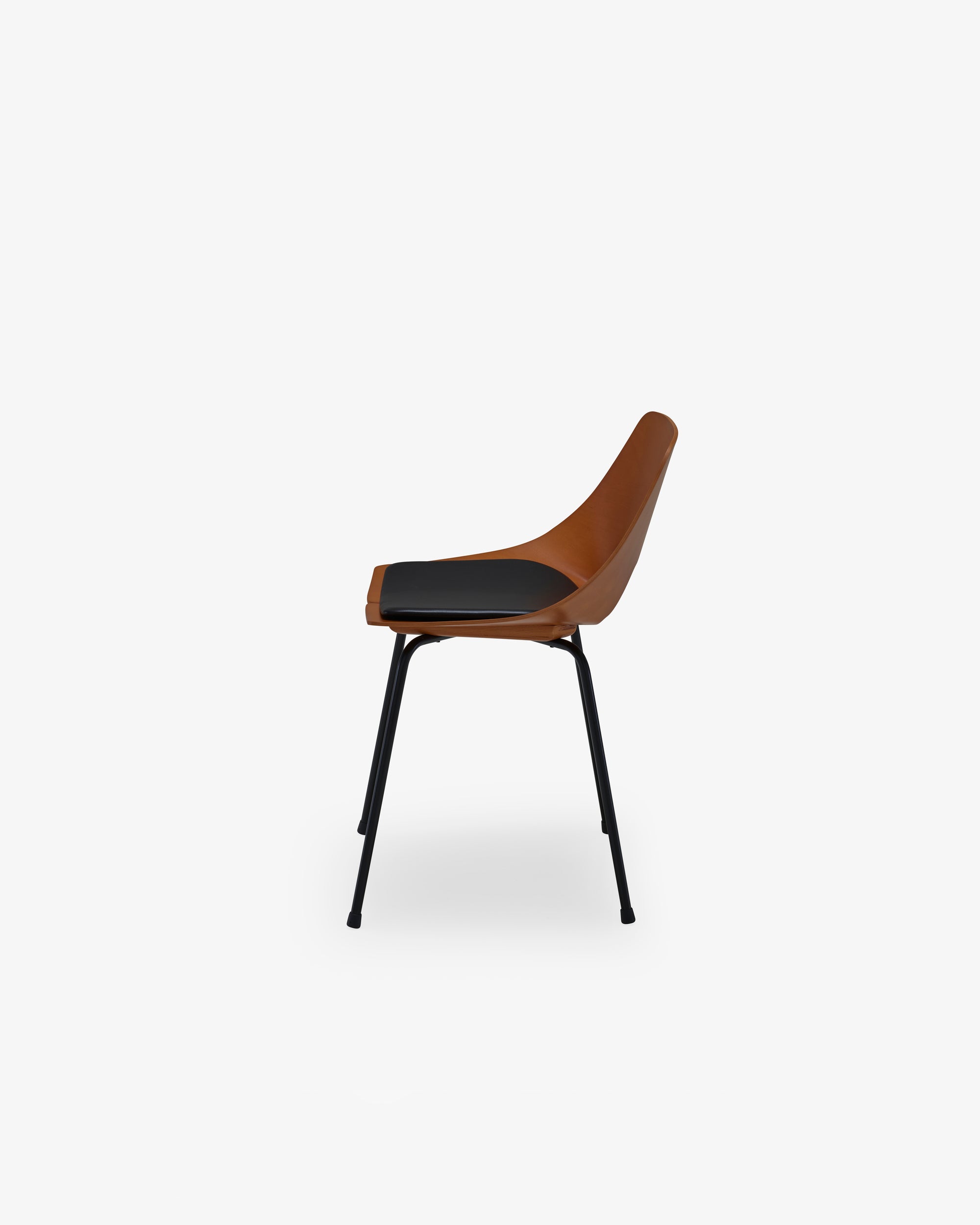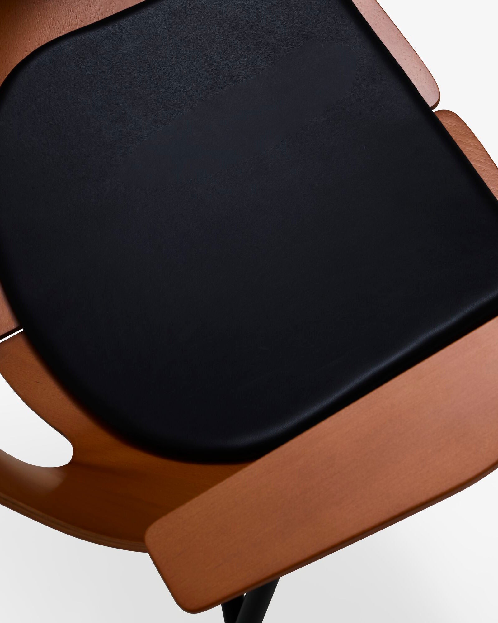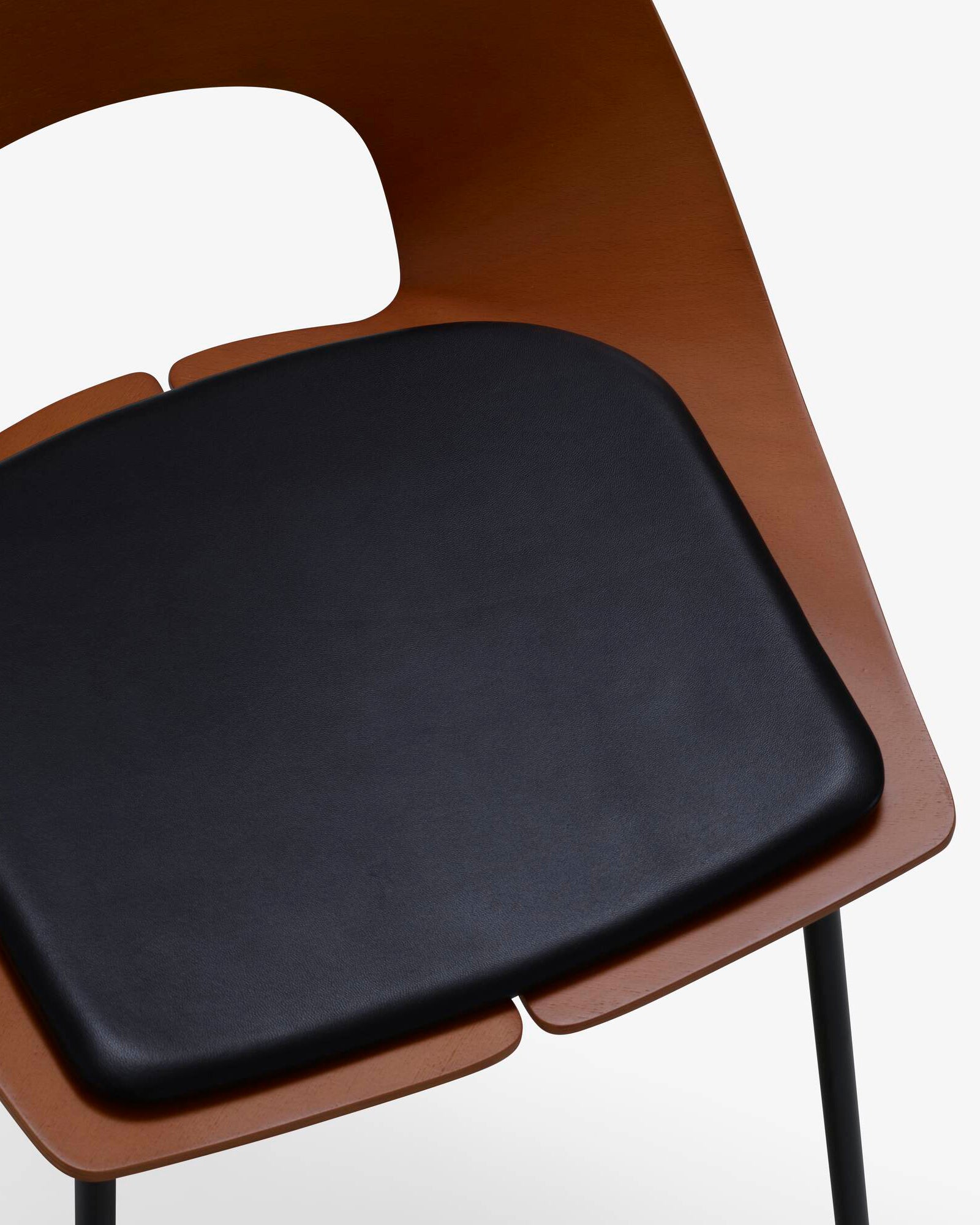 Stolen har en formstøpt kryssfinerkonstruksjon i beiset bøk som gir en omsluttende sitteopplevelse. Den slanke, svarte stålrammen tilfører en moderne letthet, mens den polstrede skinnputen i semianilinfarget geiteskinn gir ekstra komfort. Setehøyden er oppdatert for å passe dagens ergonomiske behov.