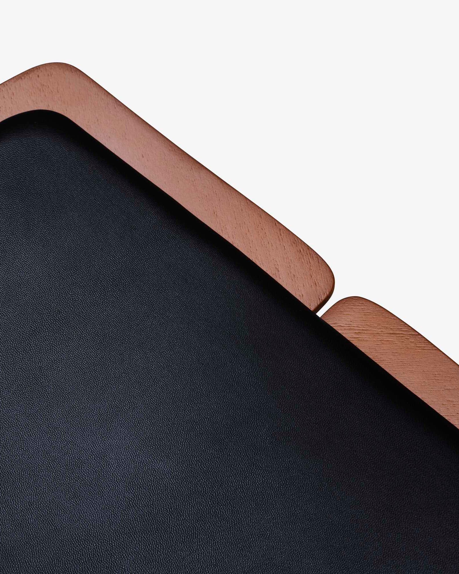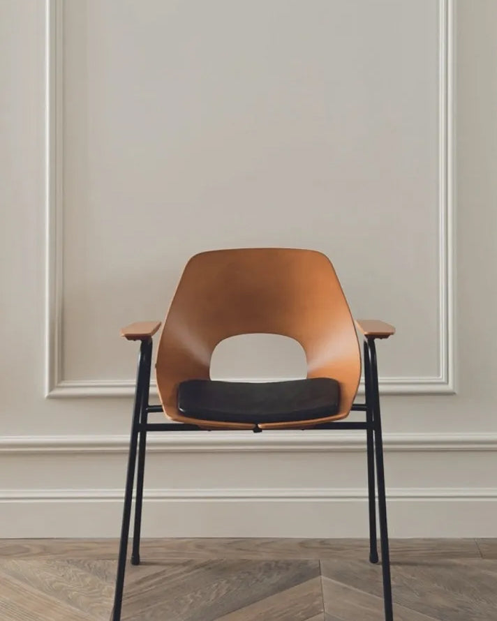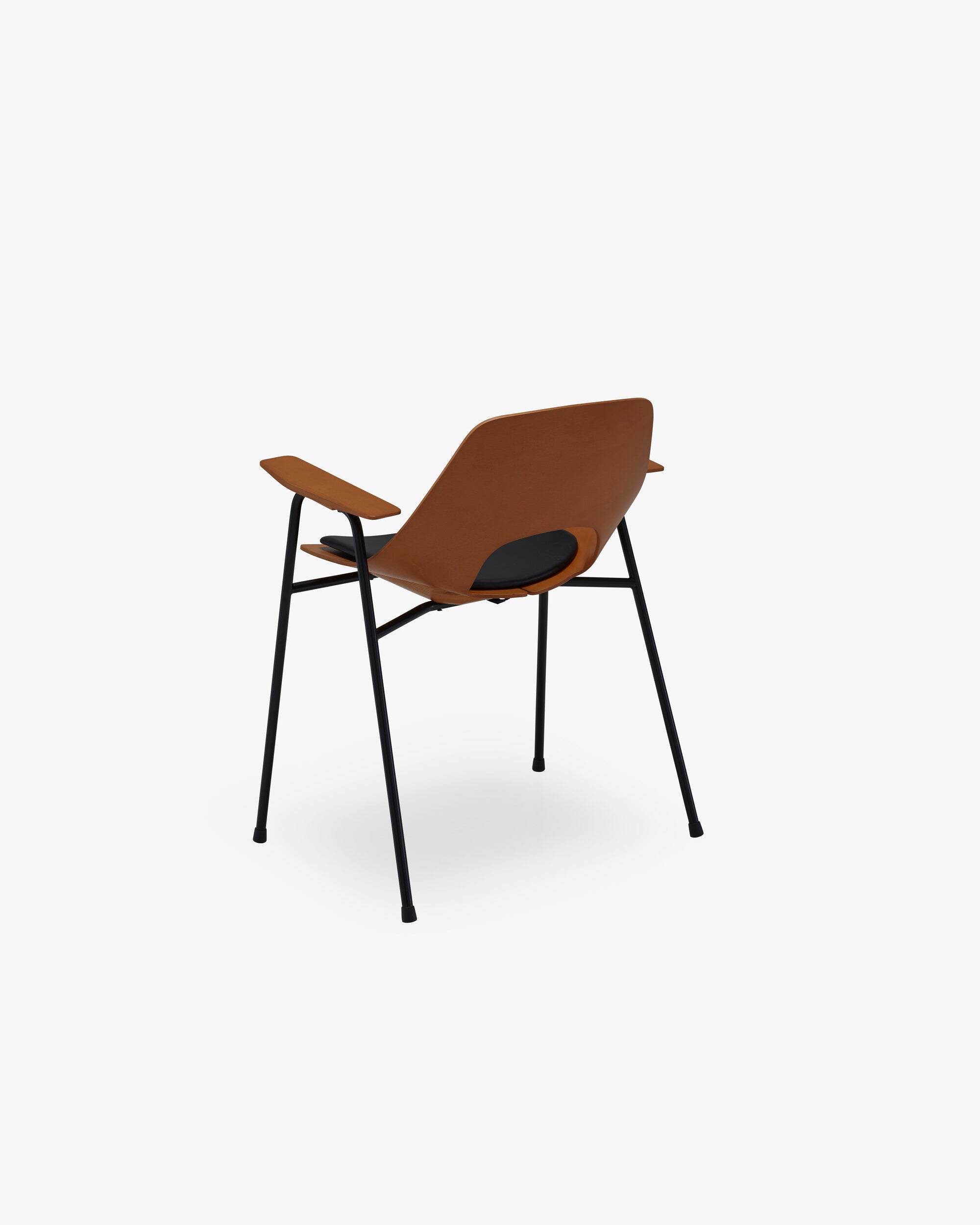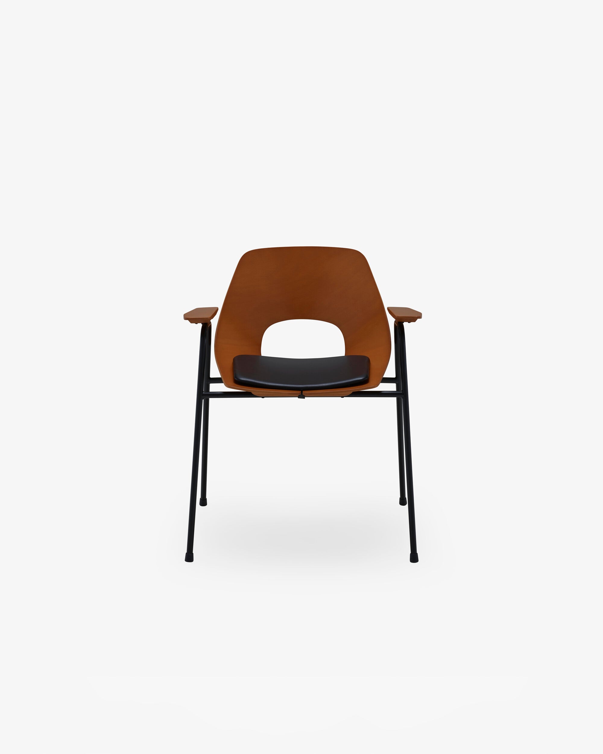 Stolen har en formstøpt kryssfinerkonstruksjon i beiset bøk som gir en omsluttende sitteopplevelse. Den slanke, svarte stålrammen tilfører en moderne letthet, mens den polstrede skinnputen i semianilinfarget geiteskinn gir ekstra komfort. Setehøyden er oppdatert for å passe dagens ergonomiske behov.