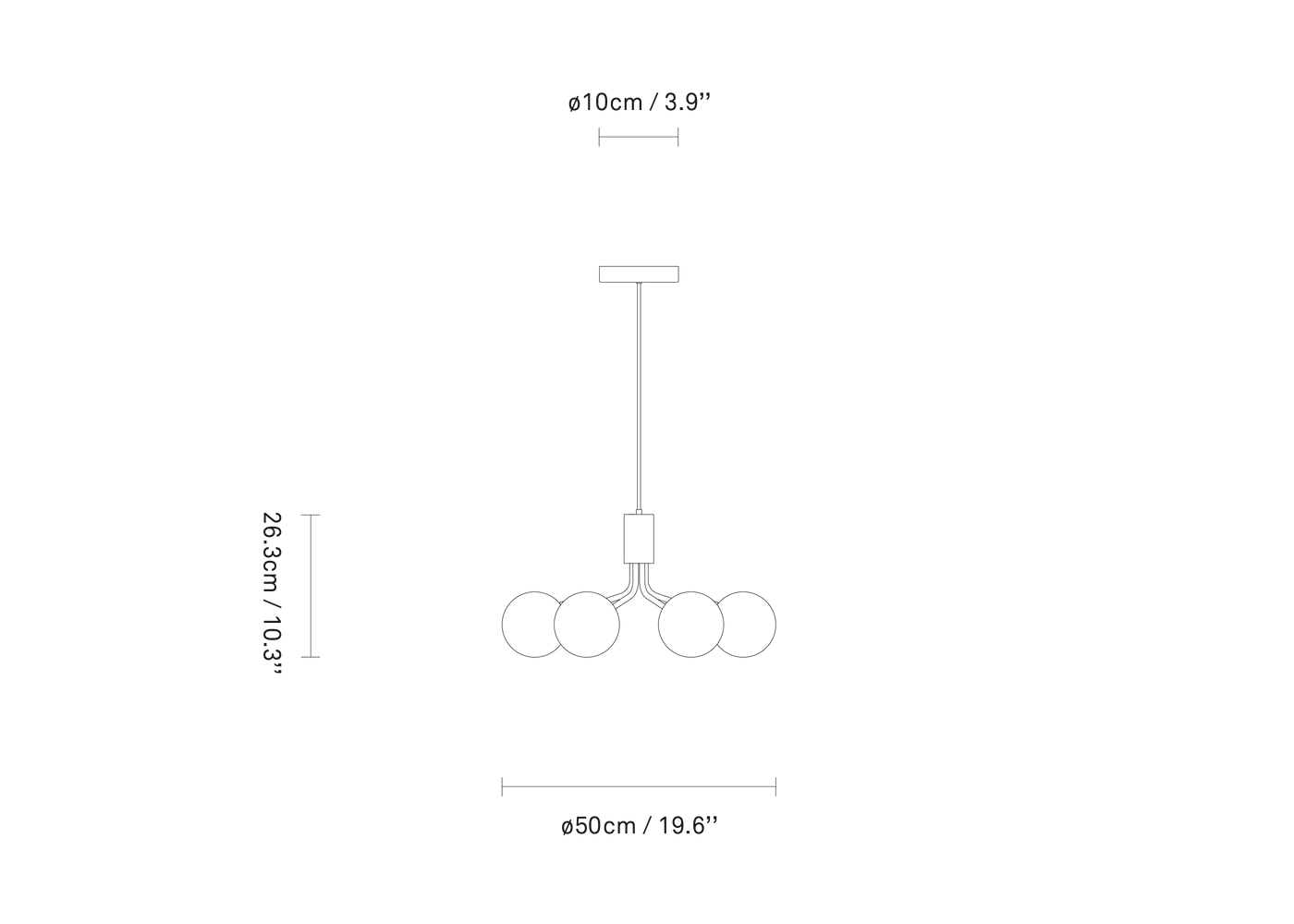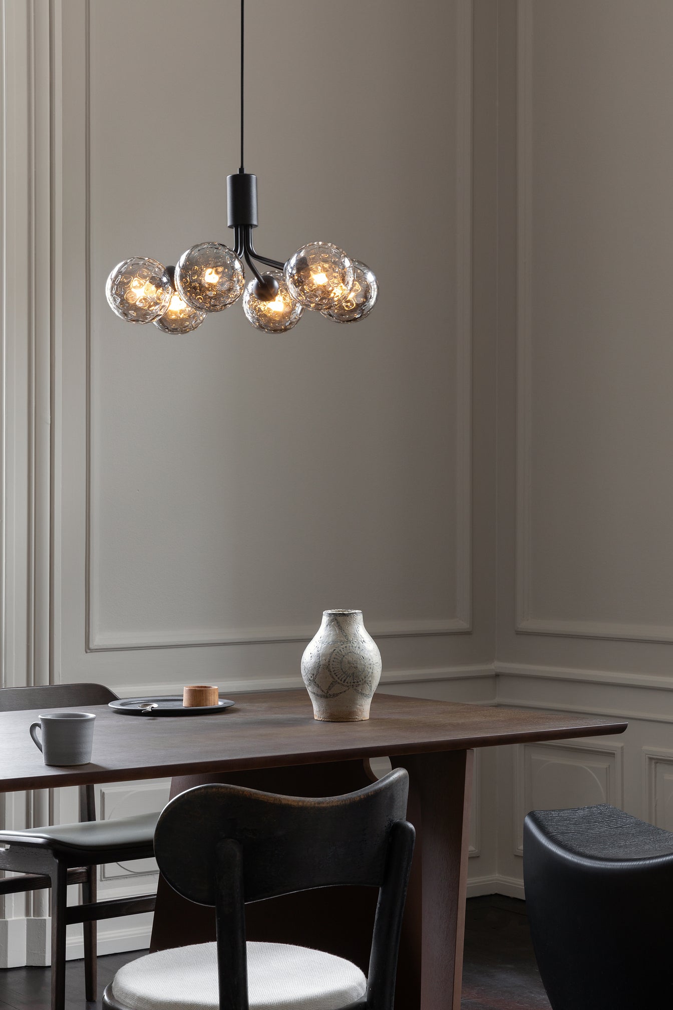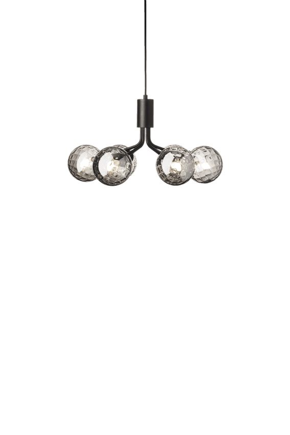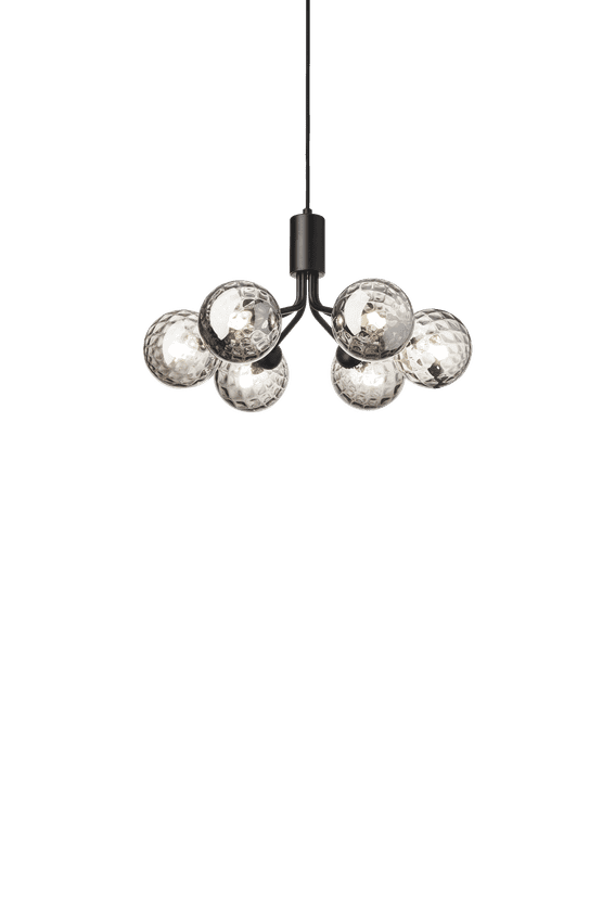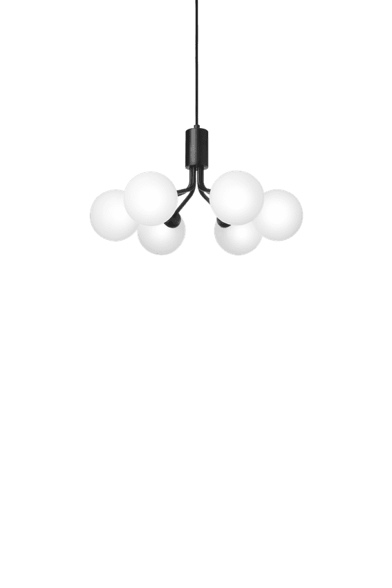 Apiales 6 er en kombinasjon av den klassiske lysekronen og de enkle anhengene fra Apiales-kolleksjonen. Lampen kommer i to forskjellige utførelser, sort og børstet messing med to forskjellige typer lyspærer.