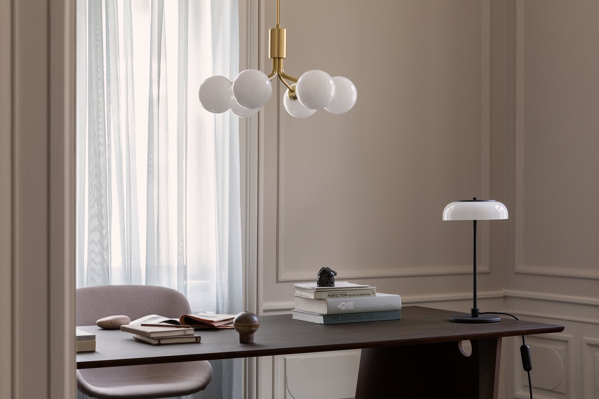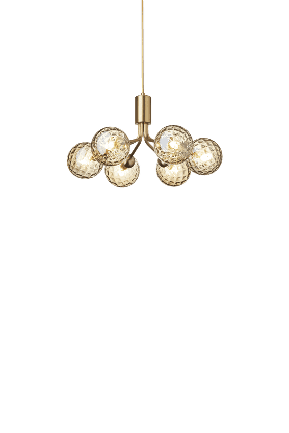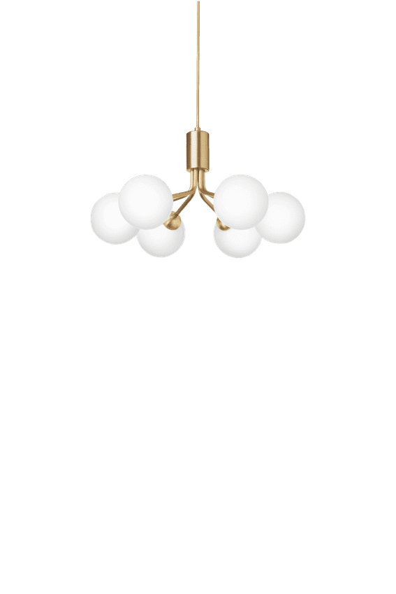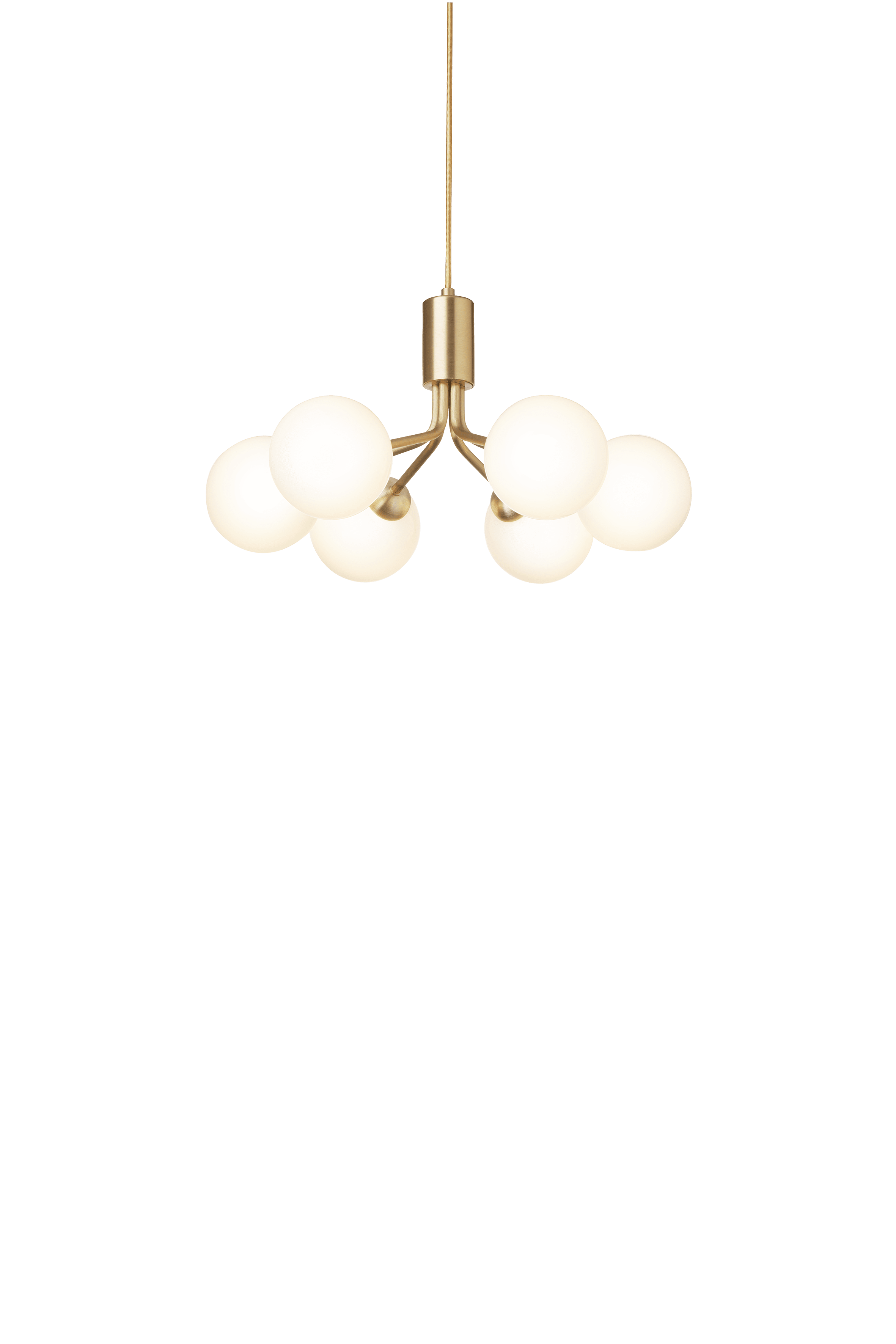 Armene av messing åpner seg til glasskuler som sprer et varmt og innbydende lys. Apiales 6 egner seg godt til spisestuen, over kjøkkenøya eller soverommet, hvor du ønsker en tidløs lysekrone.