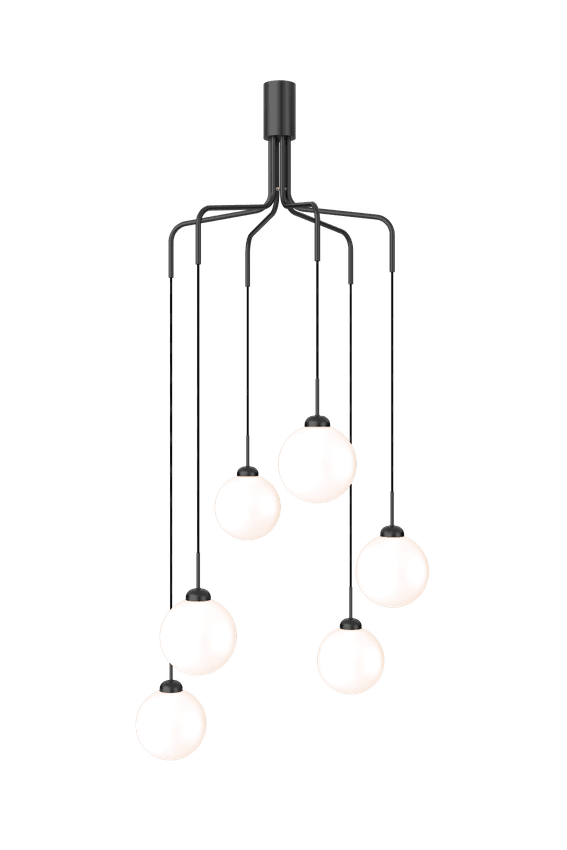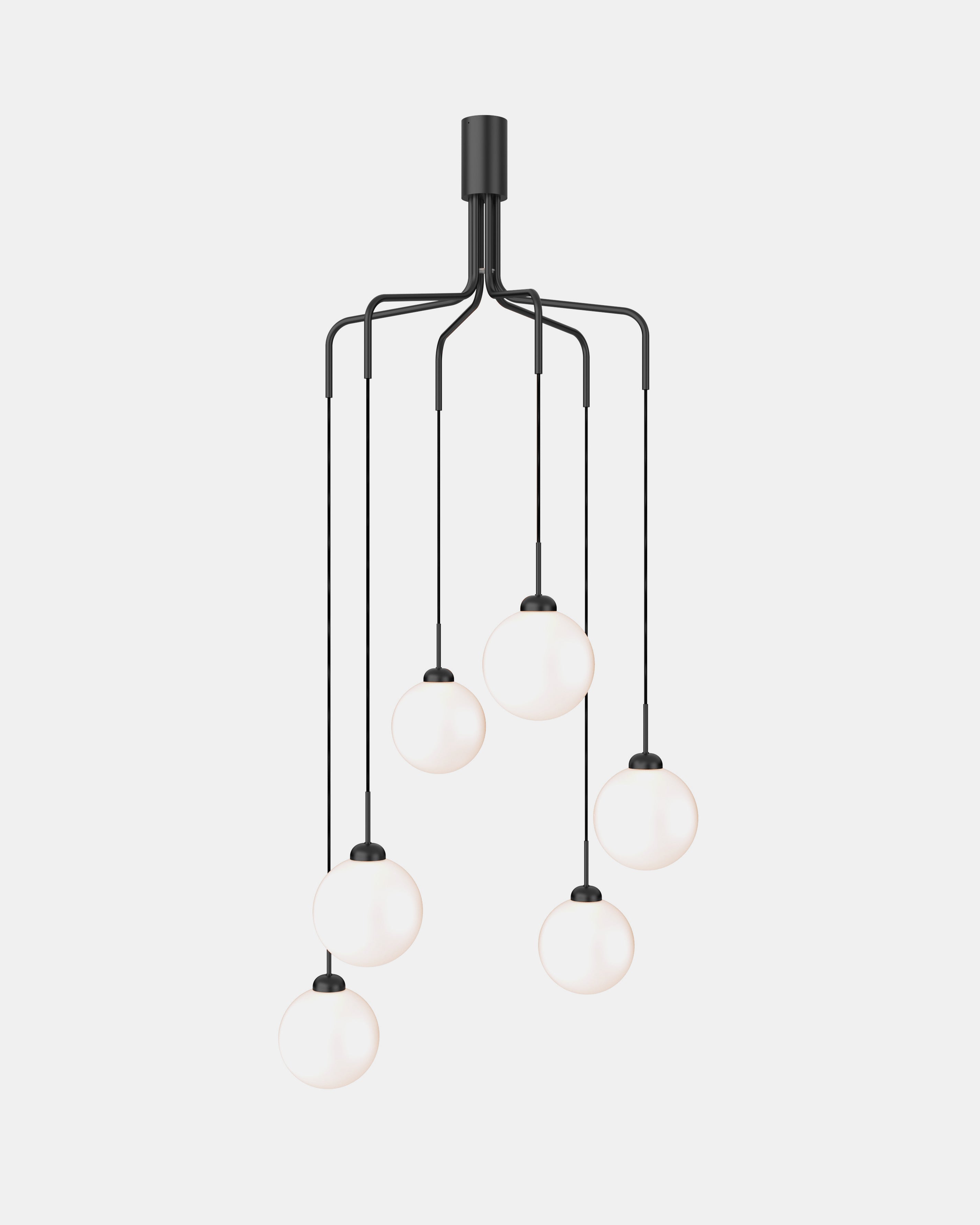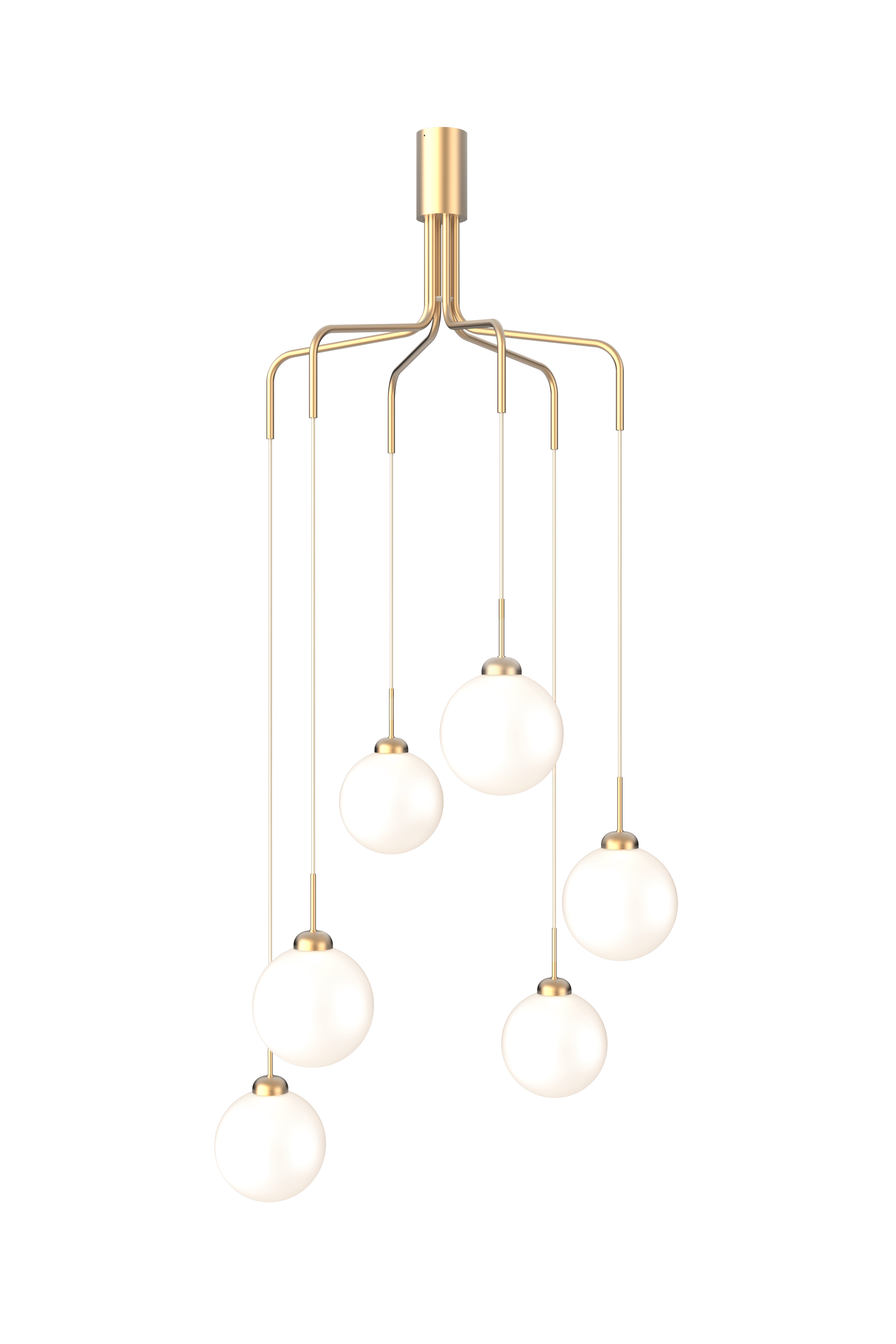 Apiales Cluster 6 er en klyngelysekrone som gir volum og et moderne utseende til rommet. Lysekronen er designet med munnblåste glasskuler som henger ned fra 6 solide metallstenger i messing og krever en viss høyde til taket. Den smale kalesjen kan enkelt monteres på en stukkatur, da den ikke skjuler detaljene i taket og formasjonen kan på de forskjellige anhengene justeres til forskjellige høyder. Plasser Apiales Cluster 6 i rom med stor takhøyde der det ønskes en tidløs lysekrone som gir et innbydende lys.