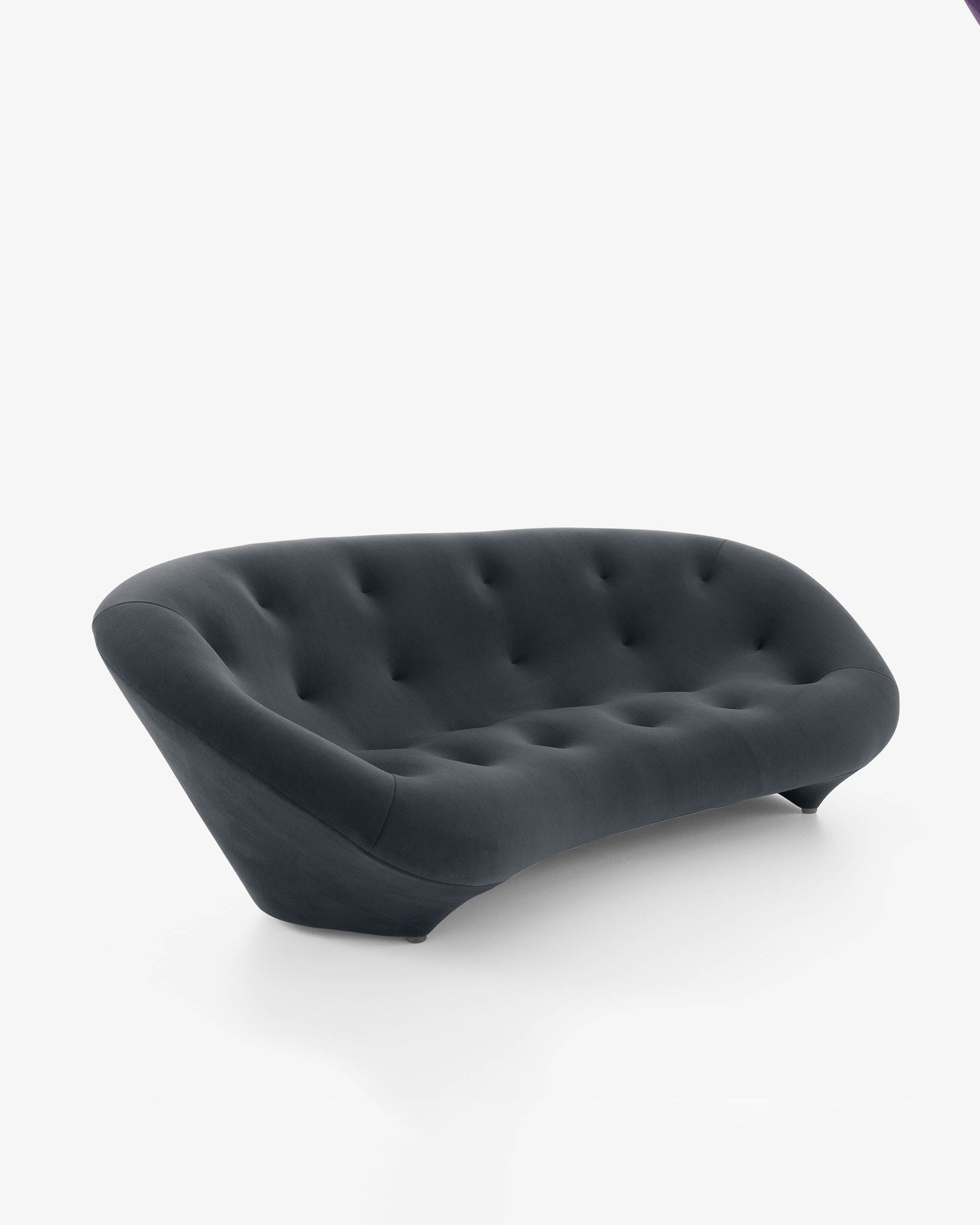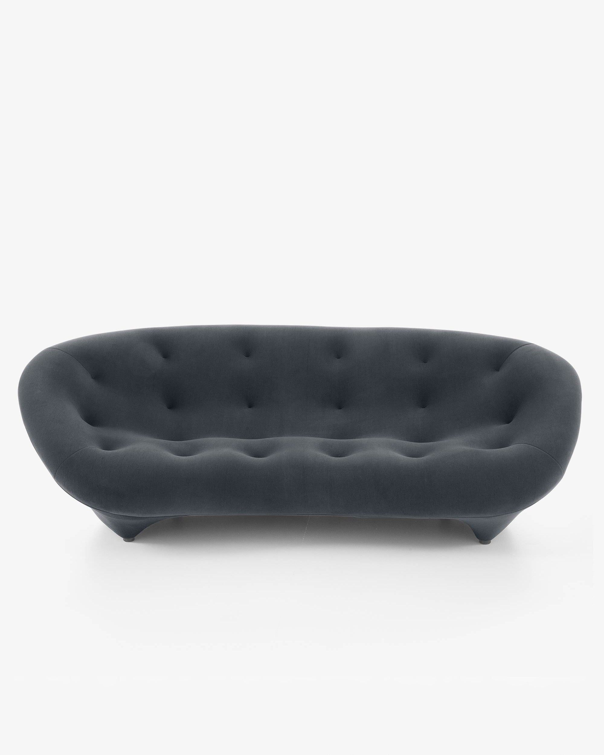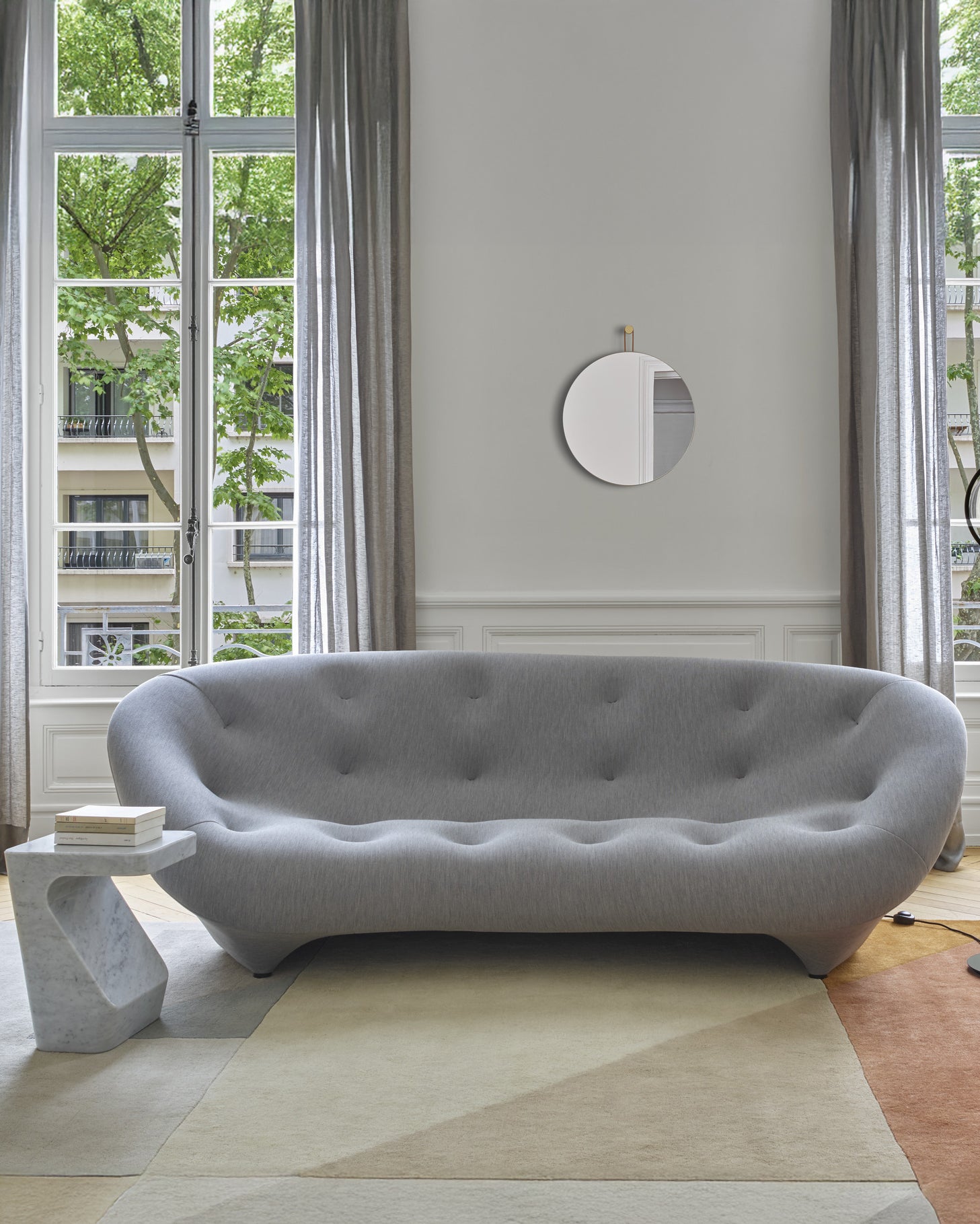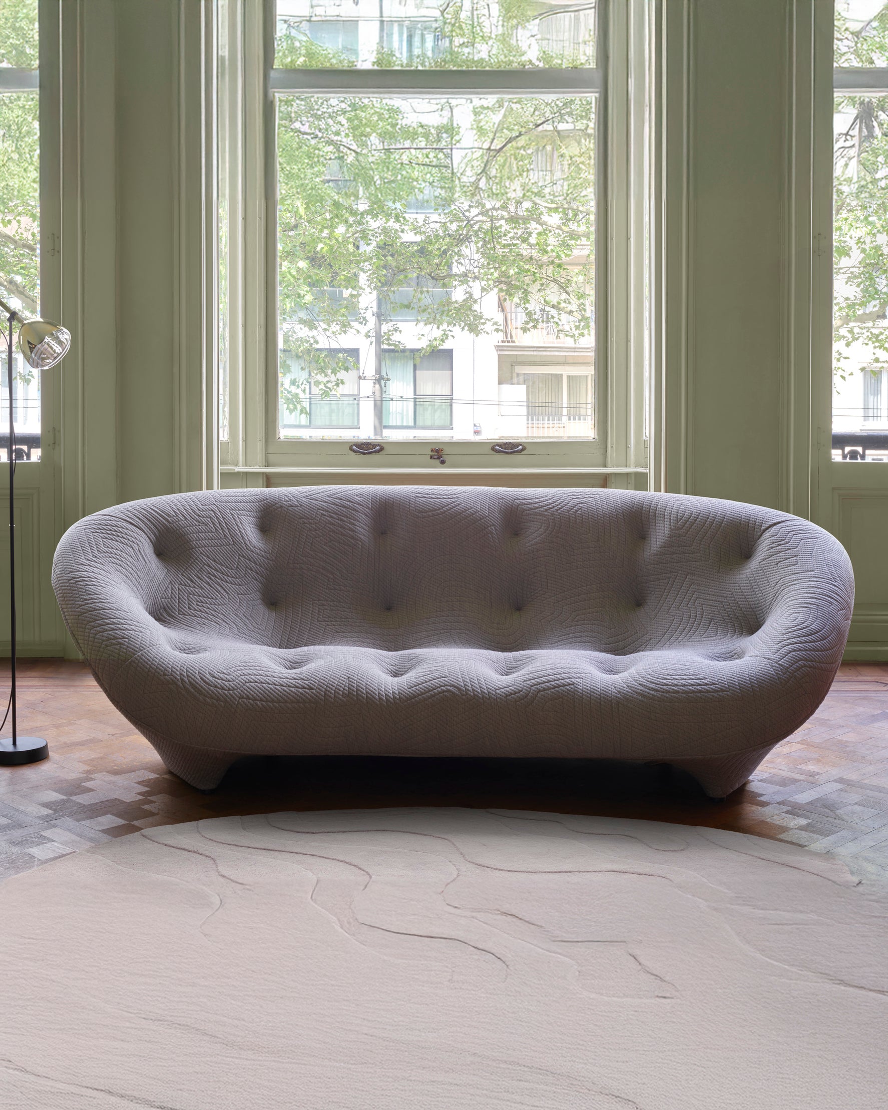 Ploum er resultatet av omfattende forskning på komfort, med en unik kombinasjon av to materialer: et elastisk trekk og ultra-mykt skum. Denne kombinasjonen, sammen med de imponerende dimensjonene til Ploum-sofaene, gir en eksepsjonell komfort som tilpasser seg ulike måter å sitte, strekke ut eller ligge på. Den store sofaen har et asymmetrisk design, med en litt høyere rygg på høyre side og et dypere sete på høyre side. Zippene på ryggputen er bevisst off-senter, som en del av designerens visjon.