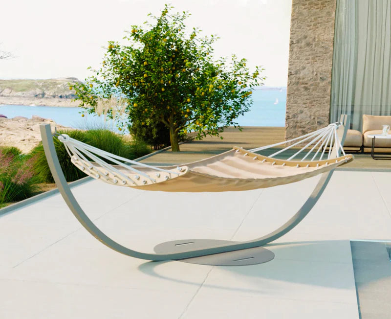 Sunbrella Hammock Frame er en solid stålramme laget av pulverlakkert rustfritt stål, designet for å henge opp din doble hengekøye. Dens værbestandige konstruksjon gjør den ideell for utendørs bruk året rundt.