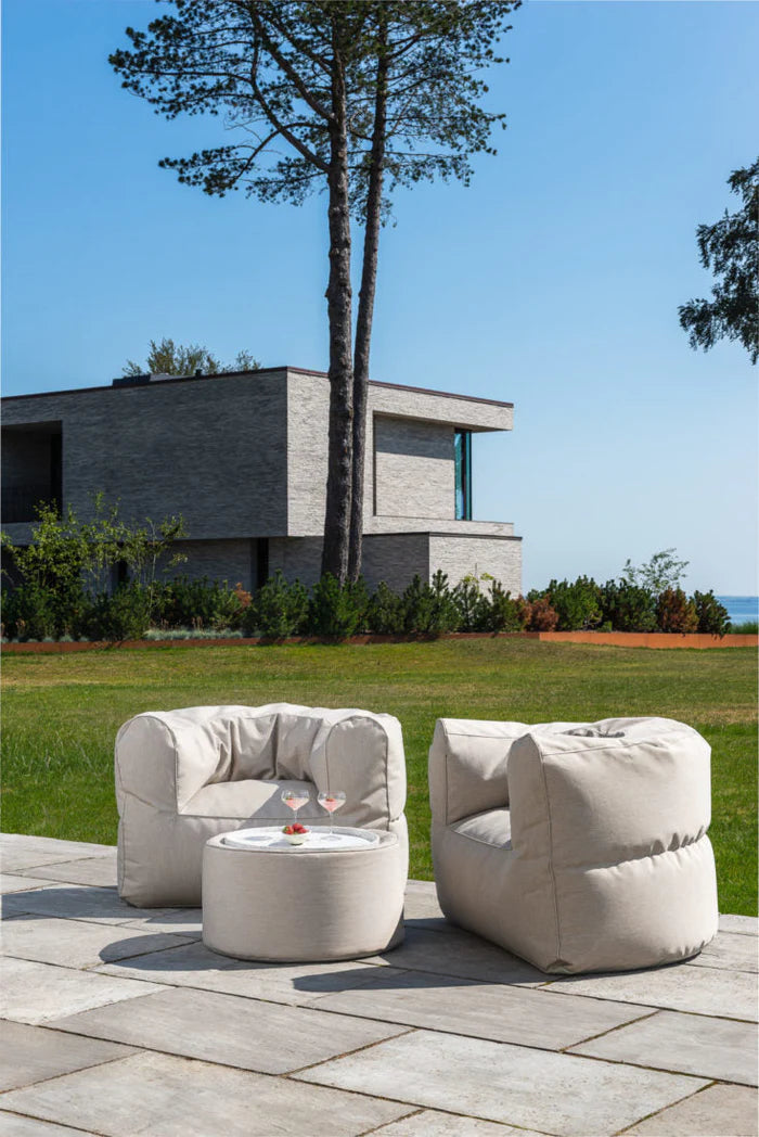 Som en beanbag tilbyr Full Moon Sunbrella-puffen et avslappet utseende som passer til en utendørs livsstil. Fyllingen består av 25 % resirkulert EPS og 75 % nye EPS-perler av høy kvalitet, som former seg etter kroppen din, gir ergonomisk støtte og har en isolerende effekt. Du kan justere mykheten ved å fjerne eller legge til perler fra bunnåpningen.