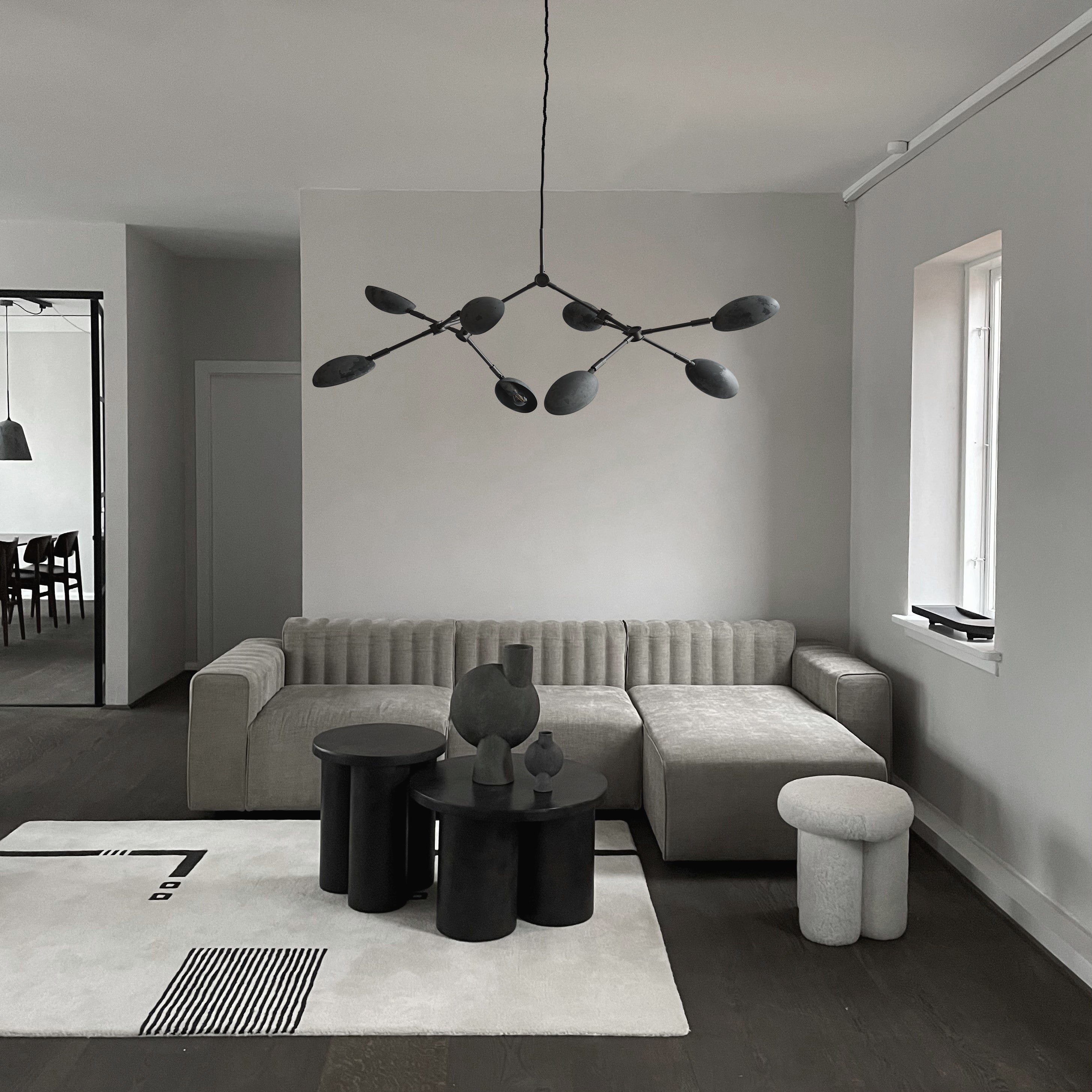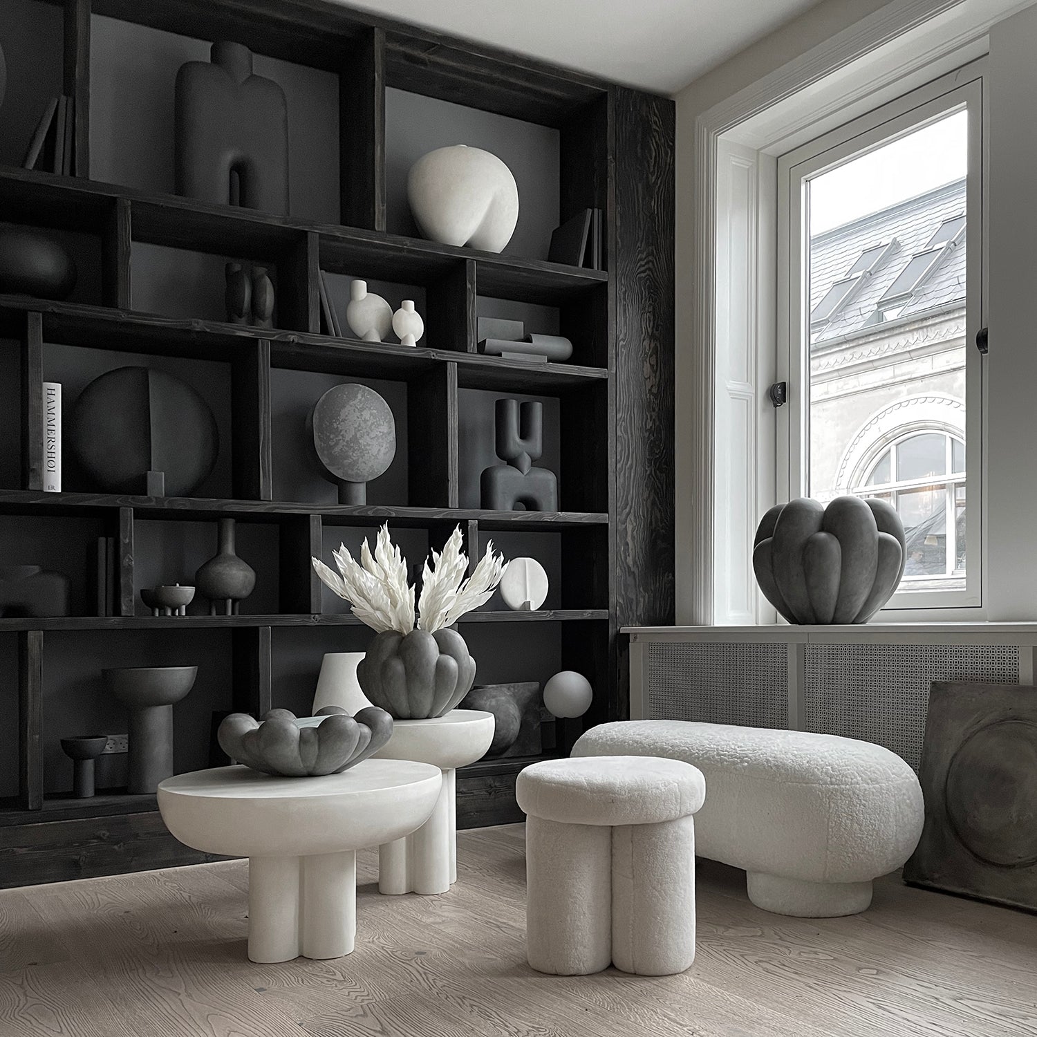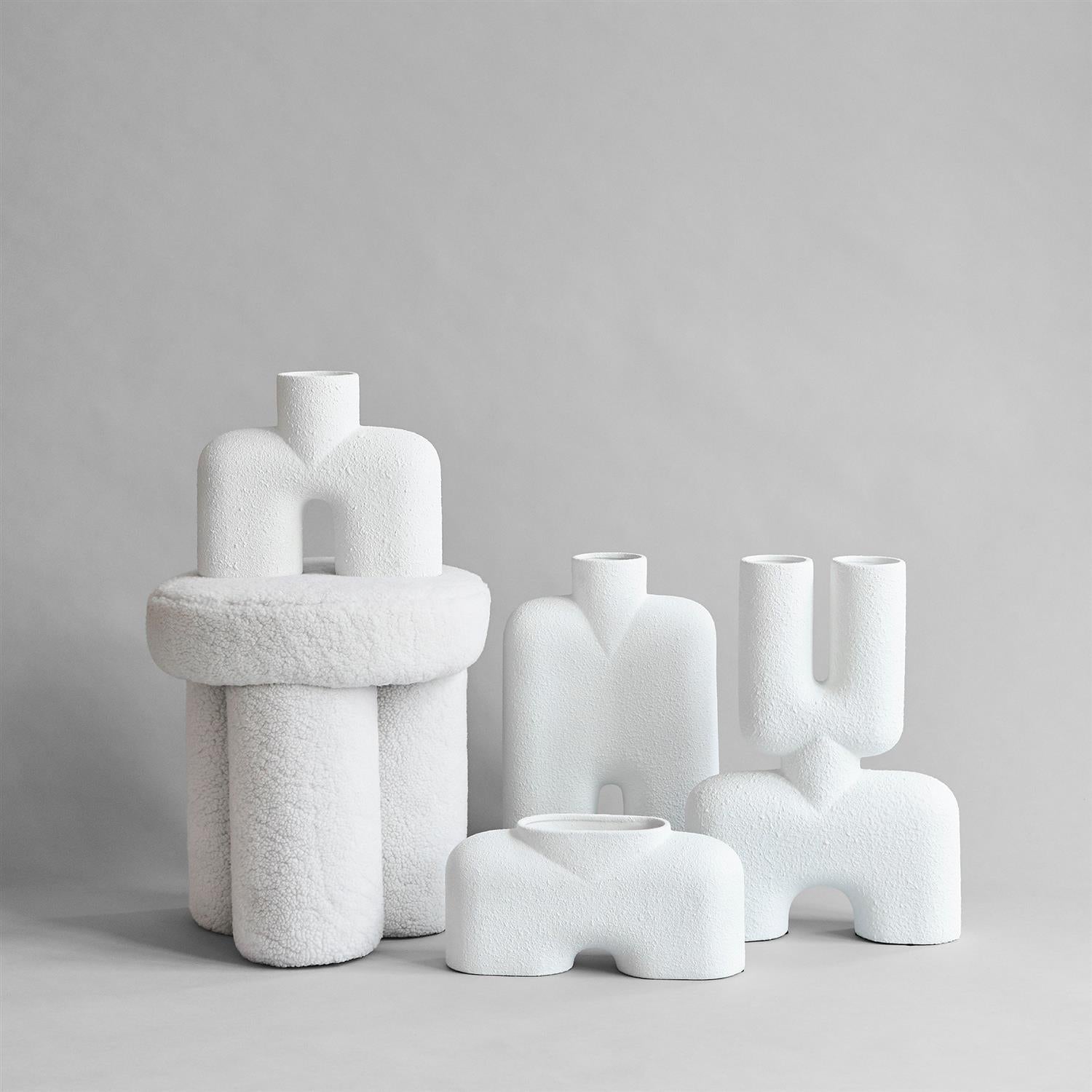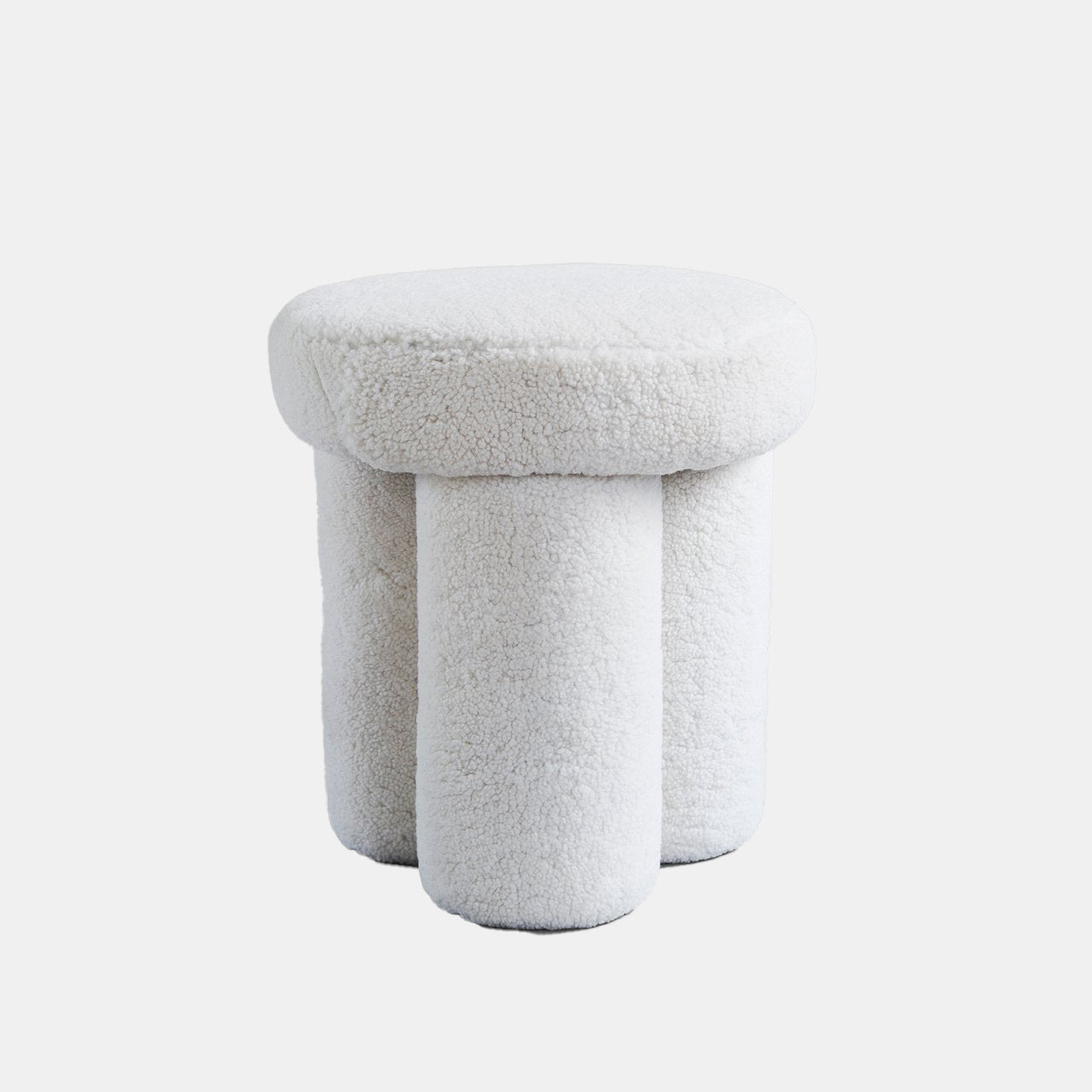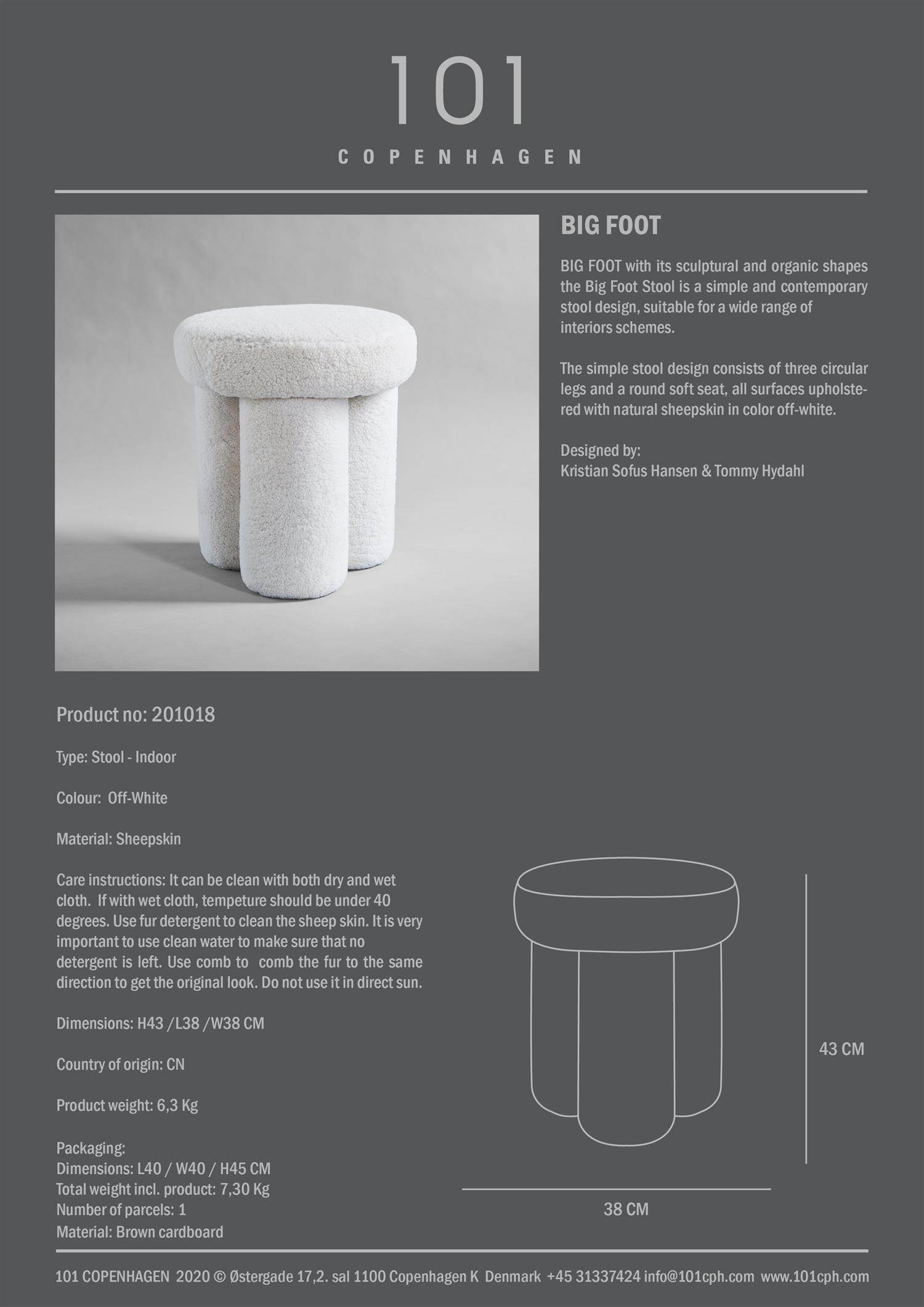 Big Foot puffen fra 101 Copenhagen er et enkelt og moderne møbel som er egnet for et bredt spekter av stiler. Den skulpturelle puffen består av tre sirkulære ben og et rundt mykt sete, der alle delene er polstret med naturlig saueskinn i off-white.