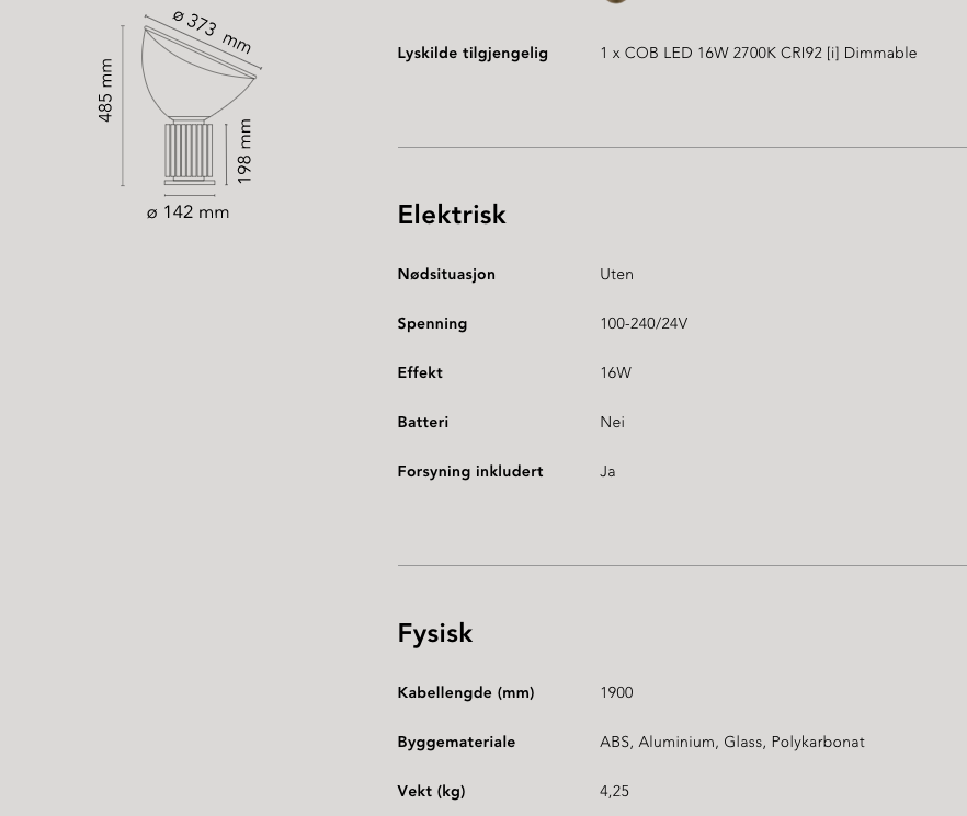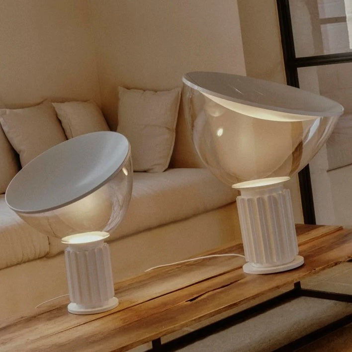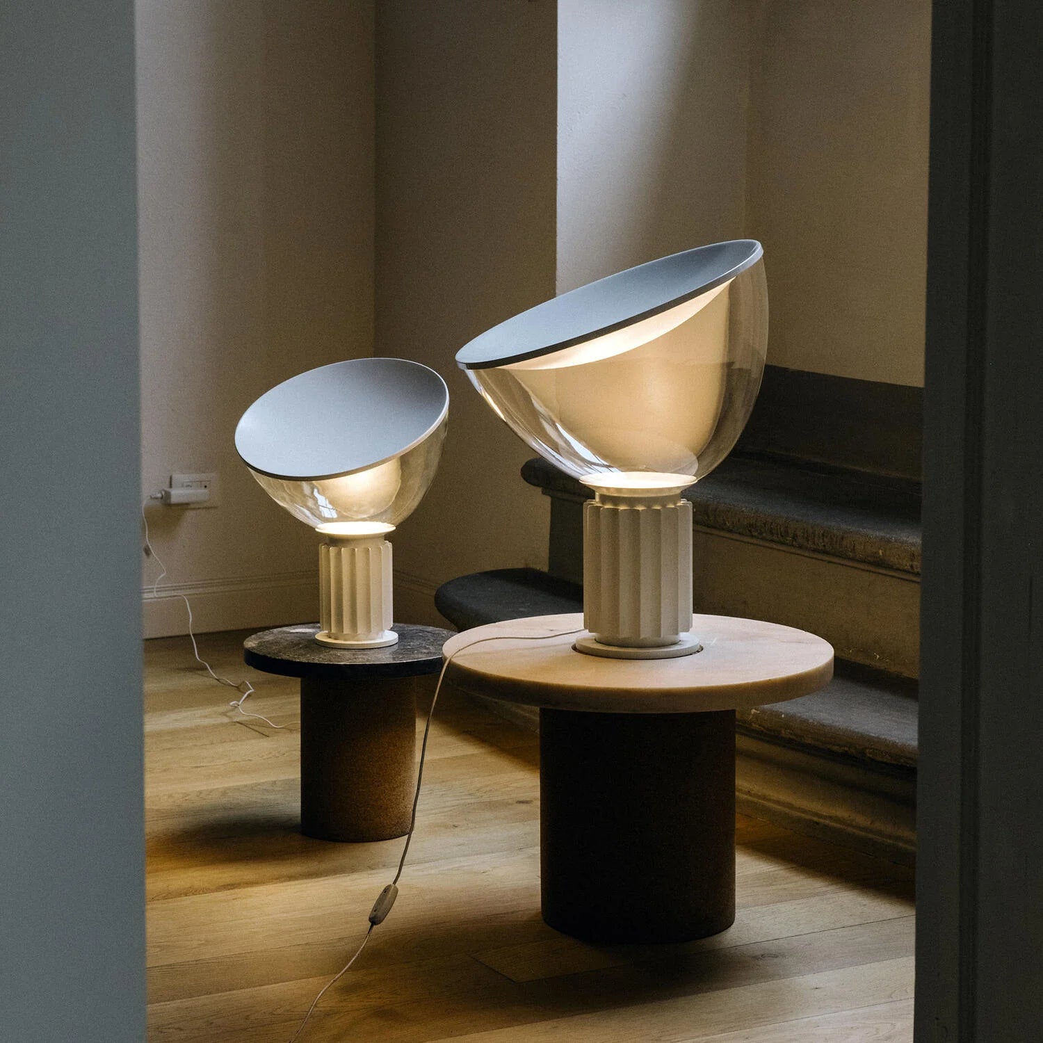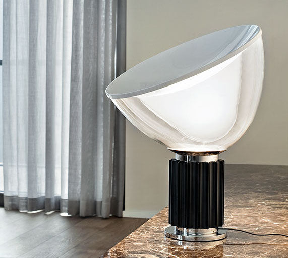 Bordlampe som gir direkte og reflektert belysning.Reflektor i malt aluminium, blank hvit på utsiden og matt hvit på innsiden. Skjerm som kan stilles inn i flere retninger, i gjennomsiktig blåst glass. Hoveddel i matt svart eller naturlig anoidisert ekstrudert aluminium. Sokkel i nikkelbelagt ABS+PC. Strømledning med nyttelengde på 190 cm, med dimmebryter for PÅ/AV og justering av lysstyrken til mellom 10–100 %. Kontakt til strømforsyning med utskiftbare plugger.