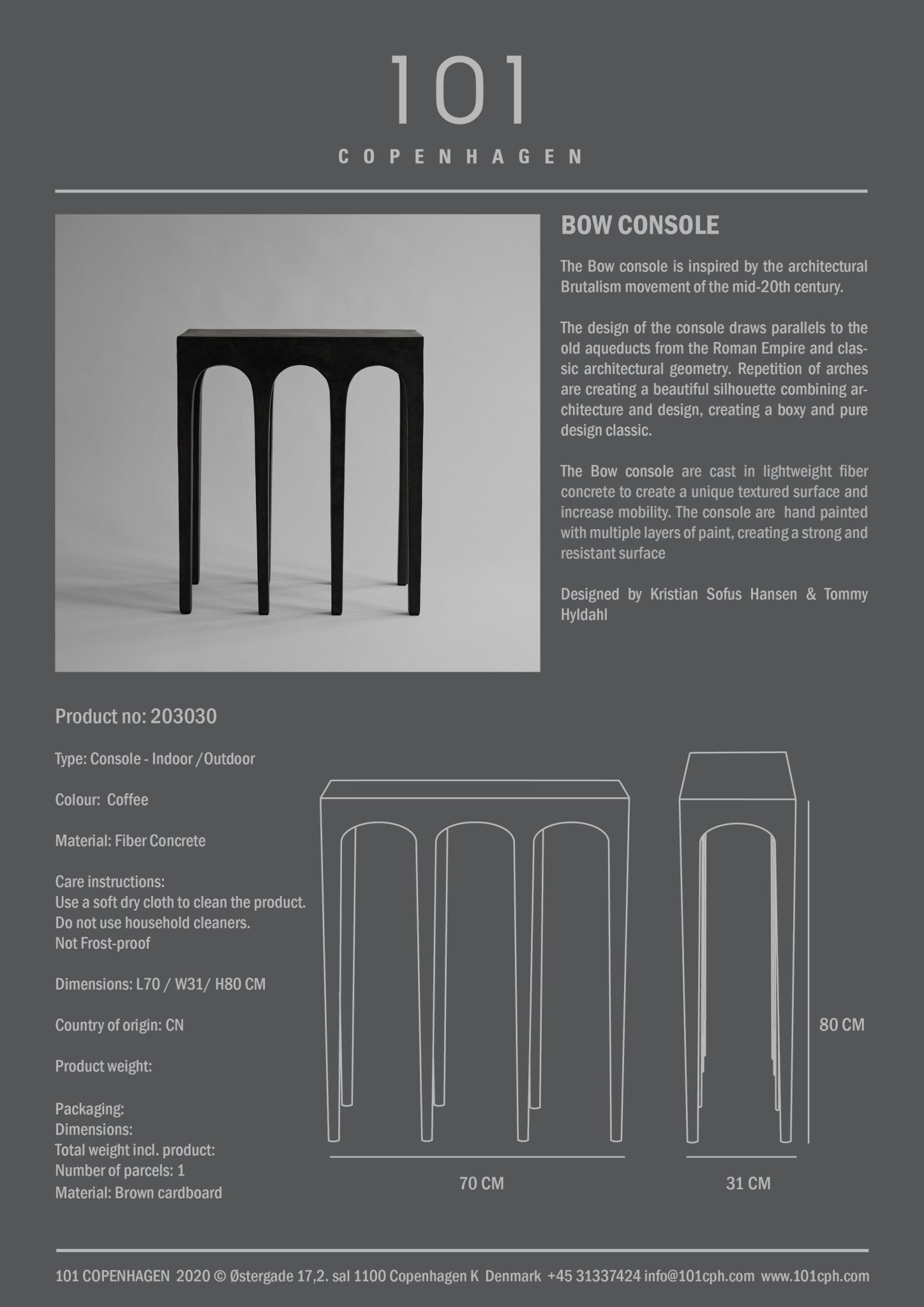 Denne kolleksjonen består av to størrelser konsollbord sammen med en benk, og tilbyr allsidige alternativer som sømløst smelter sammen med ethvert interiør. Bow-serien er unnfanget av de visjonære sinnene til Kristian Sofus Hansen & Tommy Hyldahl, og er en harmonisk blanding av form og funksjon, som styrker statusen som et slående tillegg til moderne design.