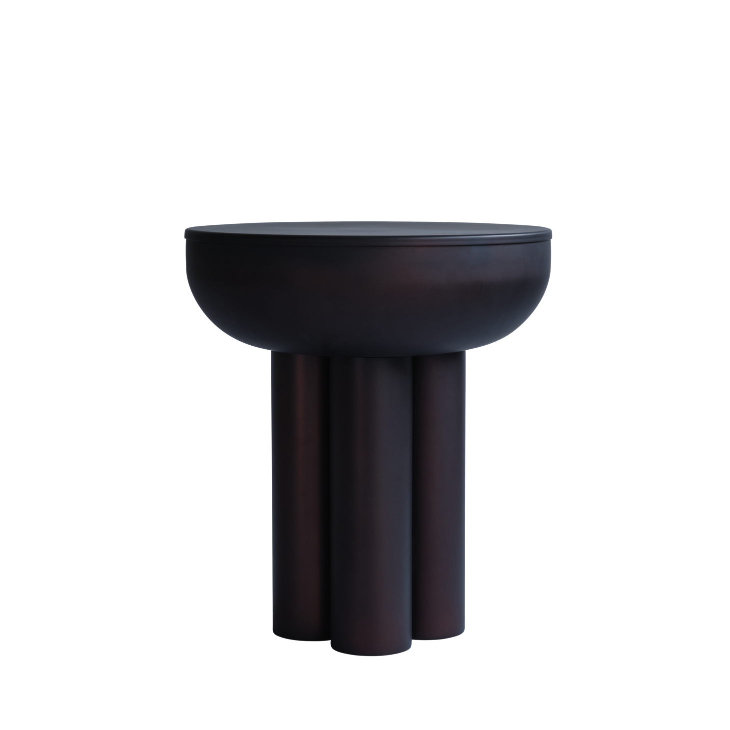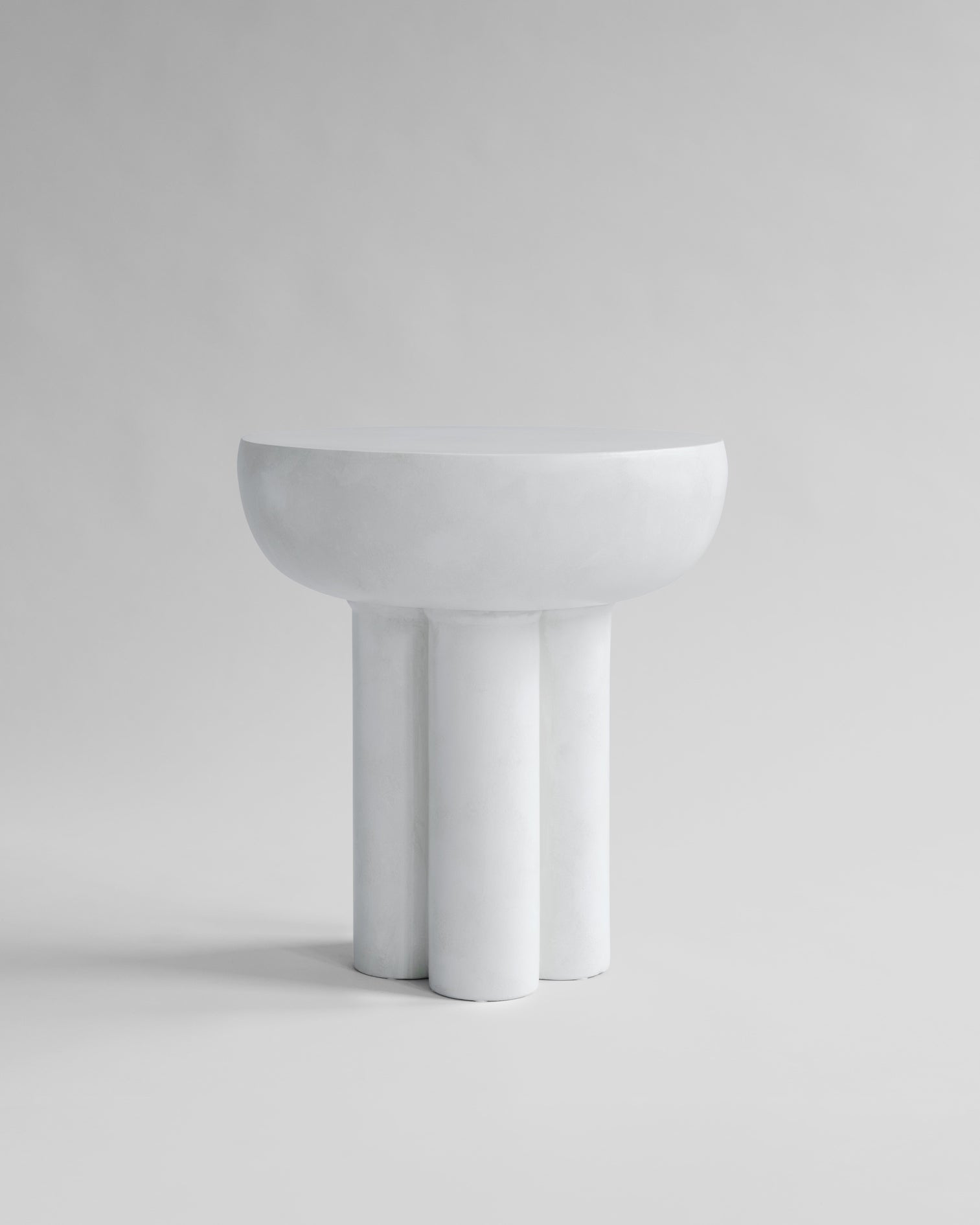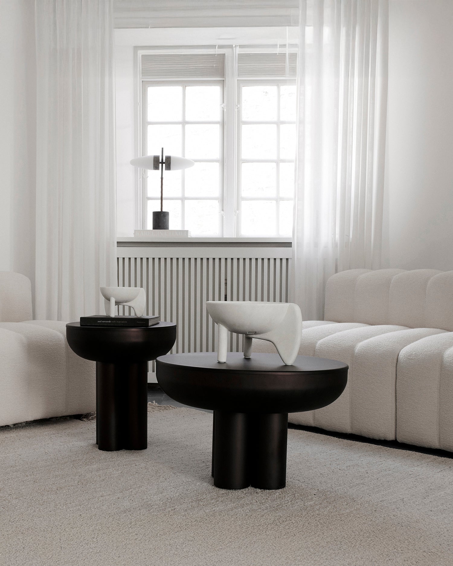 Samlingen av bord med tittelen Crown er støpt i ett stykke formet som en sirkulær bordplate båret av fire sylinderformede ben. Bordet står sterkt og stolt, og er inspirert av de nakne, strukturelle elementene i brutalistisk arkitektur, som hyller søylene og unngår en holdning til for mange detaljer. Bordet finnes i to størrelser og kan brukes som enkeltstående sidebord eller stå sammen som et par salongbord.