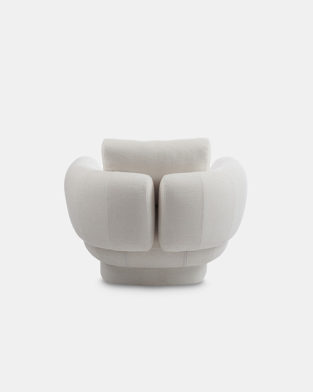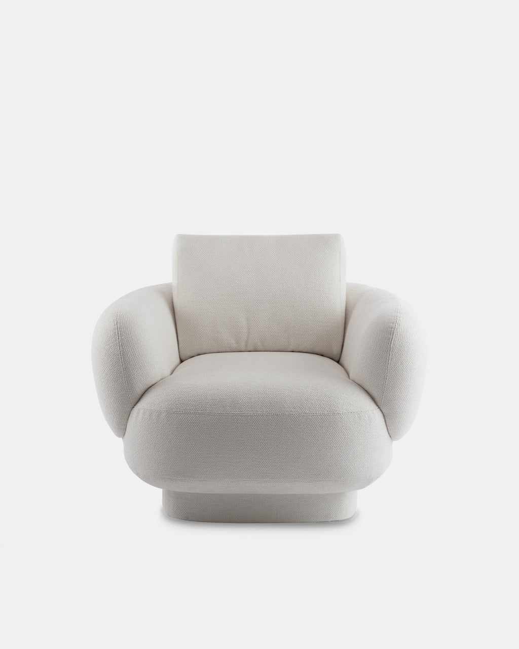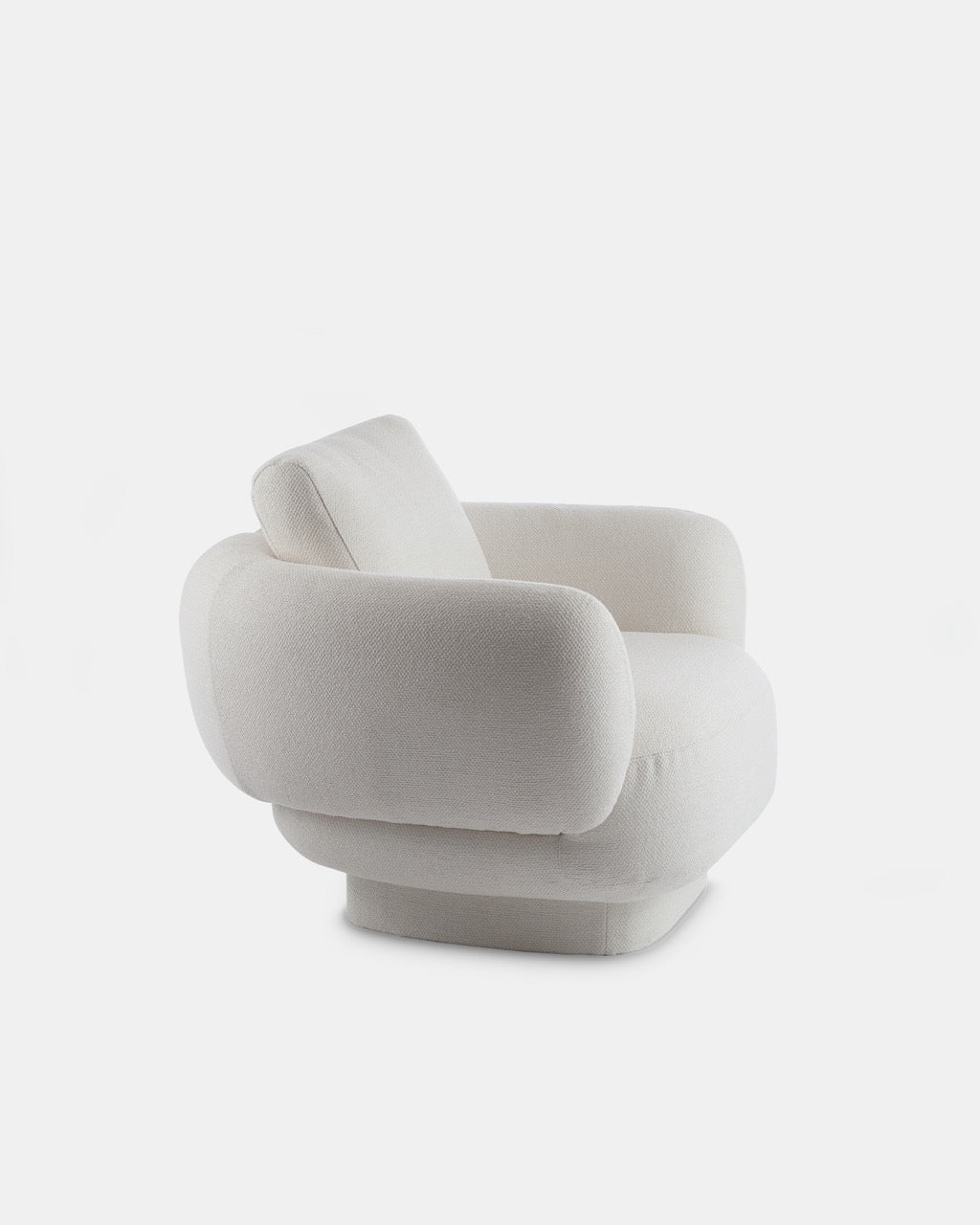 De myke, avrundede formene til Anam-lenestolen virker nærmest skulpturert i luften – hvilende på søyler som om de tilhører en parallell verden, preget av balanse og harmoni.