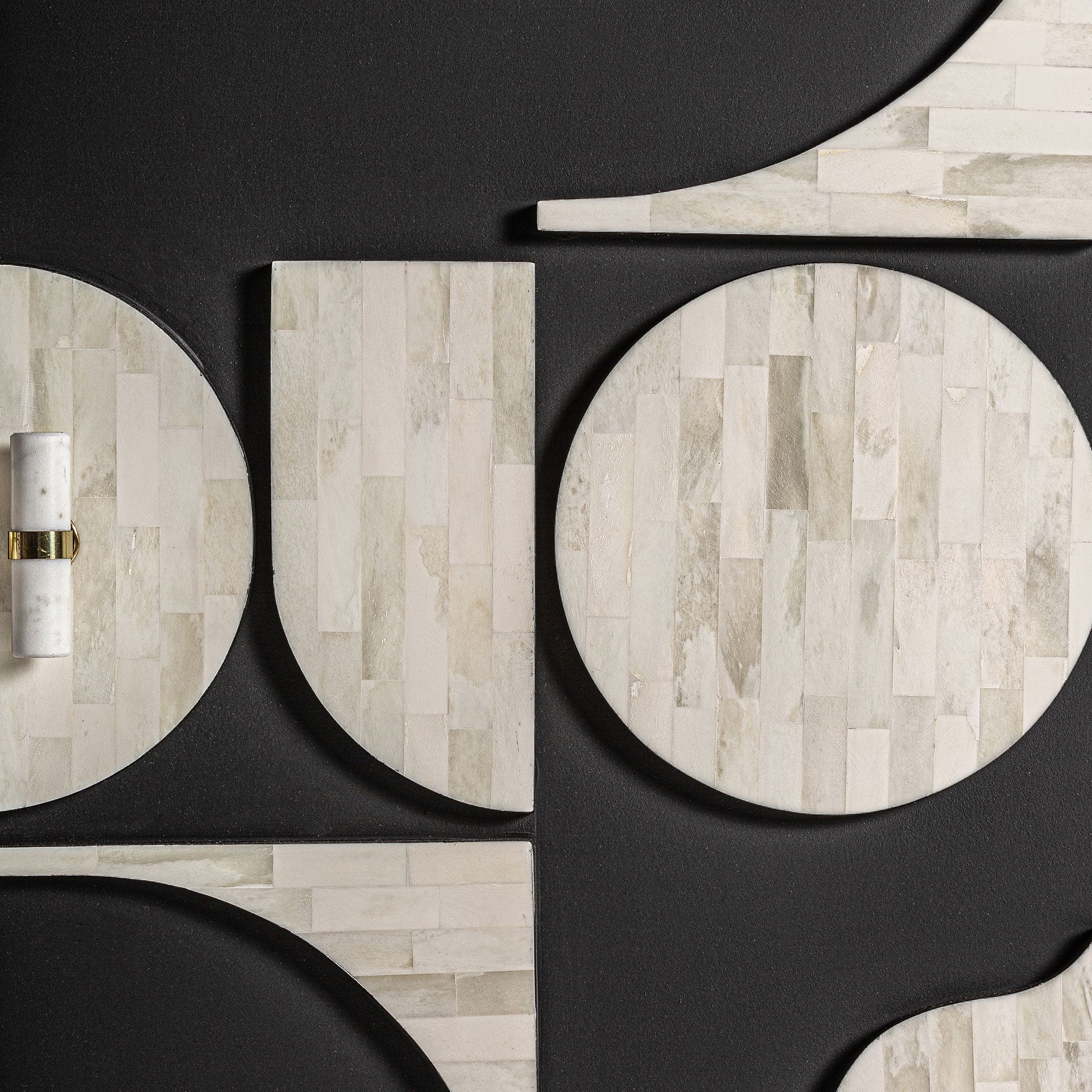 Materiale: mdf-tre i sort, kombinert med bein i hvitt og jern.