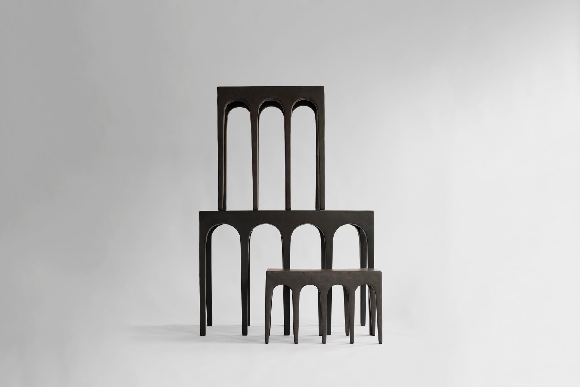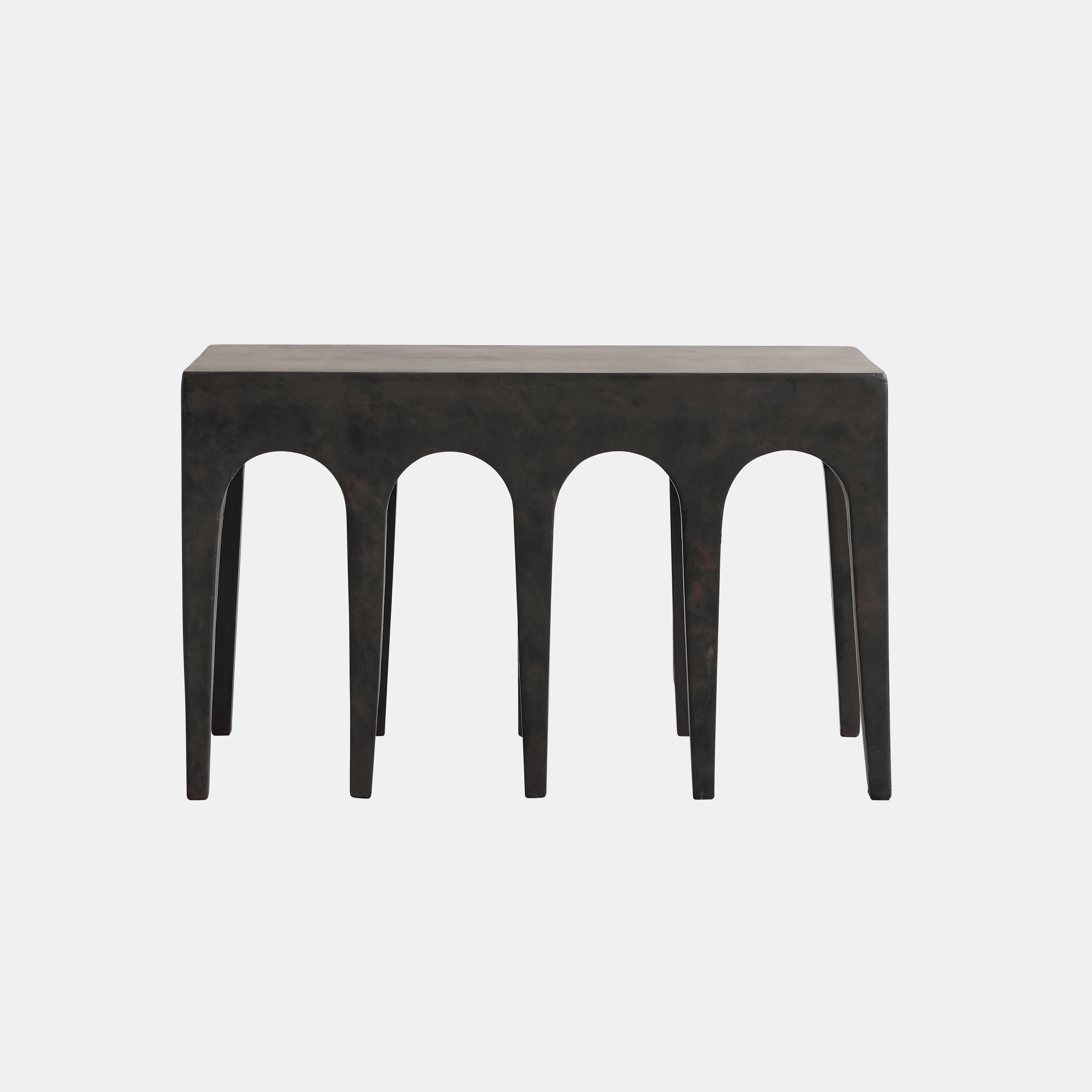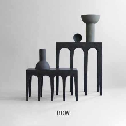 Som et stykke arkitektur på avveie, trekker Bow-konsollbordet paralleller til de gamle akveduktene fra Romerriket og klassisk arkitektonisk geometri. Repetisjon av buer skaper en vakker silhuett og de lange bena gjør at den virker smal og lett selv om karakteren er alt annet enn ubetydelig. Benken er støpt i lett fiberbetong for å skape en unik strukturert overflate og øke mobiliteten. Den er håndmalt med flere lag maling, noe som skaper en sterk og motstandsdyktig overflate. Designet av Kristian Sofus Hansen & Tommy Hyldahl.