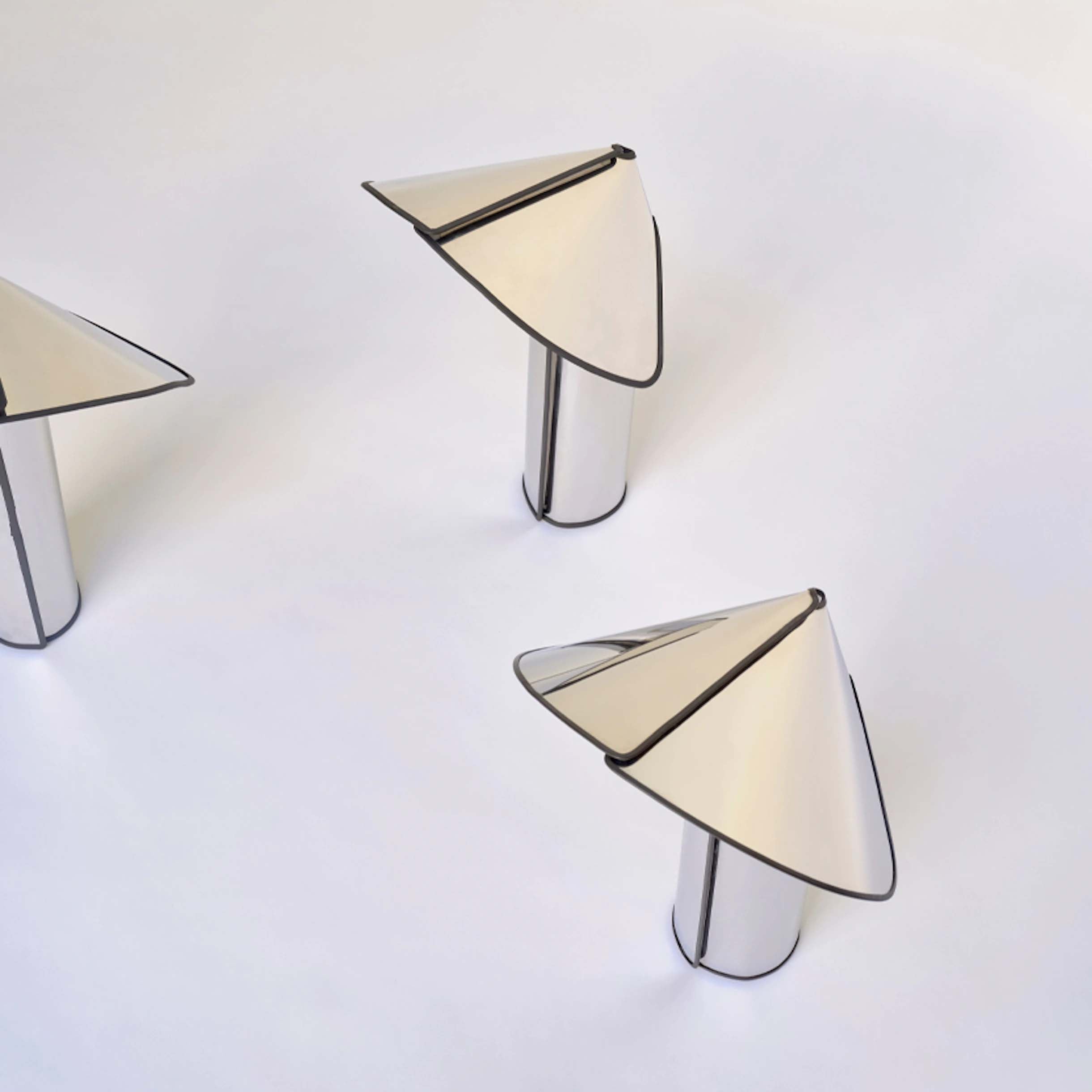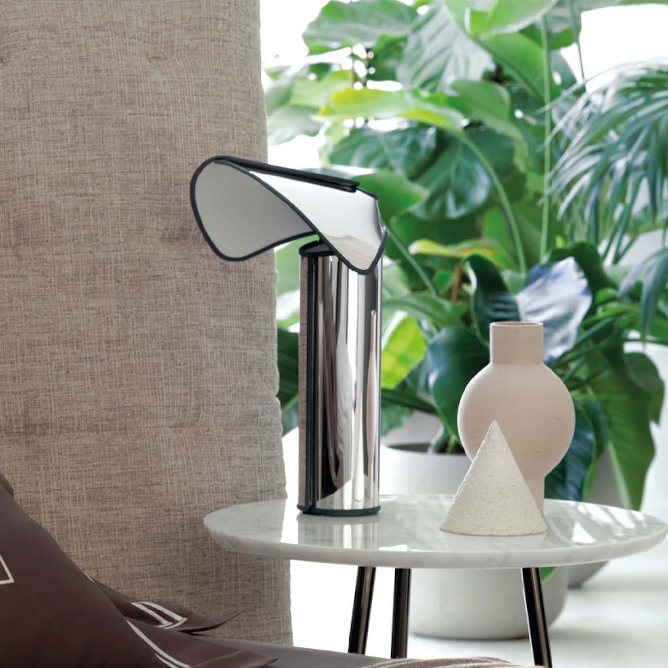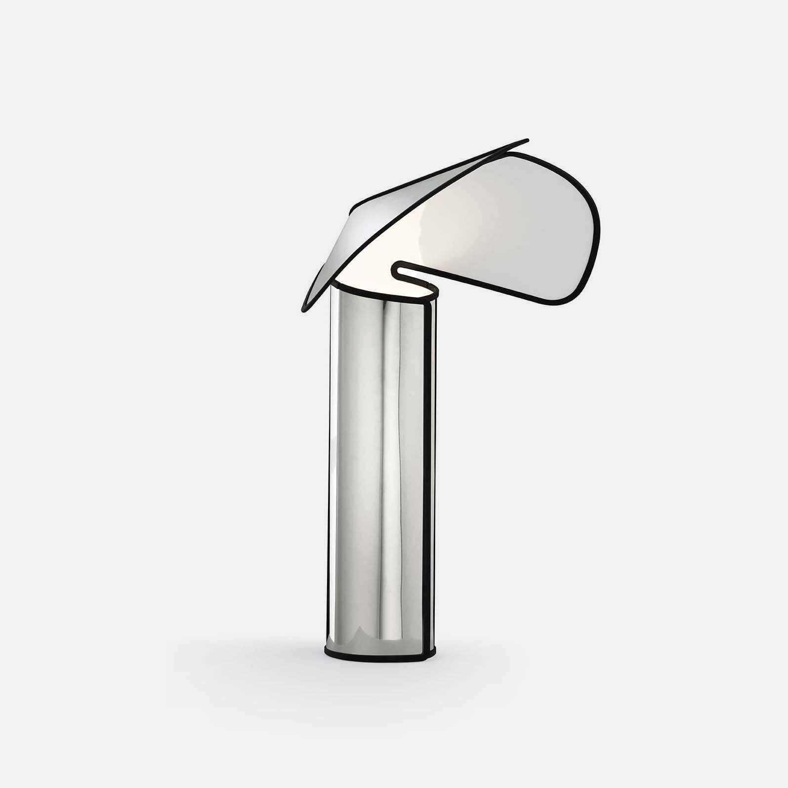Chiara Table ble designet av Mario Bellini i 1969 for merket Flos. Bordlampen er laget av ett stykke laserskåret, rustfritt stål, og består av en sylindrisk lampefot med en buet skjerm. LED-lyskilden er plassert i lampefoten, noe som gir både et pent design og en kul effekt når den lyser opp skjermen som sprer et vakkert lys. Chiara Table kommer i tre farger der alle varianter har en gummikant som gir lampen et kontrasterende design. Velg mellom aluminium med svart gummikant, mørkegrå med olivengrønn gummikant eller roségull med oksidert rød gummikant. Lampen blir et unikt design uansett hvor den plasseres, og kan forgylle både bokhyller og vinduskarmer. Serien inkluderer også en gulvlampe, Chiara Floor, i samme design.