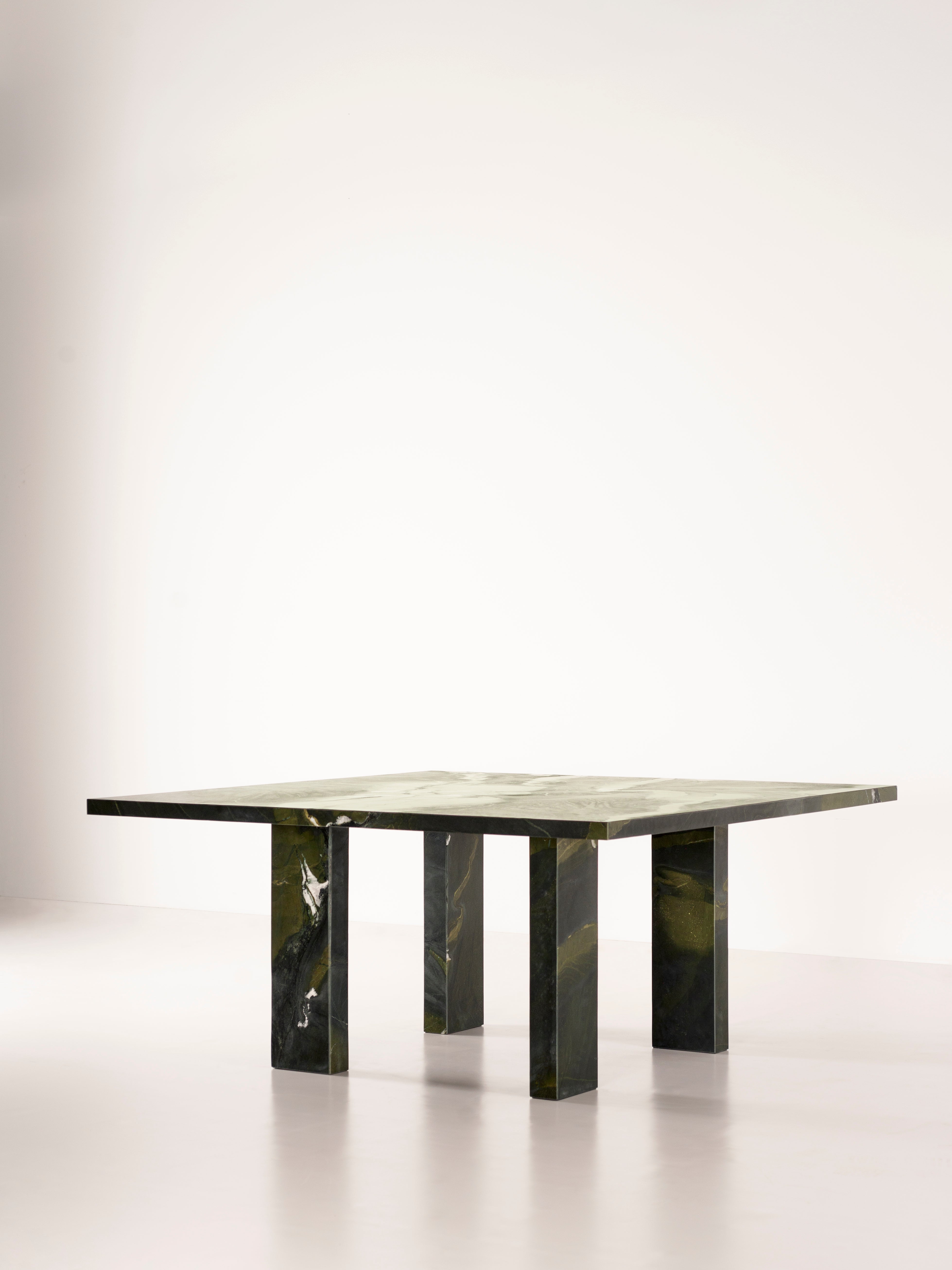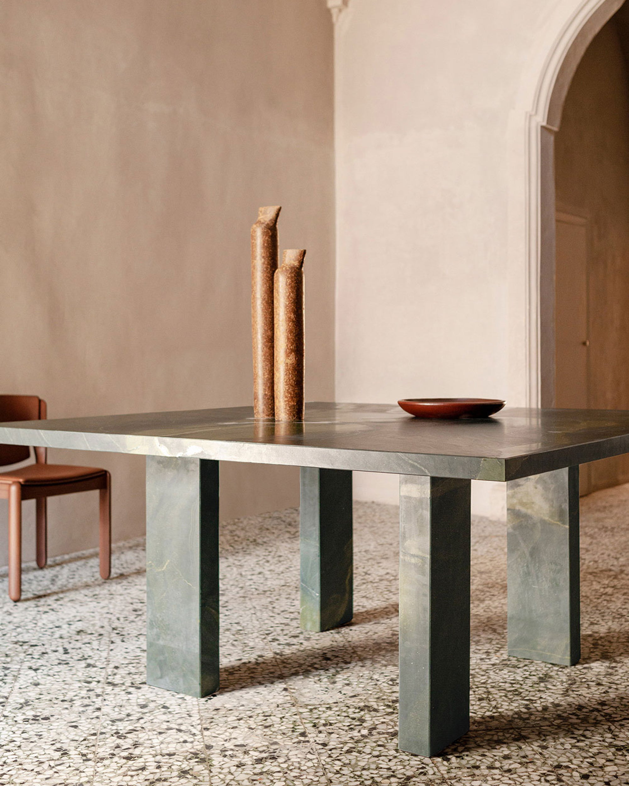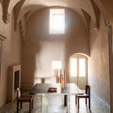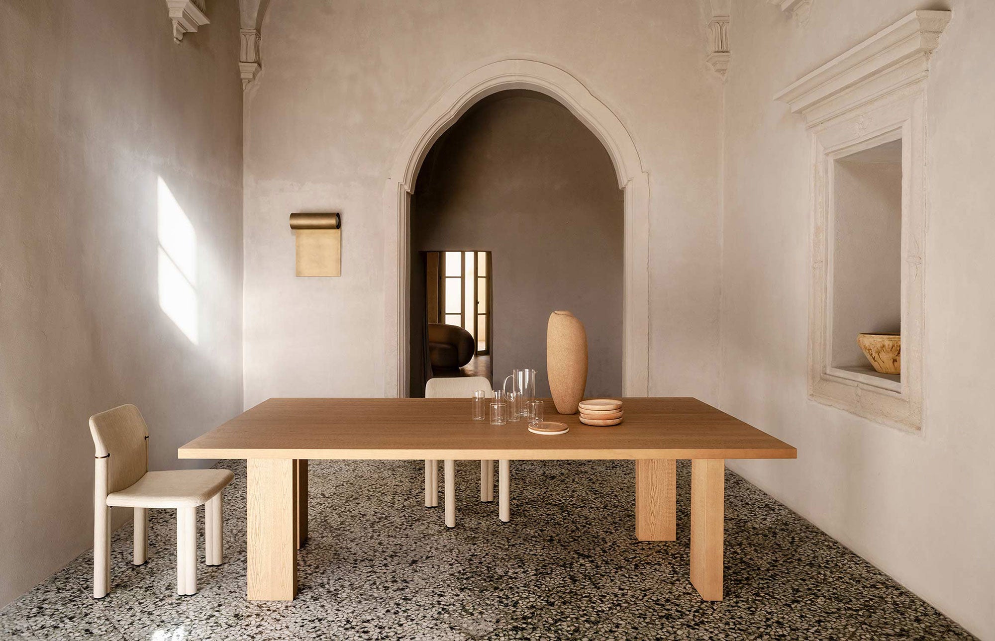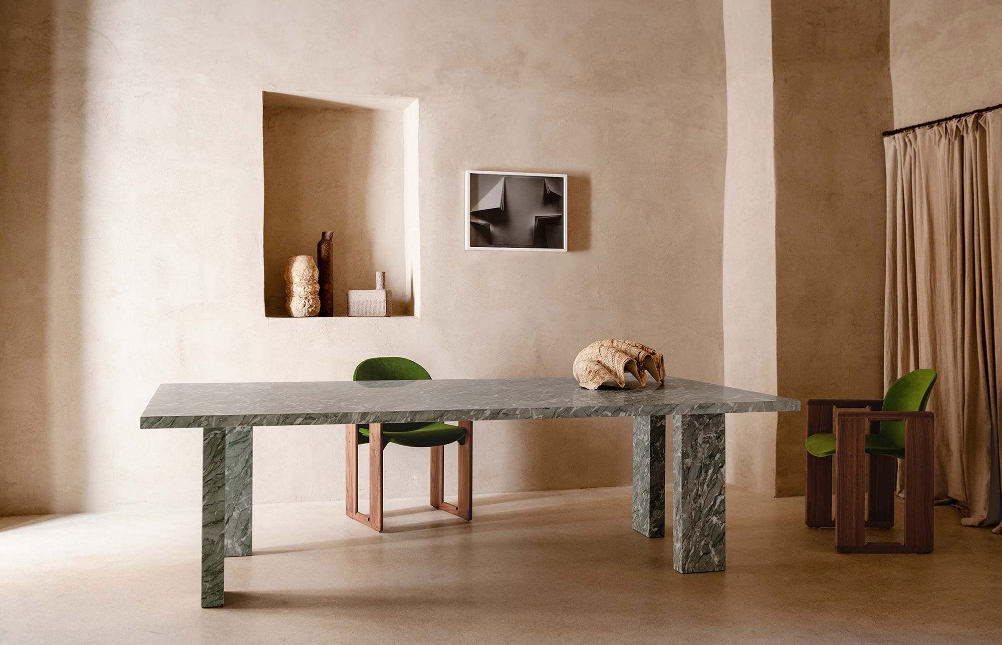 Enkelt og monumentalt, Clockwise er et klassiskt spisebord med en vri med benas posisjon og vekslingen mellom deres plassering i hjørnene bordplaten. Født fra det første samarbeidet mellom Tacchini og designer Michael Anastassiades, er dette et bord med en viktig tilstedeværelse, som samtidig fremkaller en følelse av letthet i bena som jager hverandre nesten dansende, roterende rundt en koreografi som antyder den rette dansen trinn for å oppleve det fullt ut. I ulike rytmer, etter metaforen til en gest, kan bevegelsene og aktivitetene som foregår rundt bordet dermed fortelles fra tid til annen uventet, like flytende og uformelle som miljøene selve bordet kan plasseres i.
