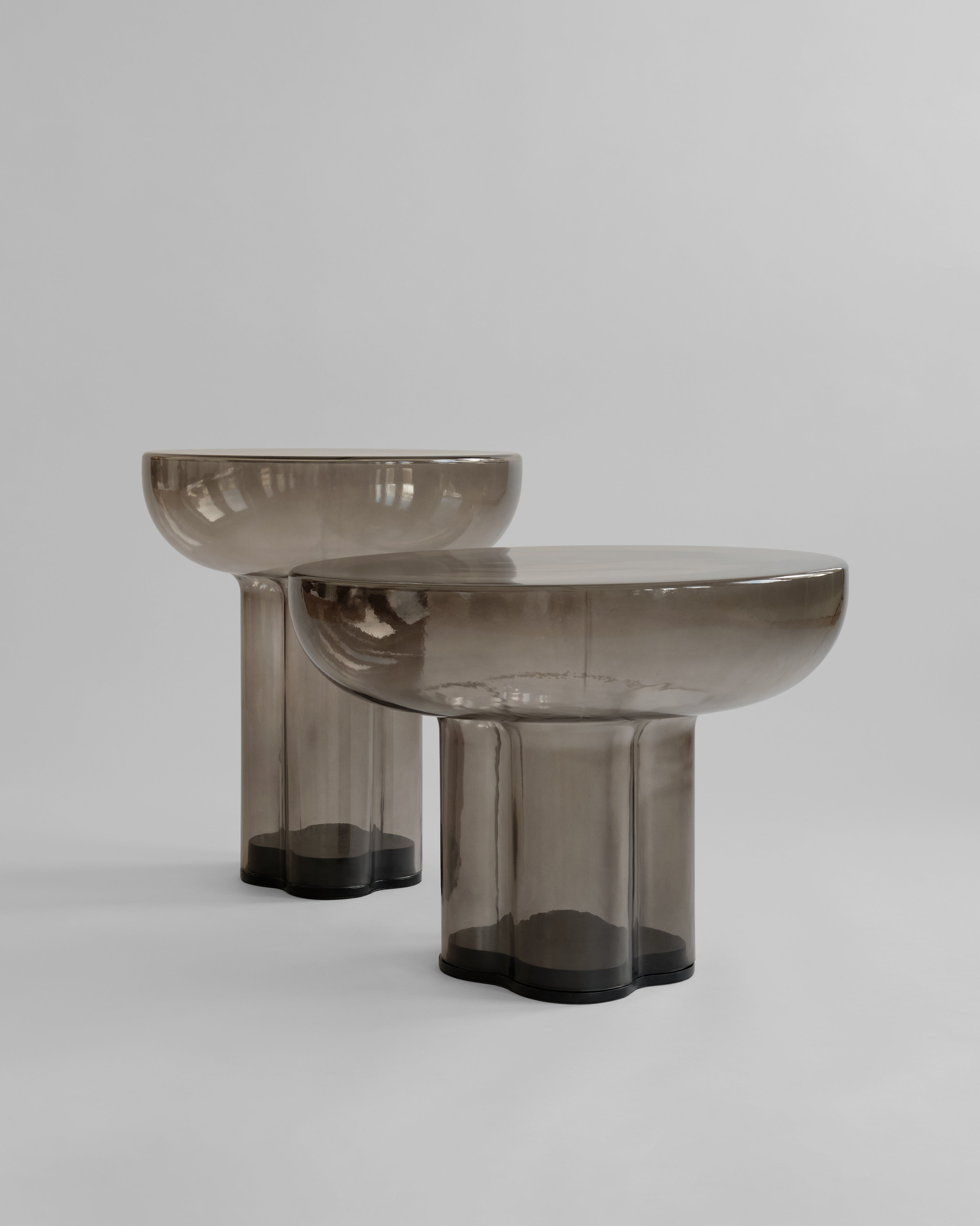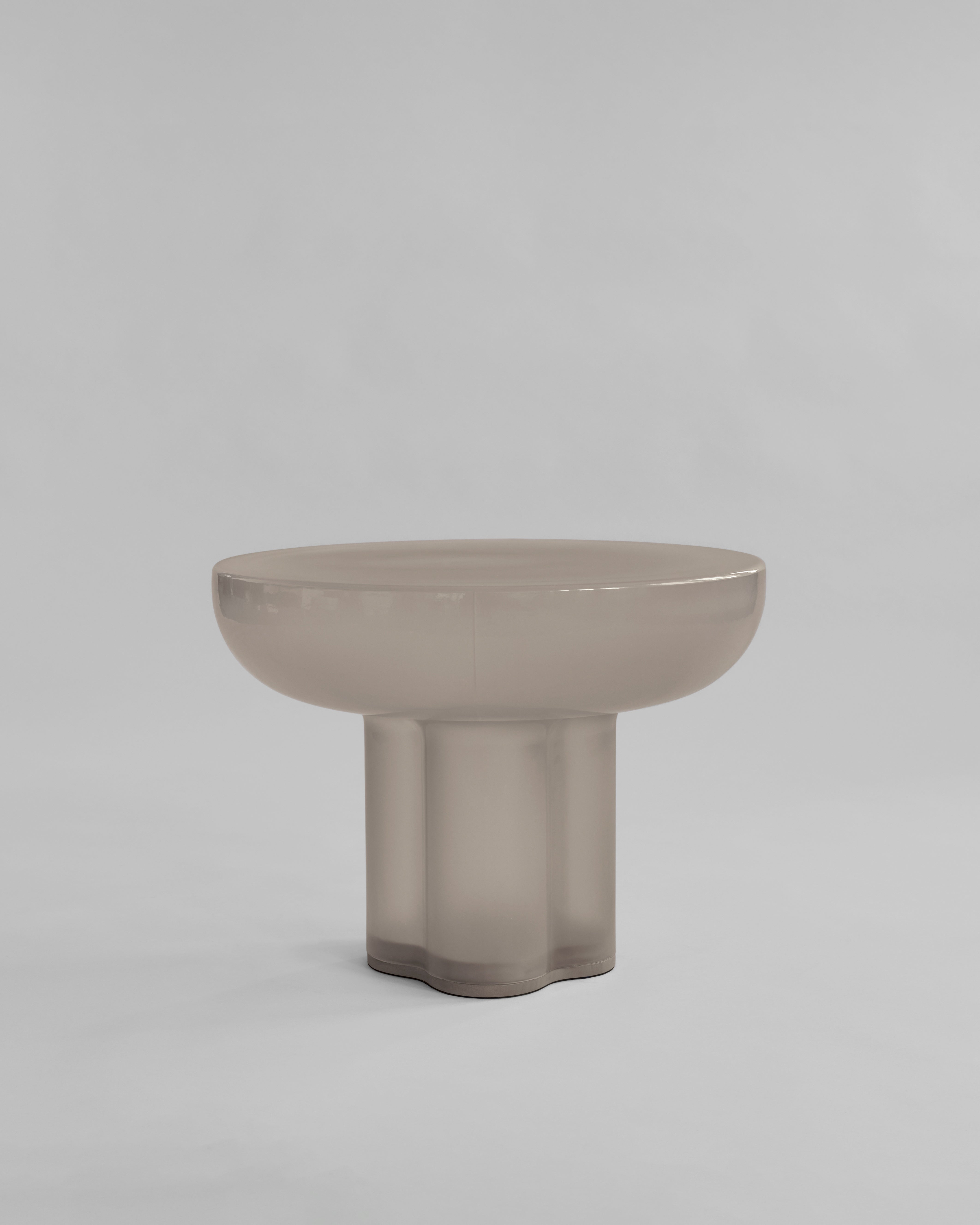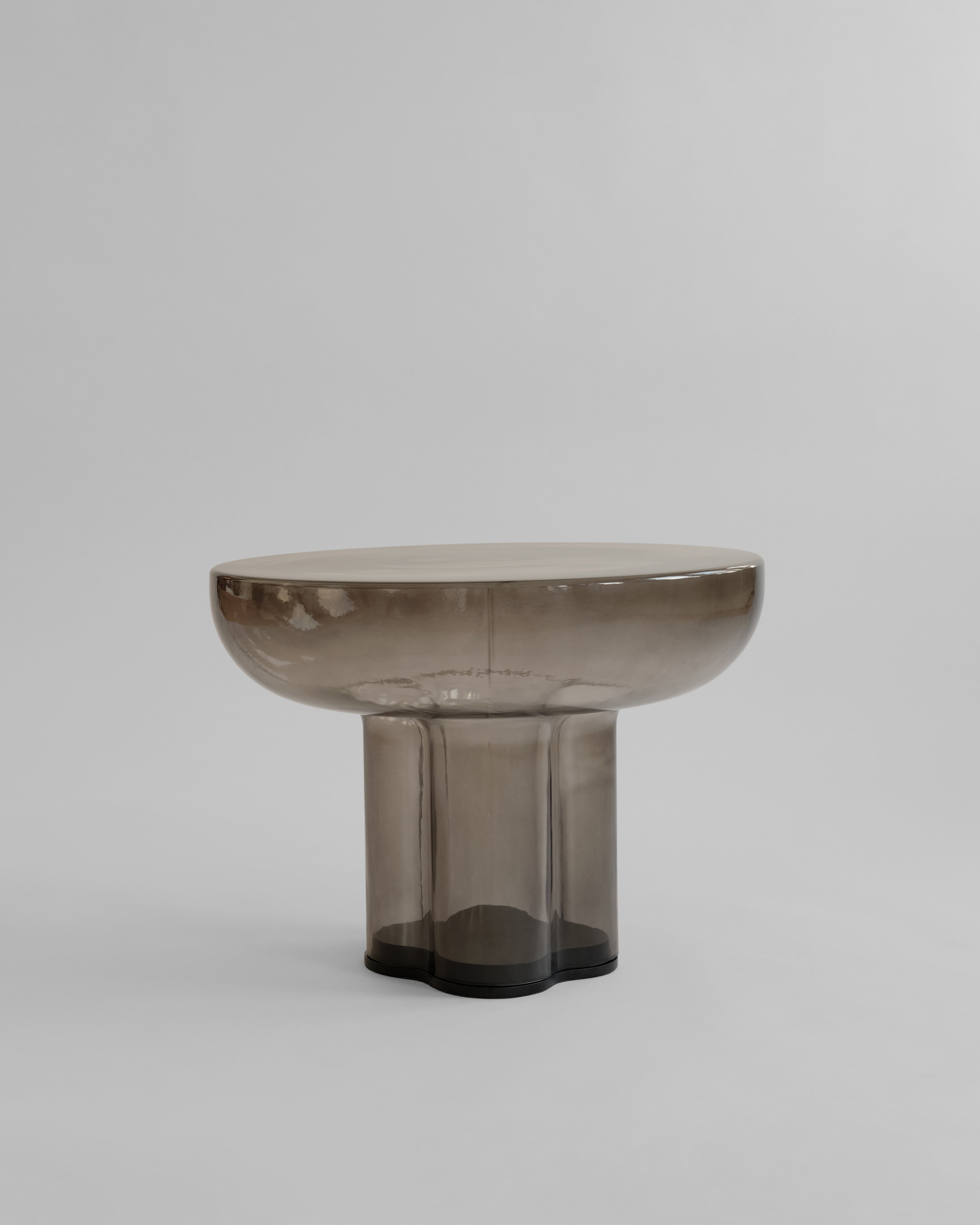 Der tidløs eleganse møter arkitektonisk inspirasjon i munnblåst glass. Hvert bord er et unikt, skulpturelt kunstverk med en rund bordplate støttet av fire sammensmeltede, sylindriske ben. Inspirert av de rå formene fra brutalistisk arkitektur, fremhever designet skjønnheten i søyler samtidig som det omfavner minimalistisk estetikk.