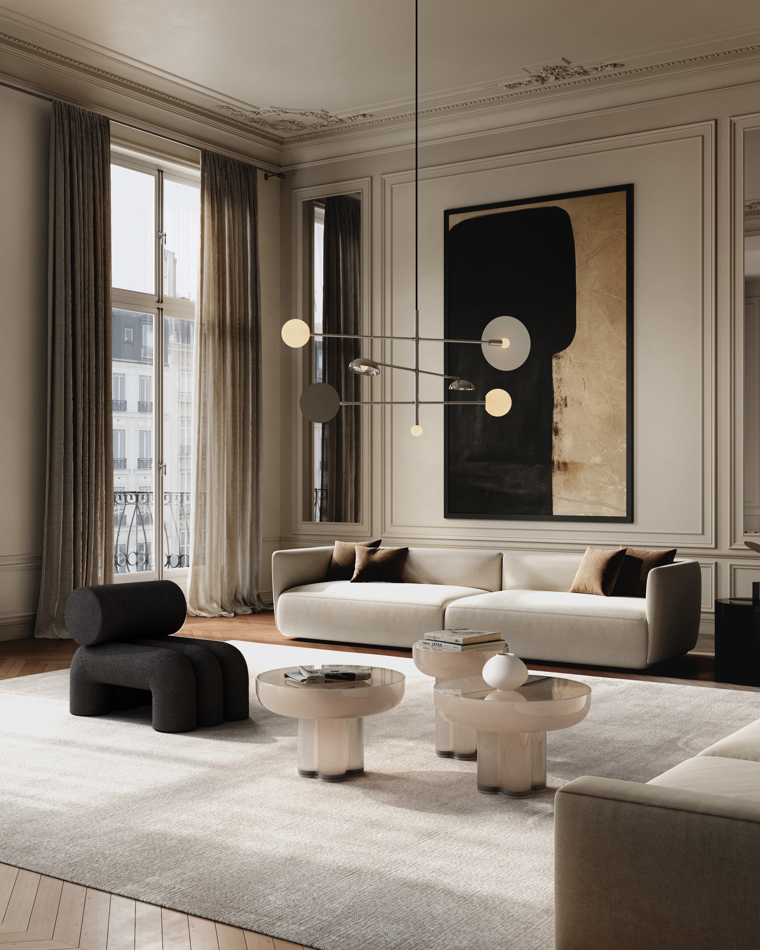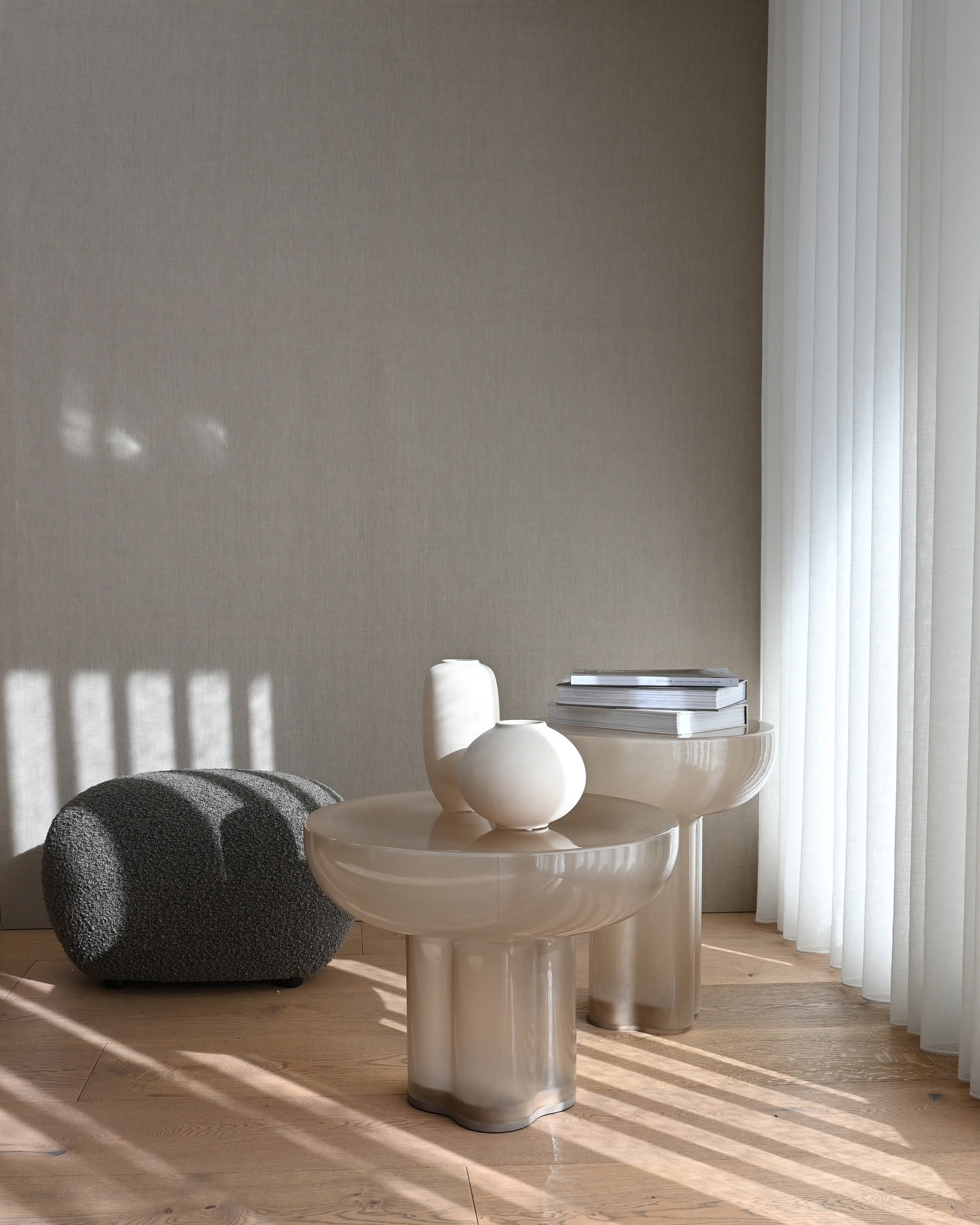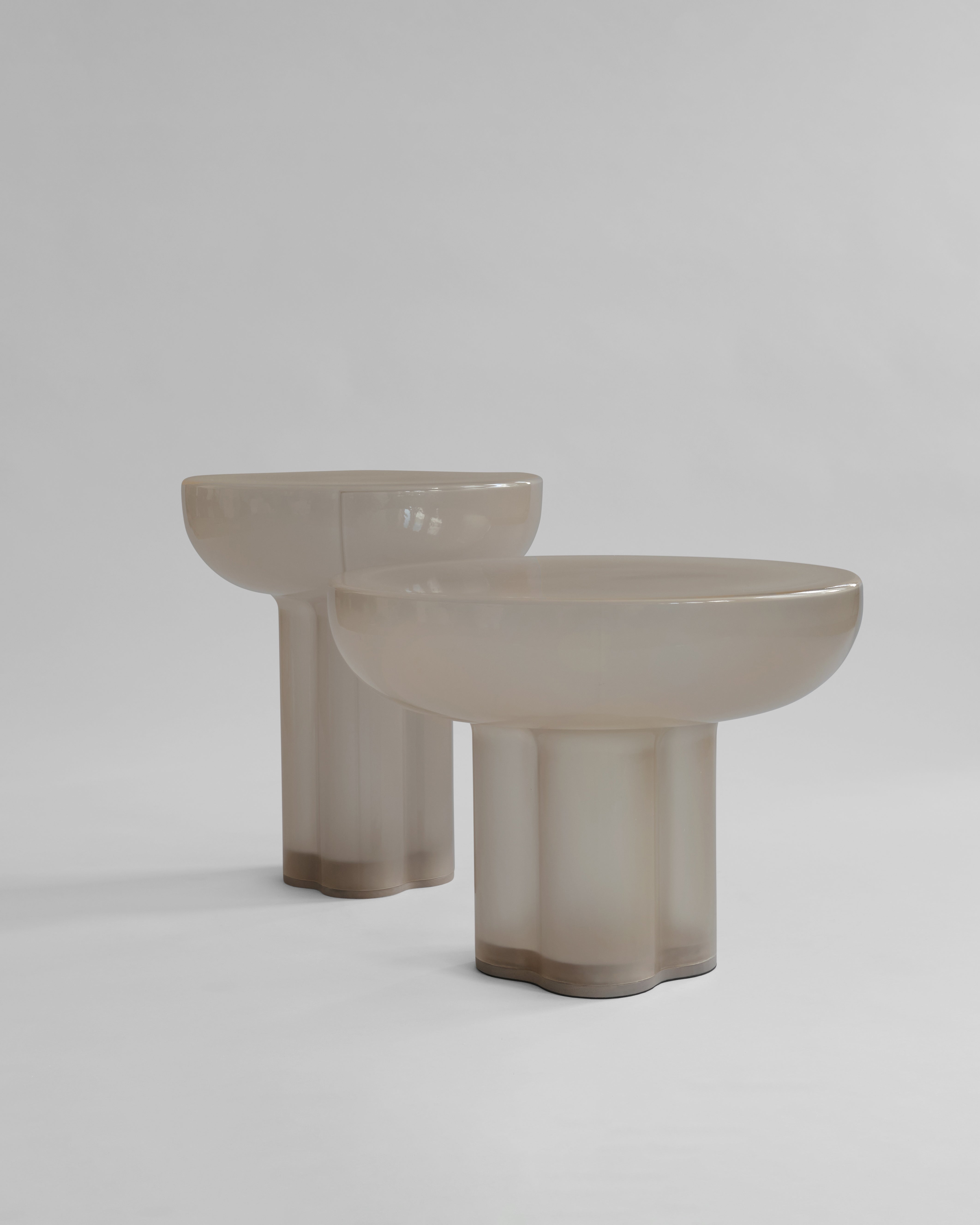 Der tidløs eleganse møter arkitektonisk inspirasjon i munnblåst glass. Hvert bord er et unikt, skulpturelt kunstverk med en rund bordplate støttet av fire sammensmeltede, sylindriske ben. Inspirert av de rå formene fra brutalistisk arkitektur, fremhever designet skjønnheten i søyler samtidig som det omfavner minimalistisk estetikk.