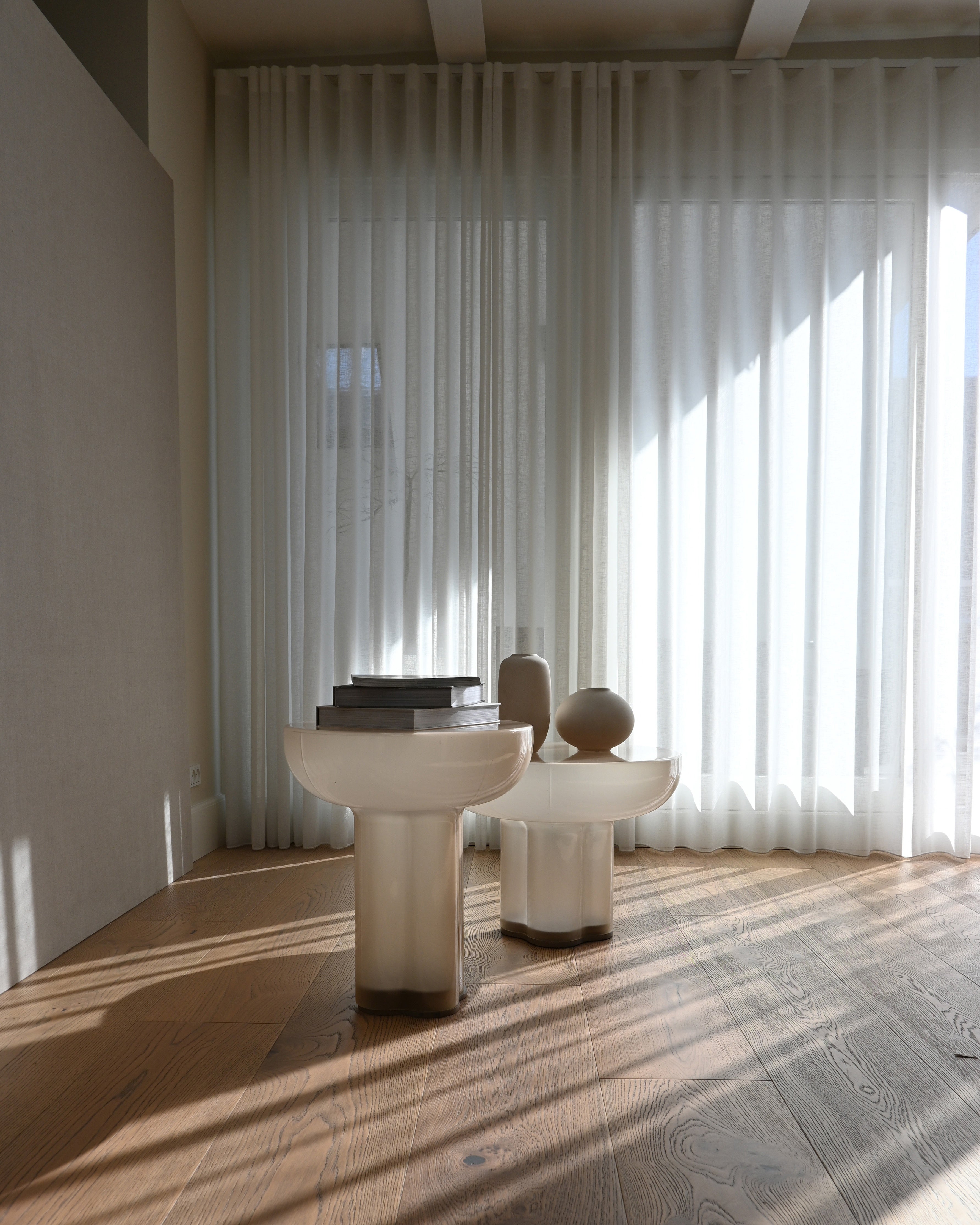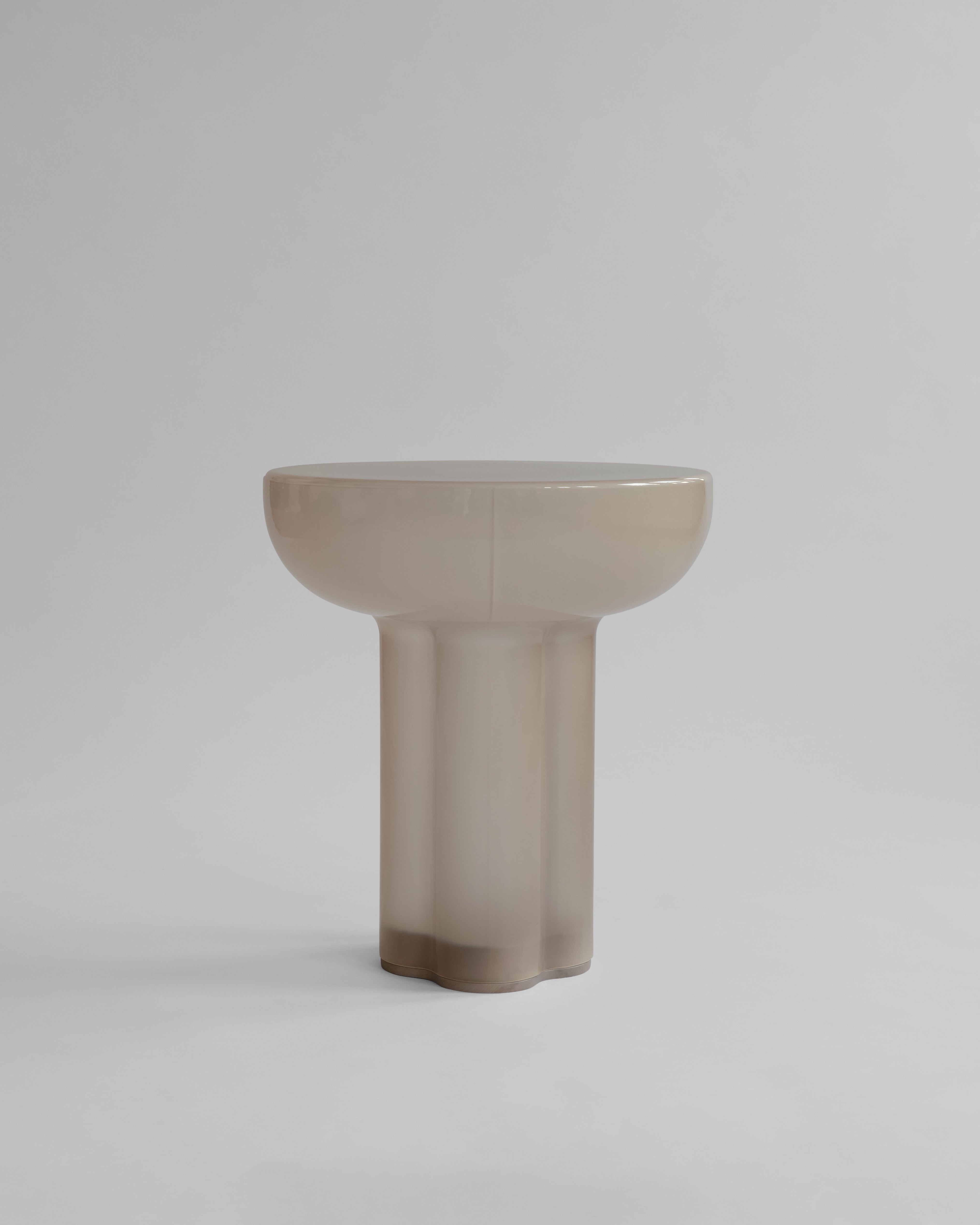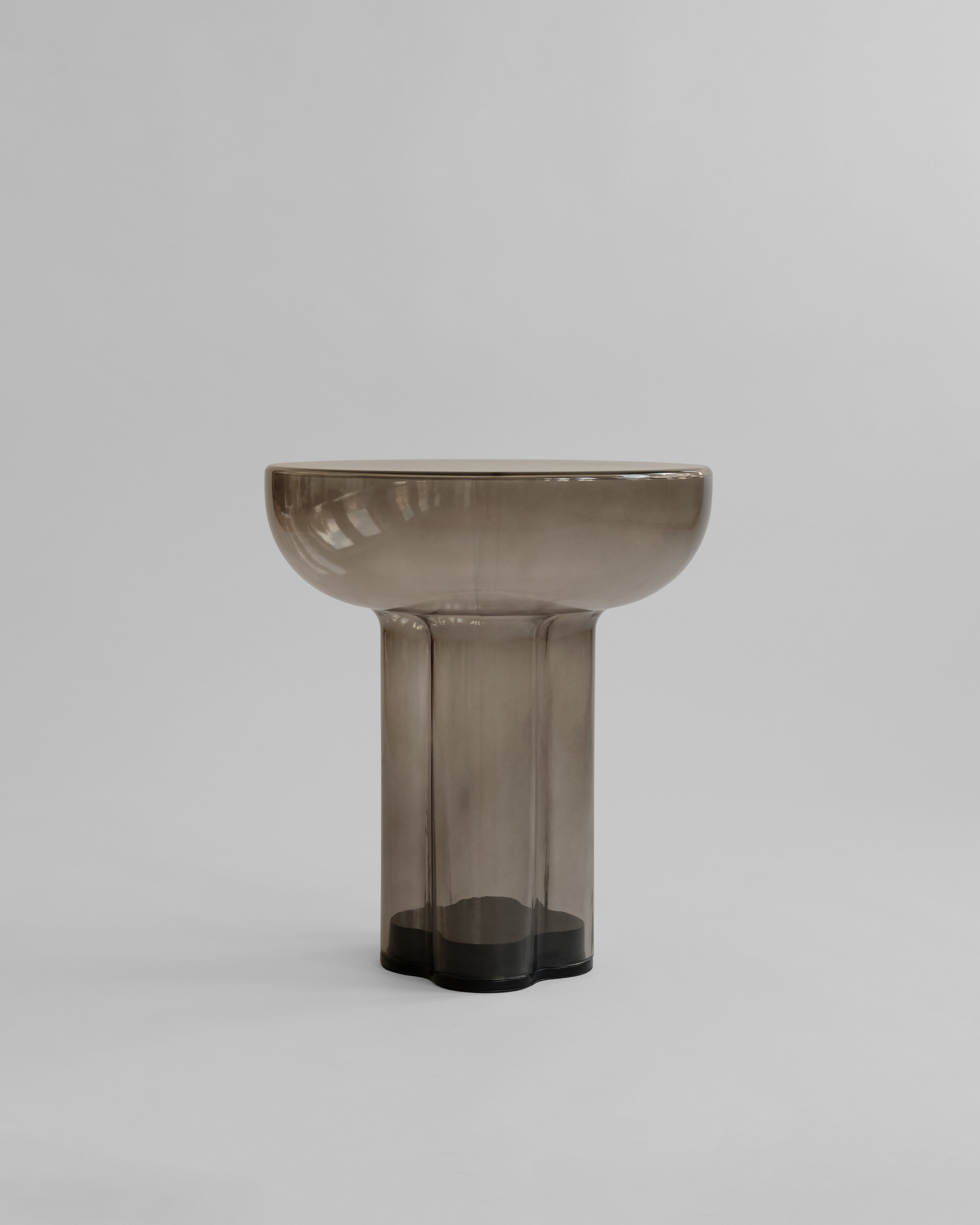 Der tidløs eleganse møter arkitektonisk inspirasjon i munnblåst glass. Hvert bord er et unikt, skulpturelt kunstverk med en rund bordplate støttet av fire sammensmeltede, sylindriske ben. Inspirert av de rå formene fra brutalistisk arkitektur, fremhever designet skjønnheten i søyler samtidig som det omfavner minimalistisk estetikk.