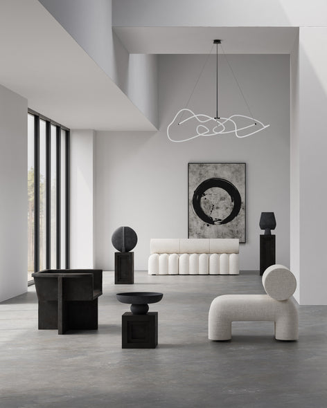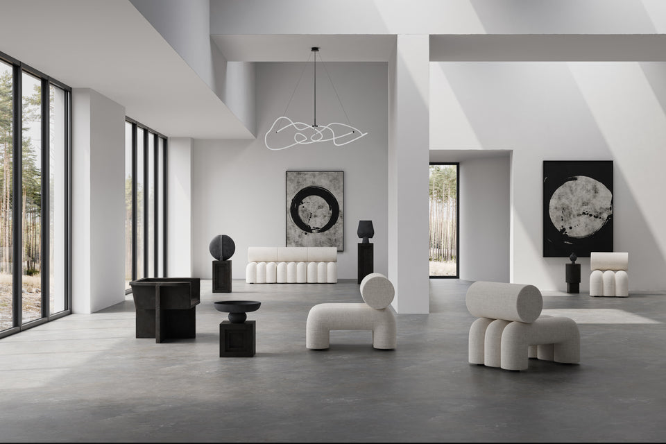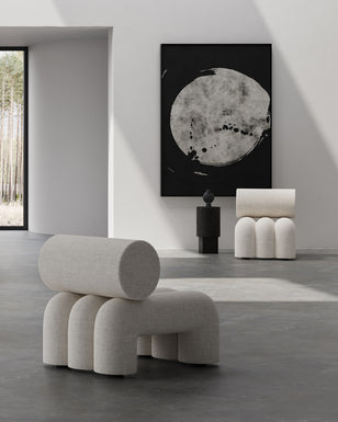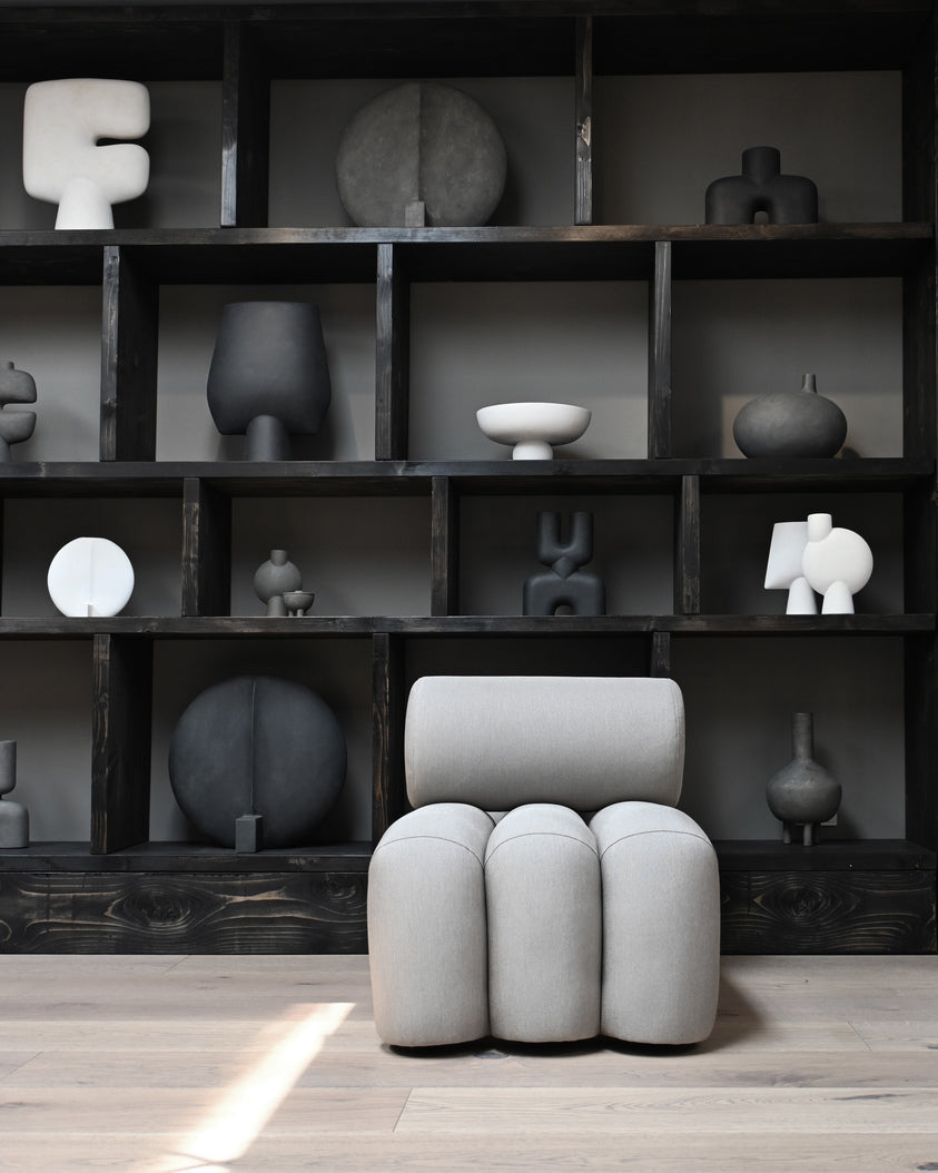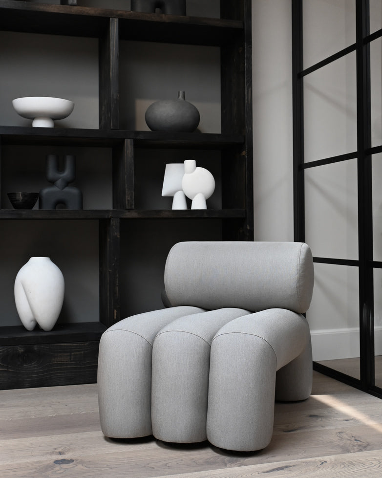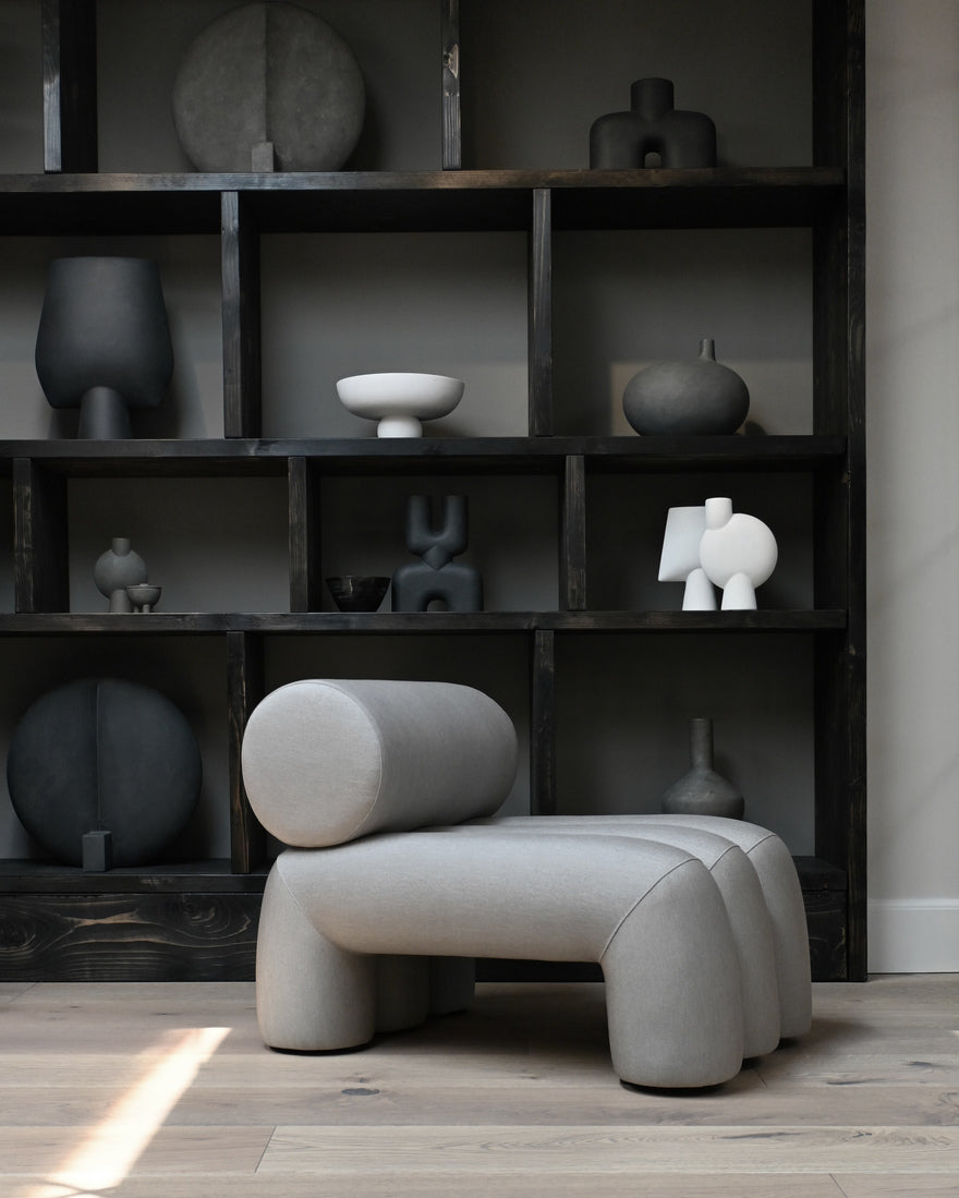 Inspirert av formene til tradisjonelle japanske hageredskaper, er Foku en loungestol med full polstring laget av enkle geometriske former slått sammen til et skulpturelt møbeldesign.