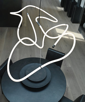Ghost Chandelier er inspirert av minimalismekunst og handler om å kombinere lys og skulpturer til grafisk lysdesign. Ghost er preget av et lysende hvitt akrylrør som løper i forskjellige retninger for å skape et organisk system av omgivelseslys.