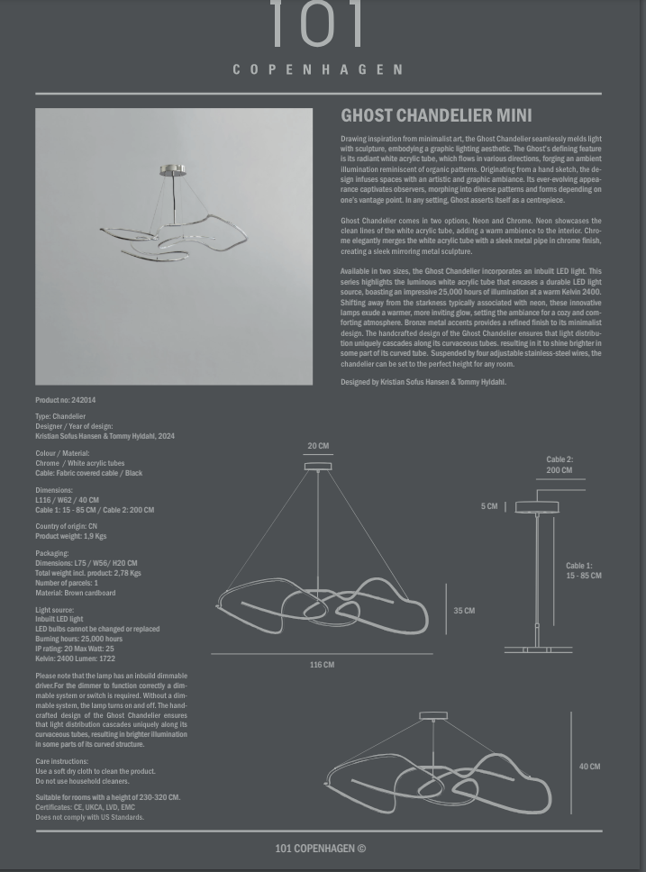 Ghost Chandelier er inspirert av minimalismekunst og handler om å kombinere lys og skulpturer til grafisk lysdesign. Ghost er preget av et lysende hvitt akrylrør som løper i forskjellige retninger for å skape et organisk system av omgivelseslys.