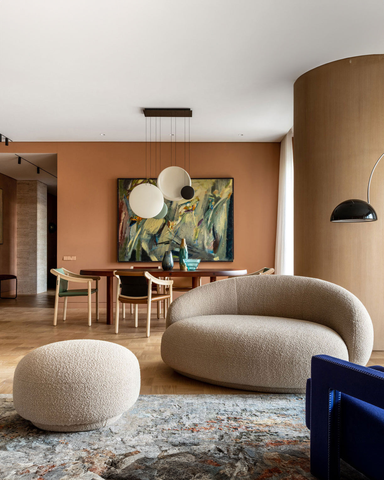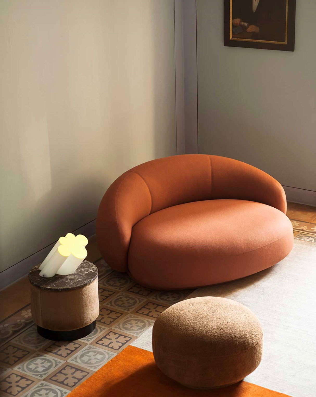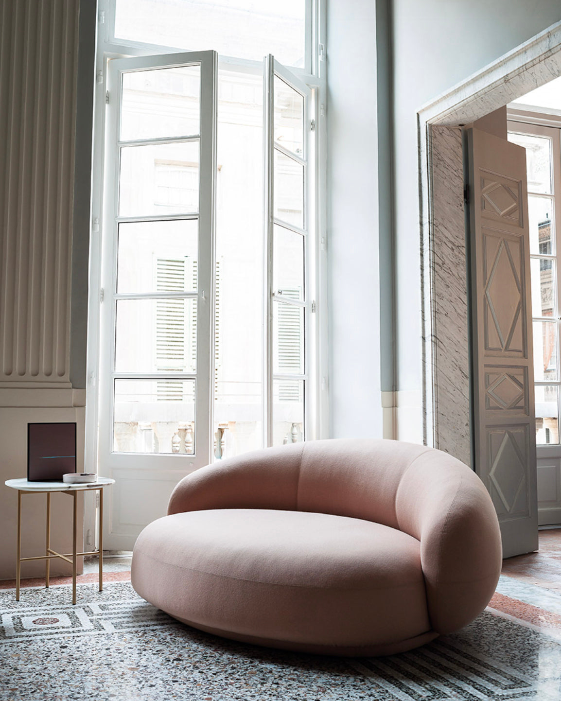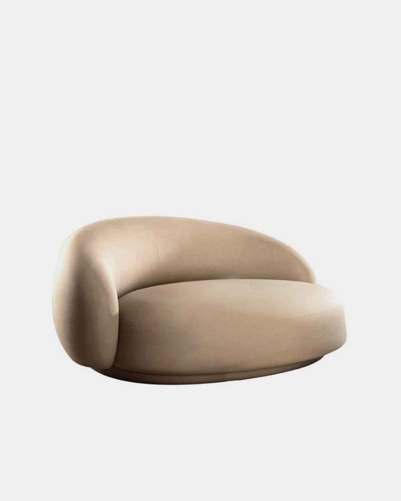 Julep Island Sofa fra Tacchini kjennetegnes av sine myke, generøse avrundede linjer og omsluttende former. Julep er inspirert av avantgarde-bevegelsen fra 1950-tallet, og kombinerer enkelhet og storhet med et moderne, romantisk og feminint preg. Sofaen er heltrukket i stoff, og setene fremstår både romslige og fyldige, samtidig som den gir en følelse av letthet takket være en base som løfter seg usynlig fra gulvet.