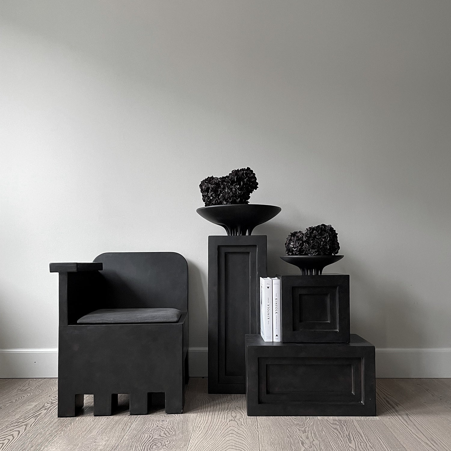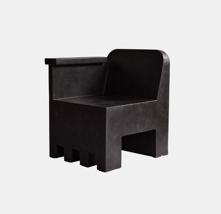 Stolen er støpt i lett fiberbetong, noe som skaper en unik overflatetekstur og øker den generelle mobiliteten til stolen. Hver del er håndmalt for å skape en strukturert og unik overflate. Kamado Chair fremhever den fine balansen mellom skarpe arkitektoniske linjer og japansk estetikk, og er et skulpturelt uttrykk med en overbevisende sittekomfort.