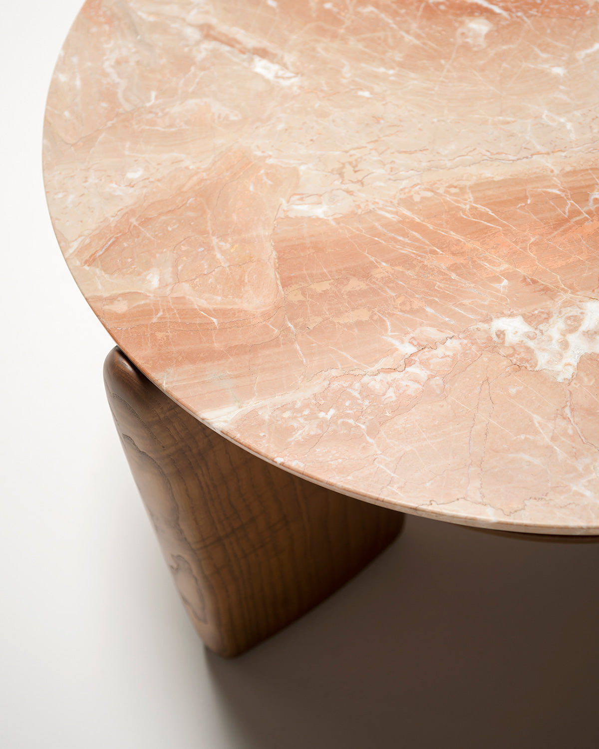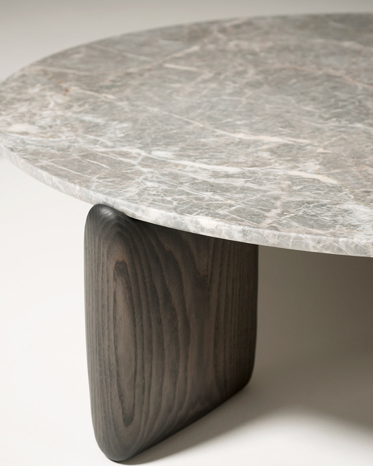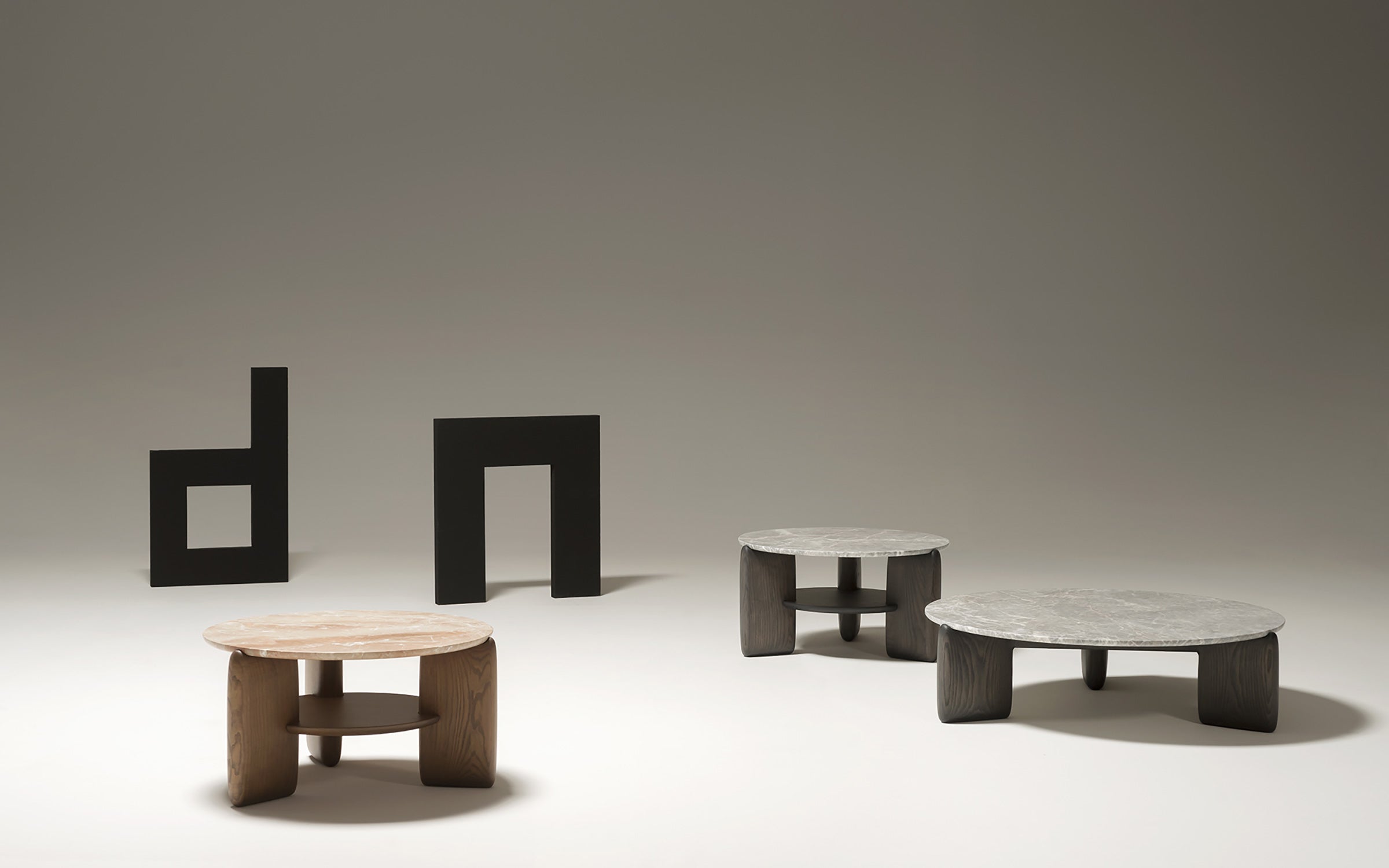 Tunge elementer er knyttet til lettere, som blekkmerker tegnet på et ark for å danne en karakter, en bokstav, et ideogram. Tydelige kontraster av tykkelse oversetter seg til skarpe grafiske uttrykk: For å gi liv til disse umiskjennelige figurene i marmor og asketre, er Monica Forster inspirert av kalligrafi, kunsten å skrive i en elegant og regelmessig form. Bordene finnes i to størrelser og fargevarianter, Breccia Bresciana med valnøttbeiset struktur for en varm og delikat finish, Fior di Pesco Carsico med mørkegrå struktur for mer avgjørende og stringente toner.