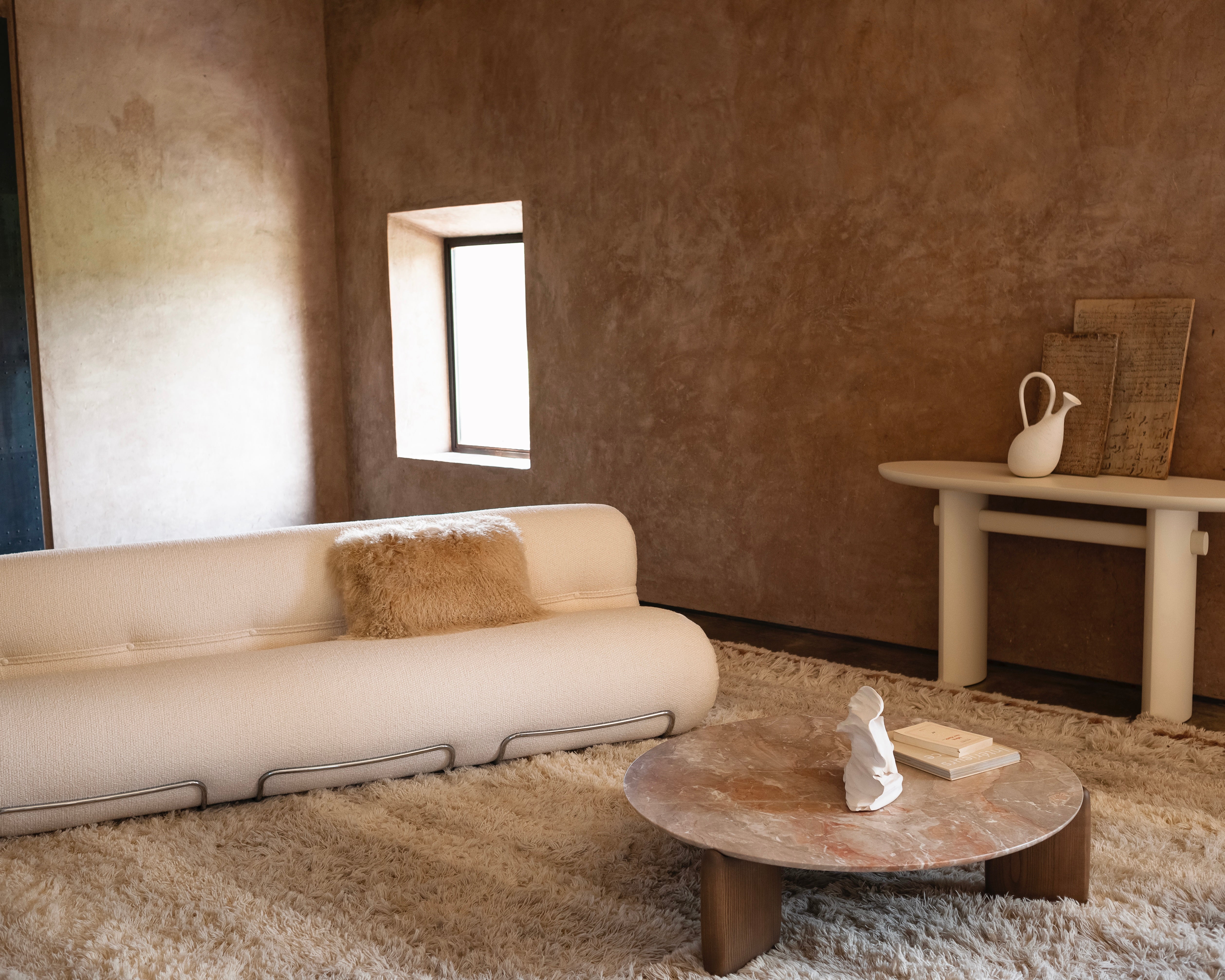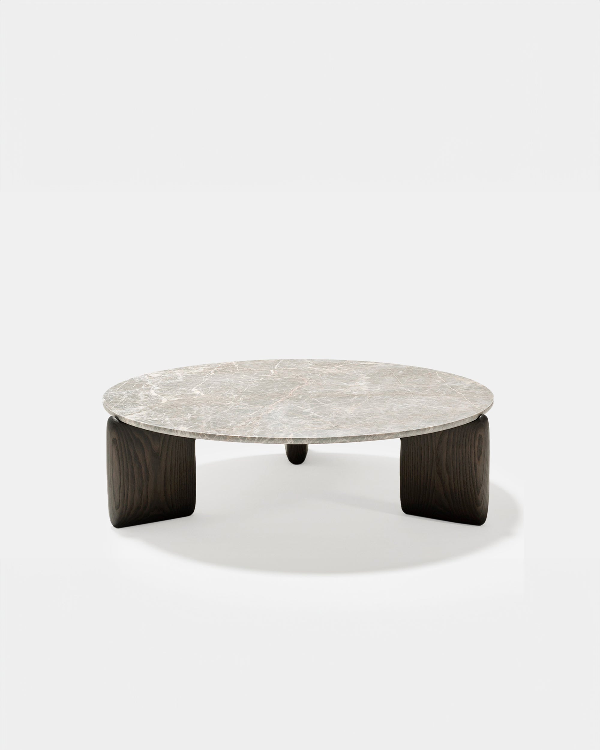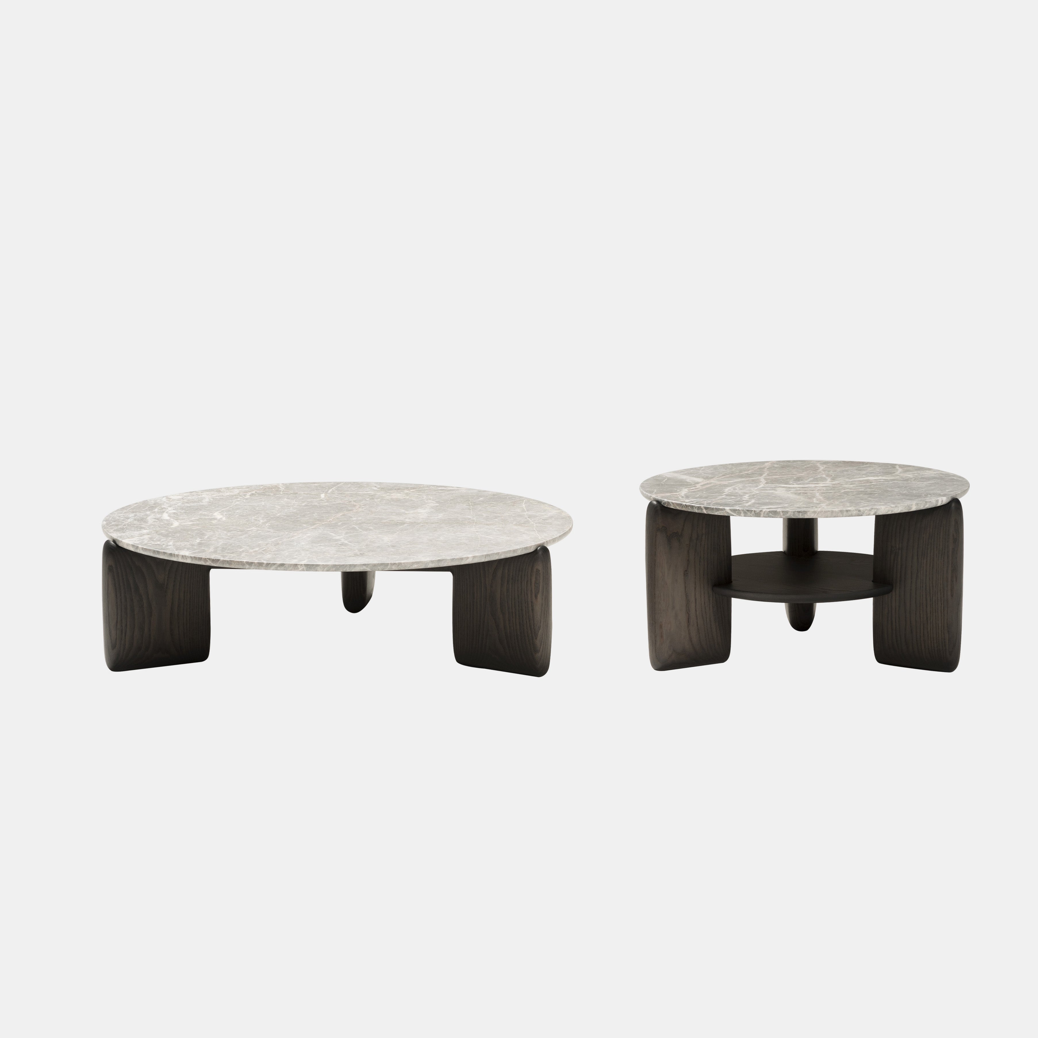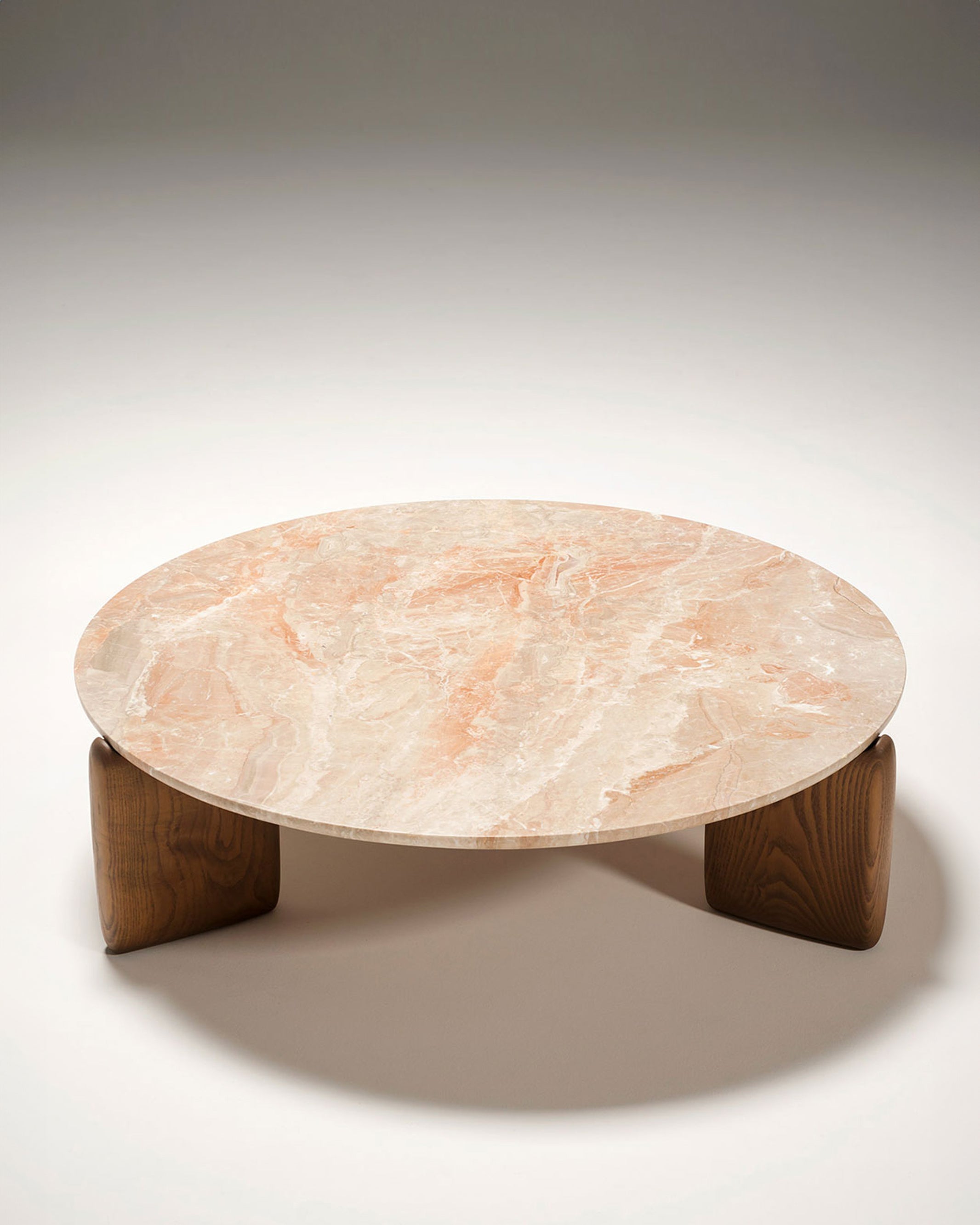 Tunge elementer er knyttet til lettere, som blekkmerker tegnet på et ark for å danne en karakter, en bokstav, et ideogram. Tydelige kontraster av tykkelse oversetter seg til skarpe grafiske uttrykk: For å gi liv til disse umiskjennelige figurene i marmor og asketre, er Monica Forster inspirert av kalligrafi, kunsten å skrive i en elegant og regelmessig form. Bordene finnes i to størrelser og fargevarianter, Breccia Bresciana med valnøttbeiset struktur for en varm og delikat finish, Fior di Pesco Carsico med mørkegrå struktur for mer avgjørende og stringente toner.